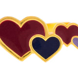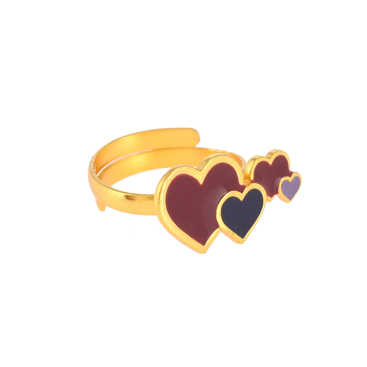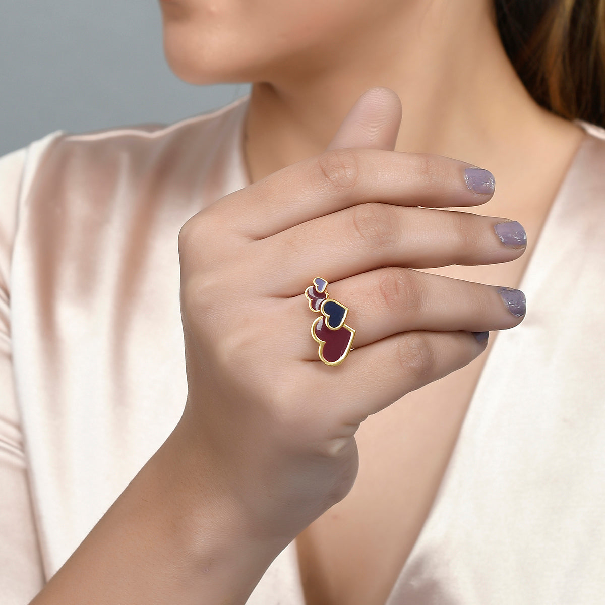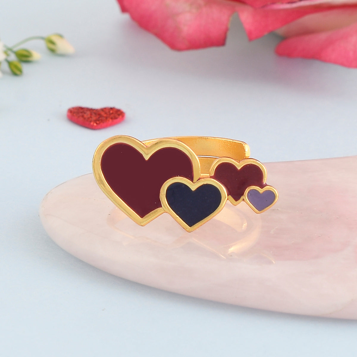 Adjustable enamelled hearts gold plated ring. Fashioned out of brass. A good V Day gifting option.