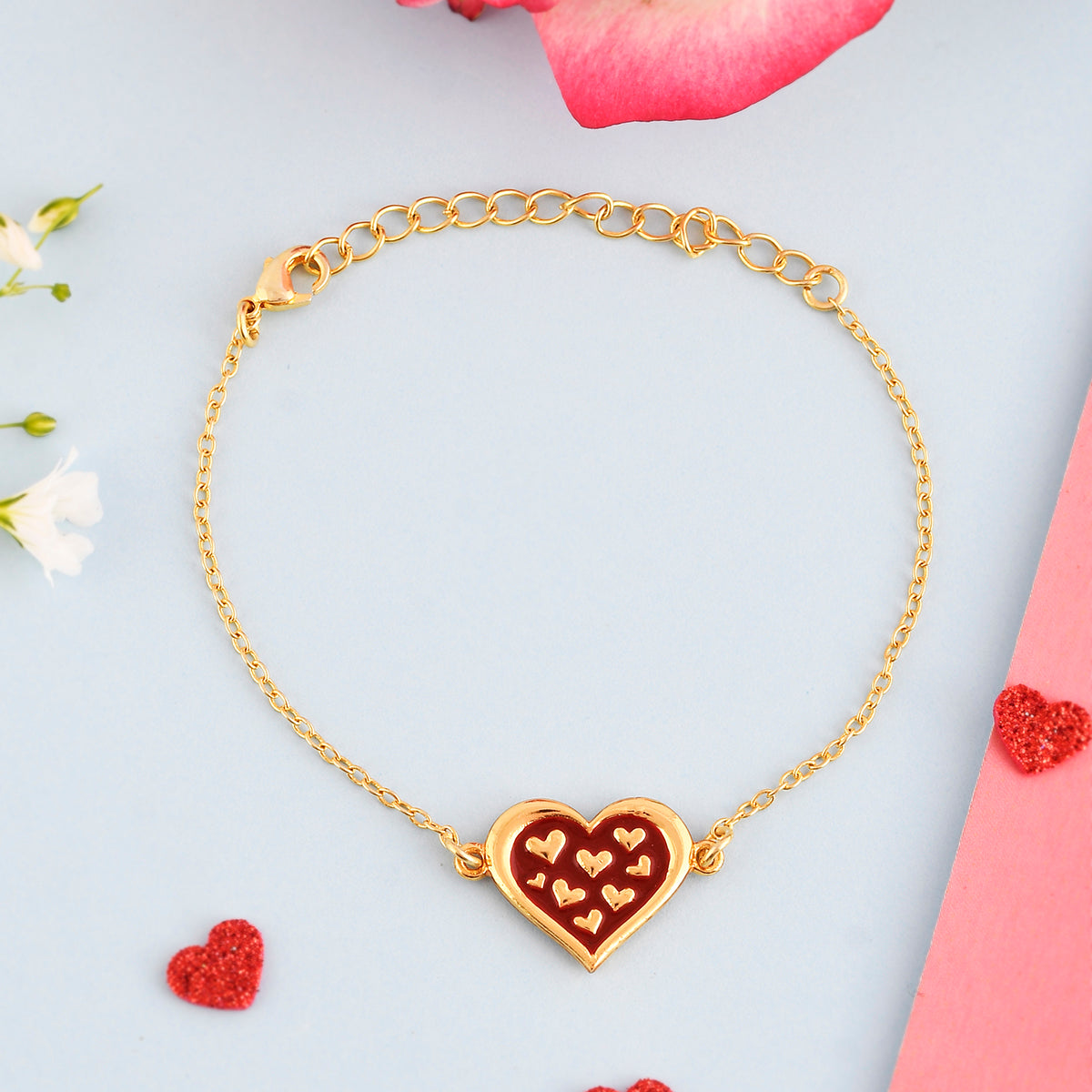 Hearts in heart enamelled chain bracelet with charming yellow gold plating. Made from brass and a good match for all kinds of V Day looks.