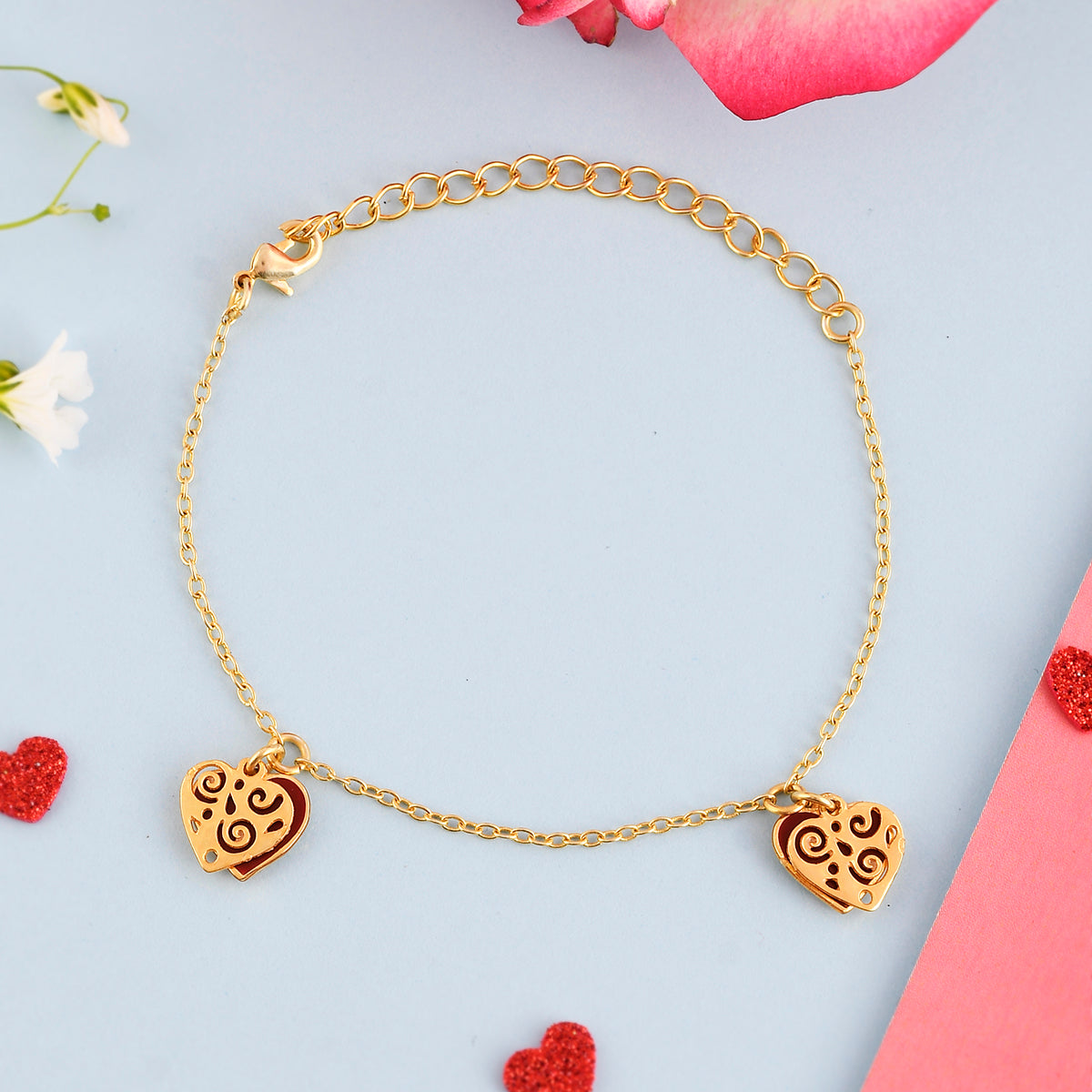 Peek-a-boo chain bracelet featuring enamelled red heart and cutwork design. Gold plated and made from brass. Pair with Valentine's Day looks of all kinds.