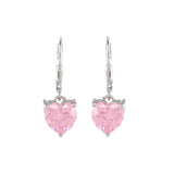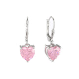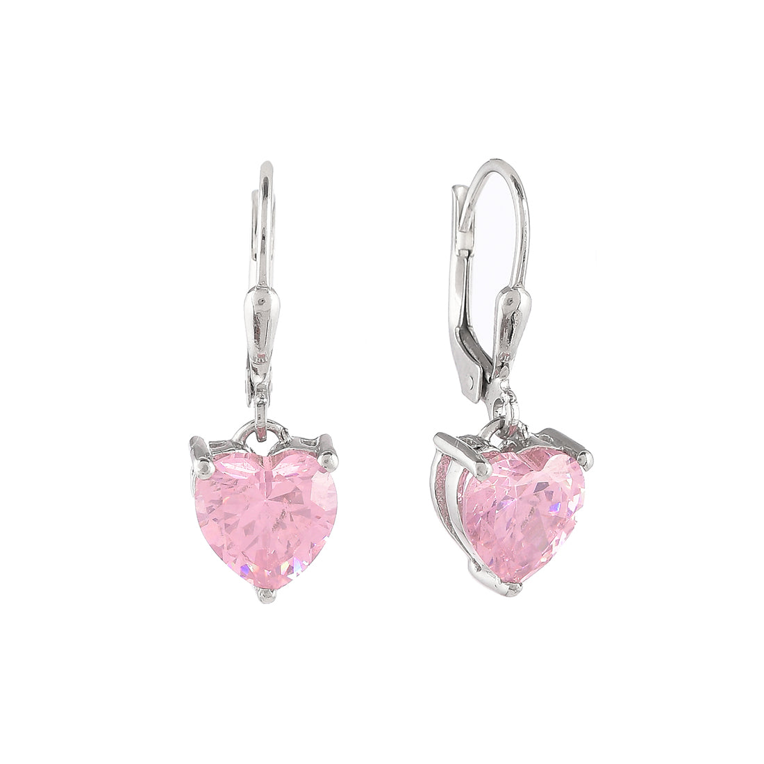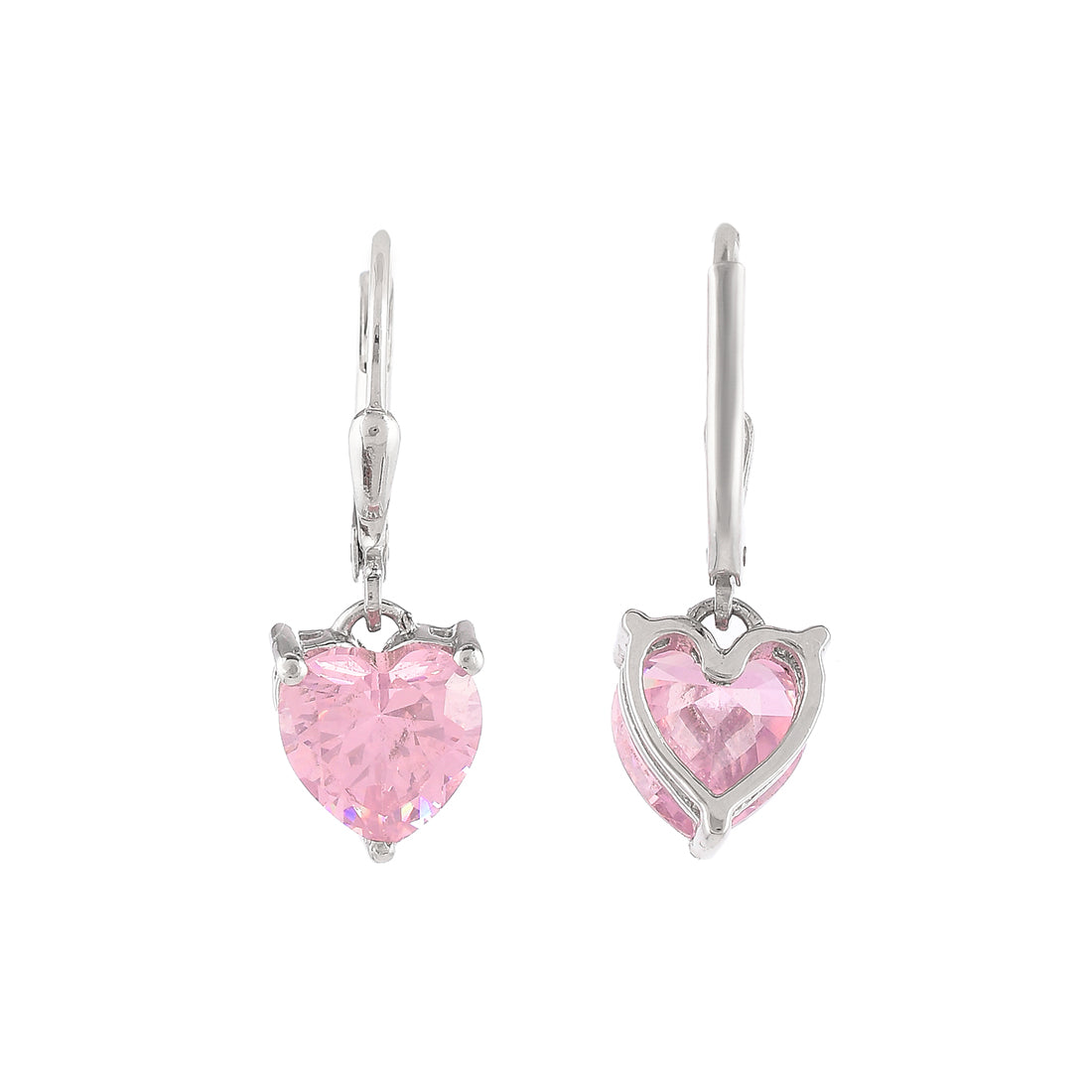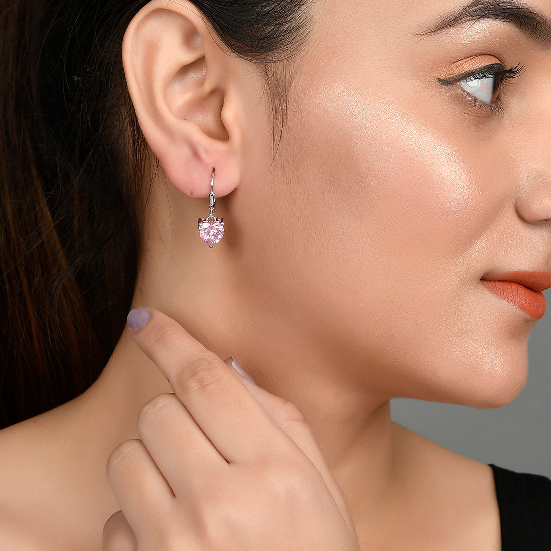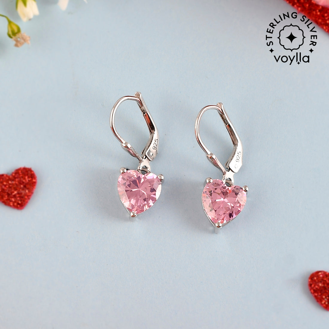 Classic heart shaped pink zirconia gemstone adorned sterling silver huggie earrings with white rhodium plating. The comfortable and lightweight earrings can be paired with looks and outfits of all kinds.