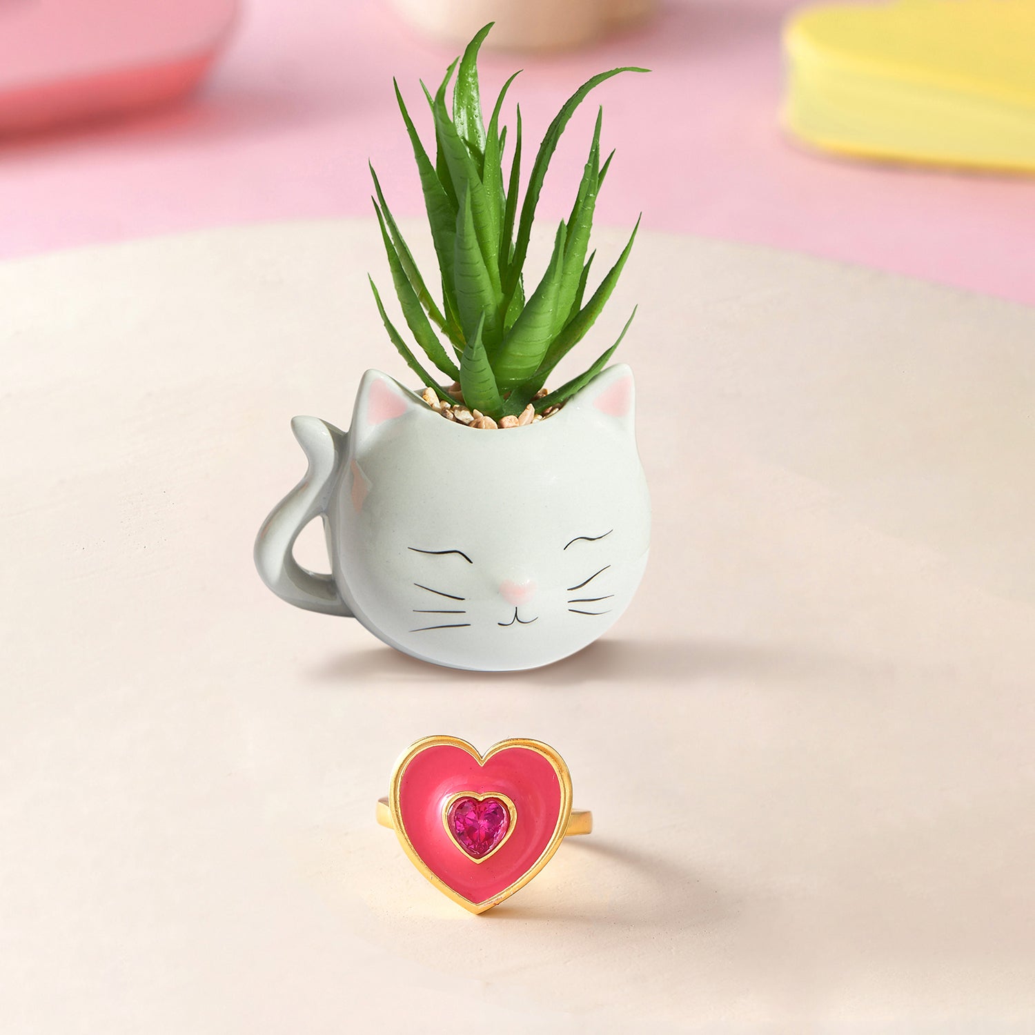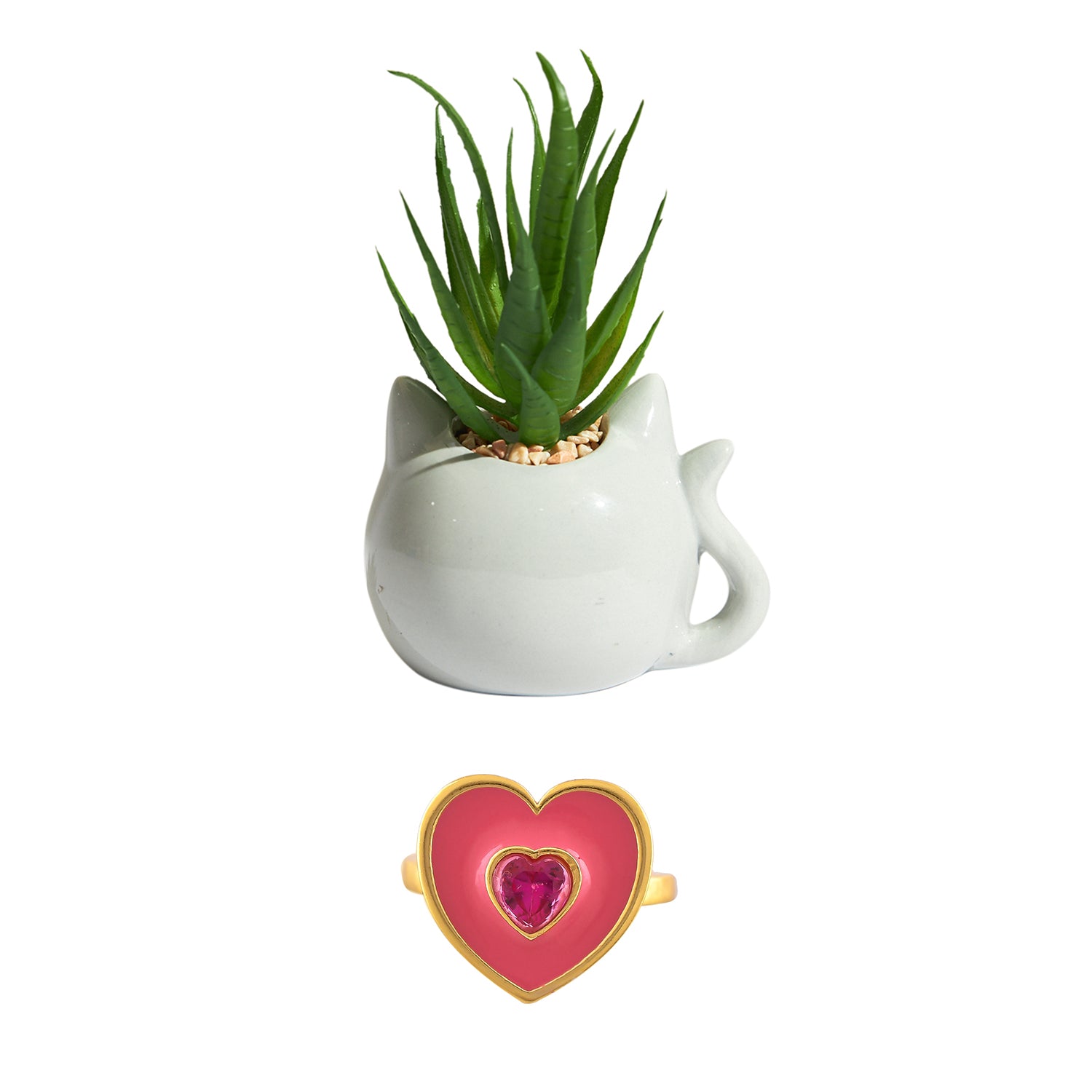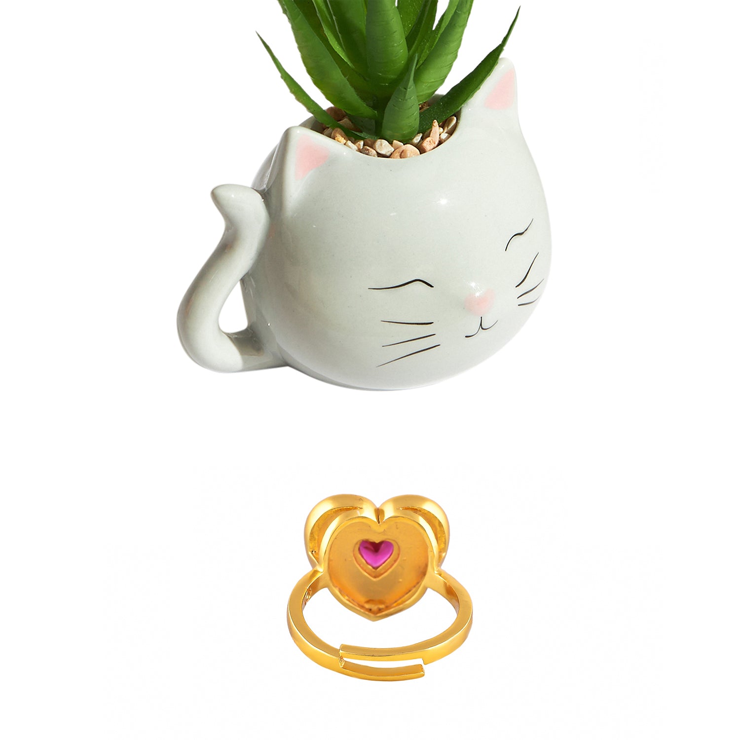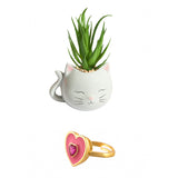 Pink Heart Ring With Blushing Cat Planter Combo