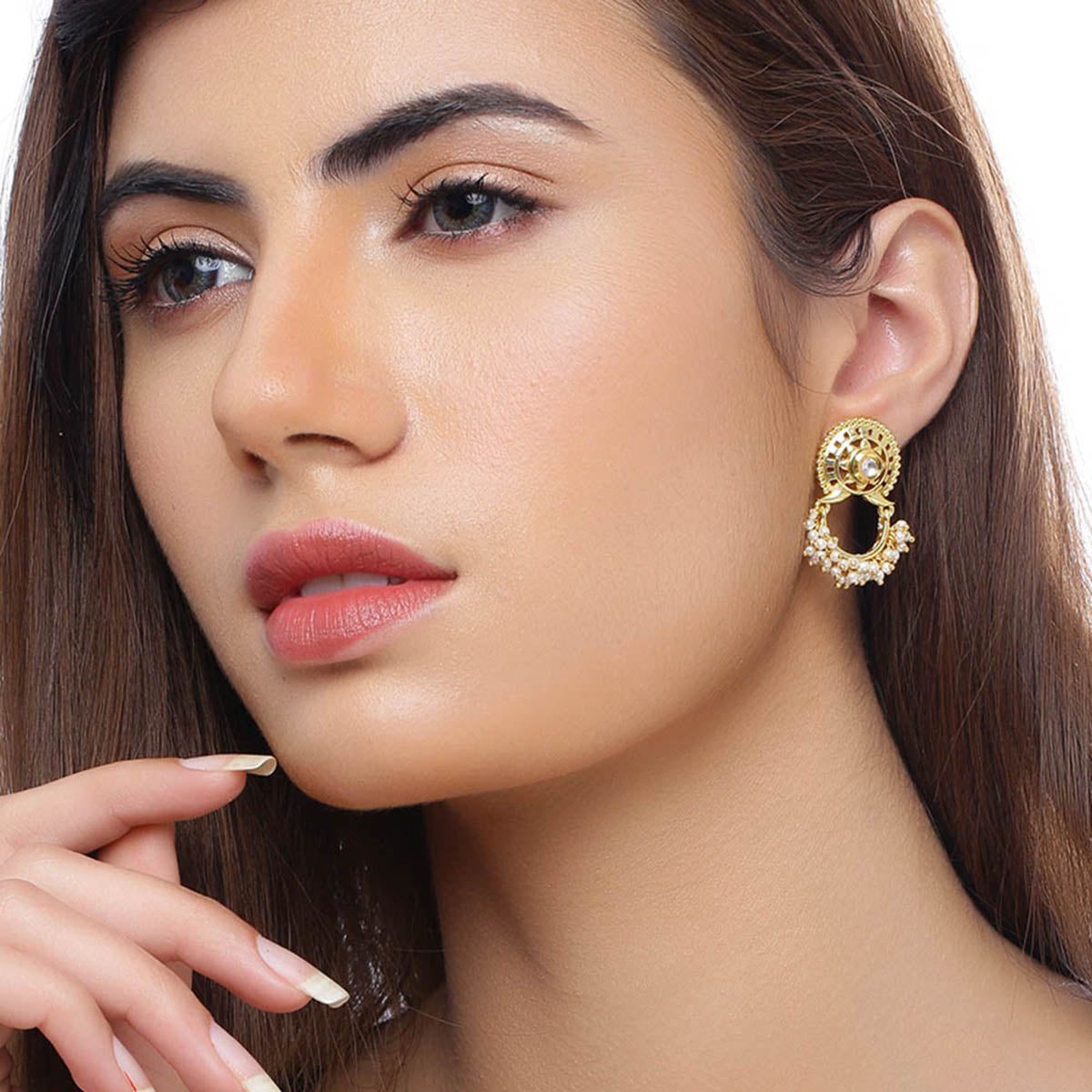 Faux pearls embellished brass earrings inspired by the times of warrior queen Lakshmibai. Yellow gold plated. Good for formal looks.