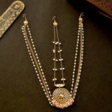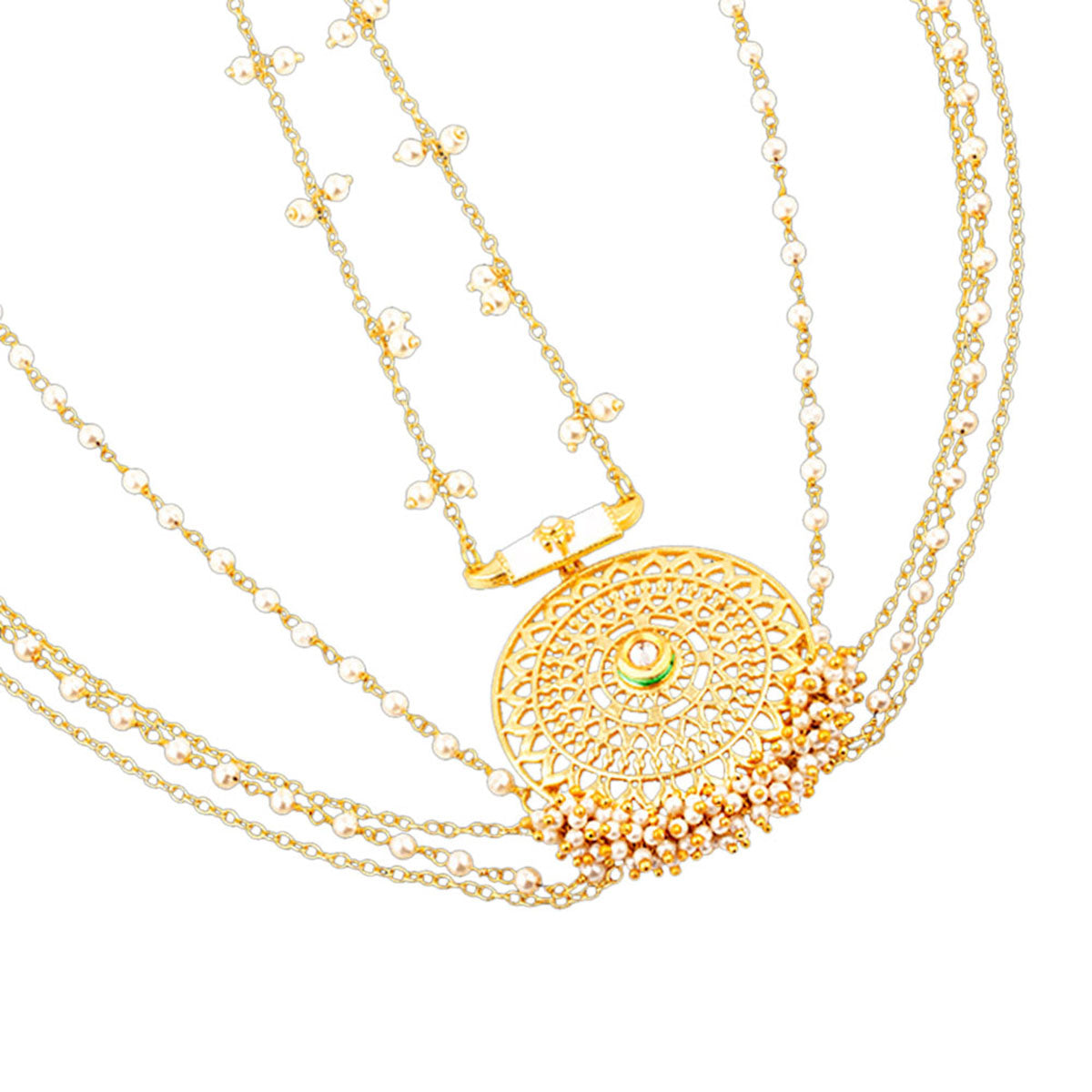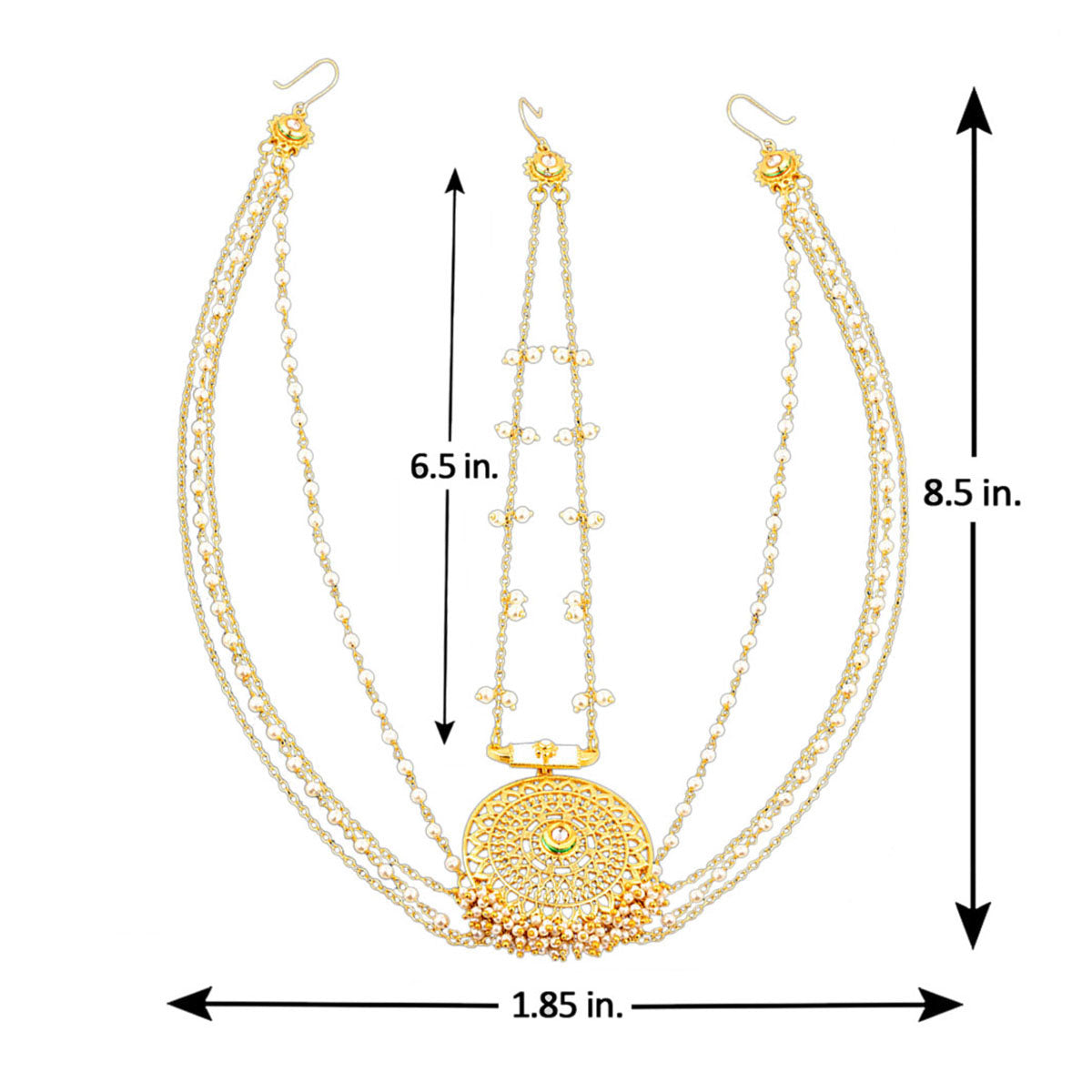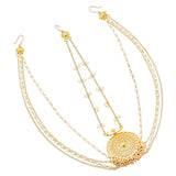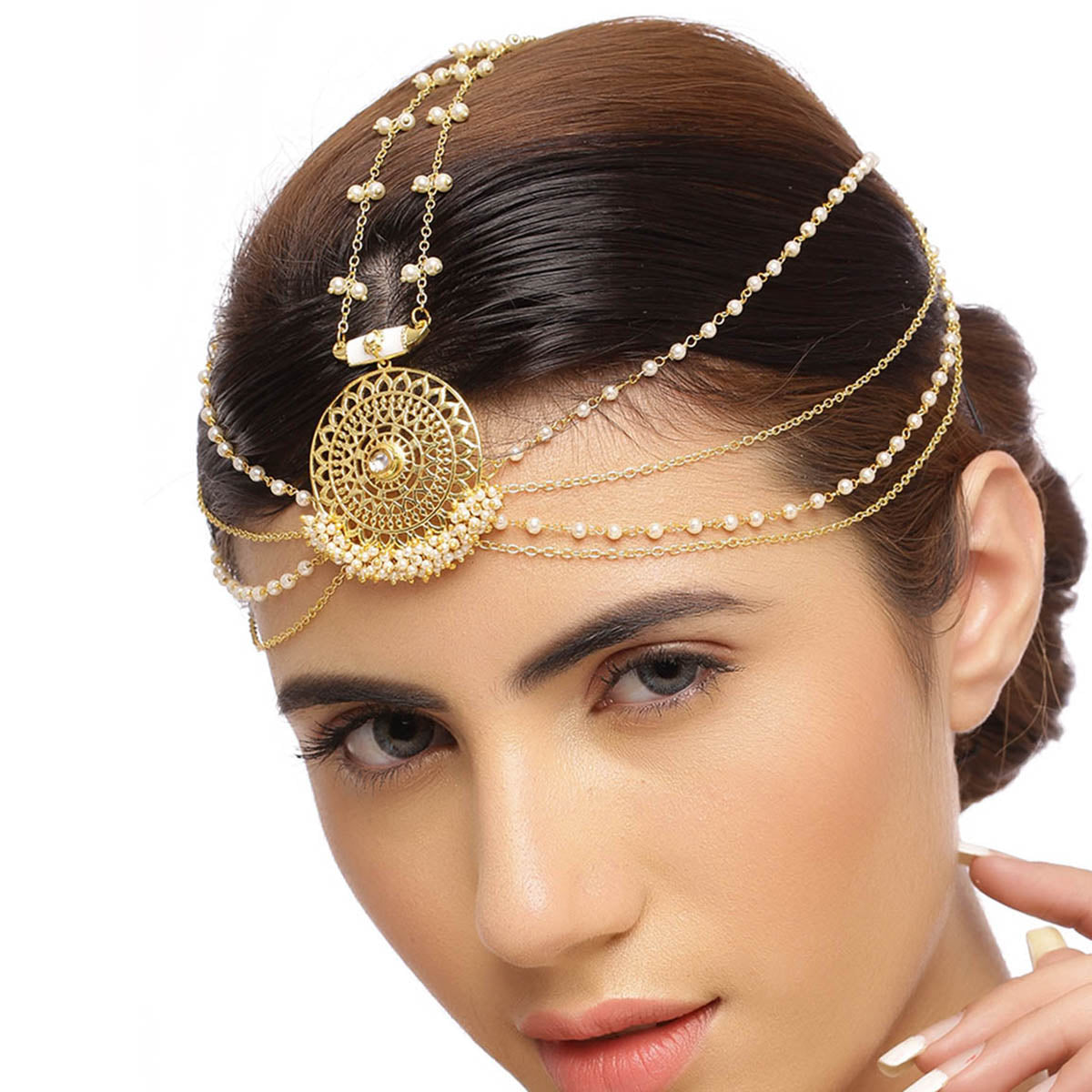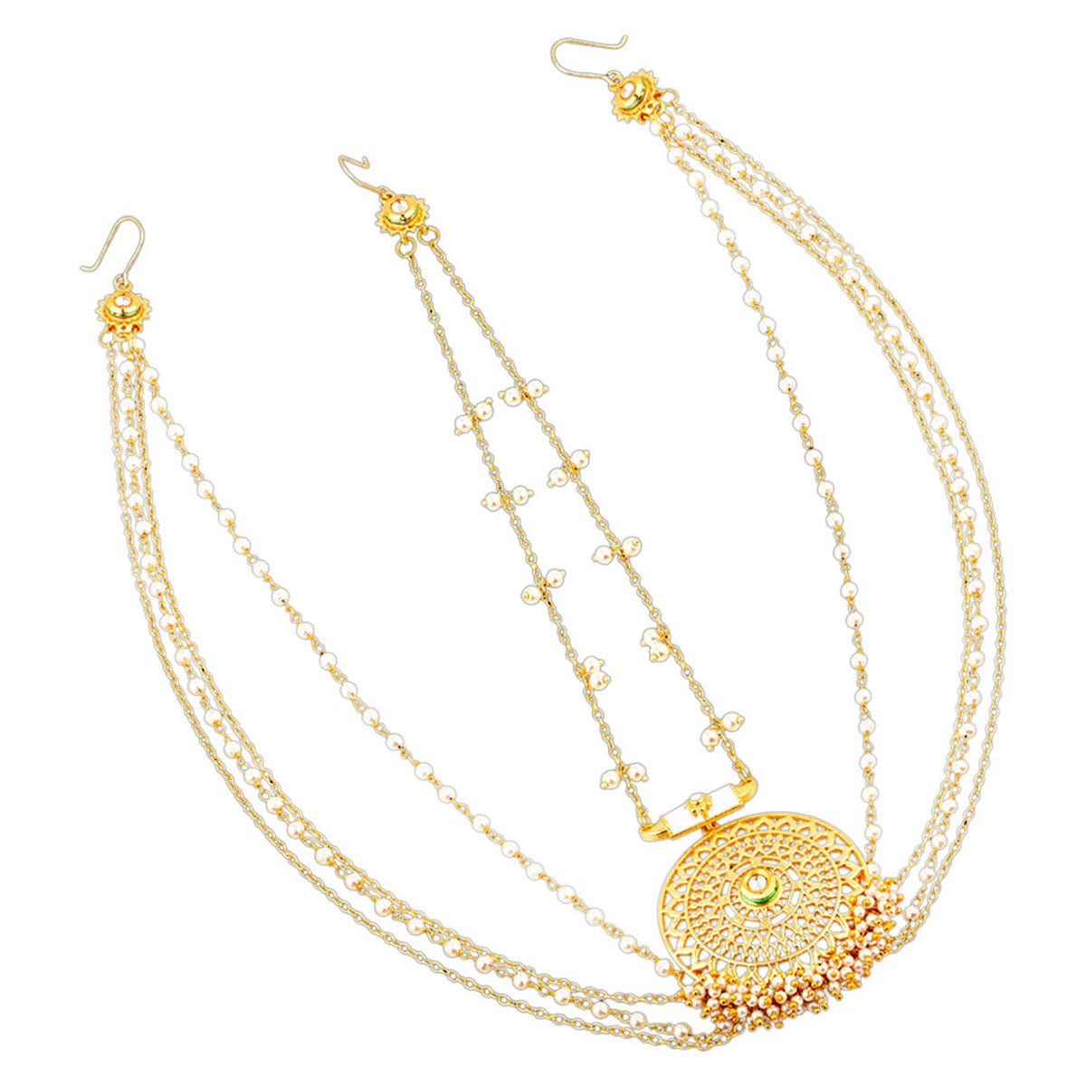 The life and times of the warrior queen Lakshmibai have inspired this brass maang tika. Yellow gold plated and heavily embellished. Good for formal ethnic looks.
