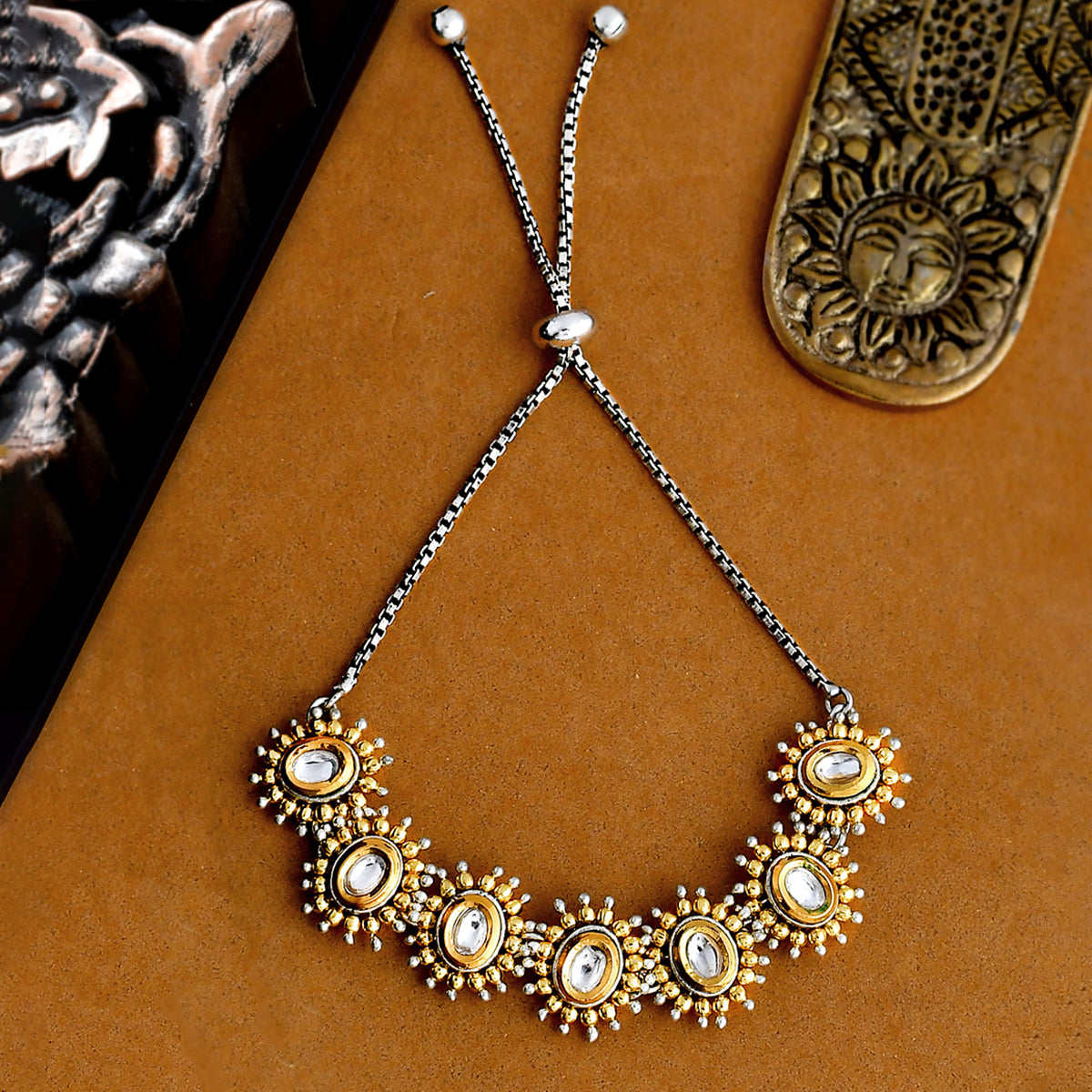 Designed as a tribute to erstwhile regal jewellery designs, popularised by Manikarnika, this bracelet has been fashioned out of fine two-tones brass. With two tone plating, the pearls and kundan gems adorned bracelet is adjustable for maximum comfort. The perfect statement piece to add dazzle to just about any outfit.