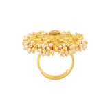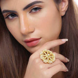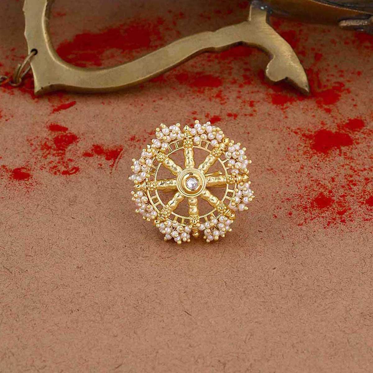 Spokes and wheels ring made from brass and inspired by the life and times of Rani Lakshmibai. Heavily embellished and yellow gold plated. Good for formal looks.