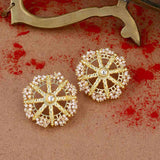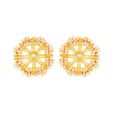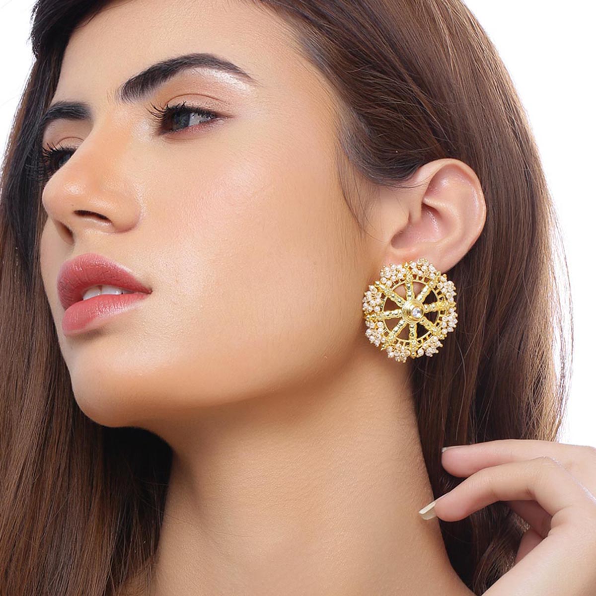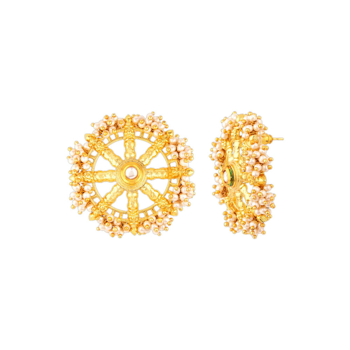 Spokes and wheels stud earrings made from brass and inspired by the era of queen Lakshmibai. Heavily embellished and yellow gold plated. Good match for ethnic looks.