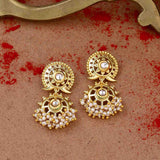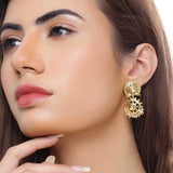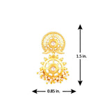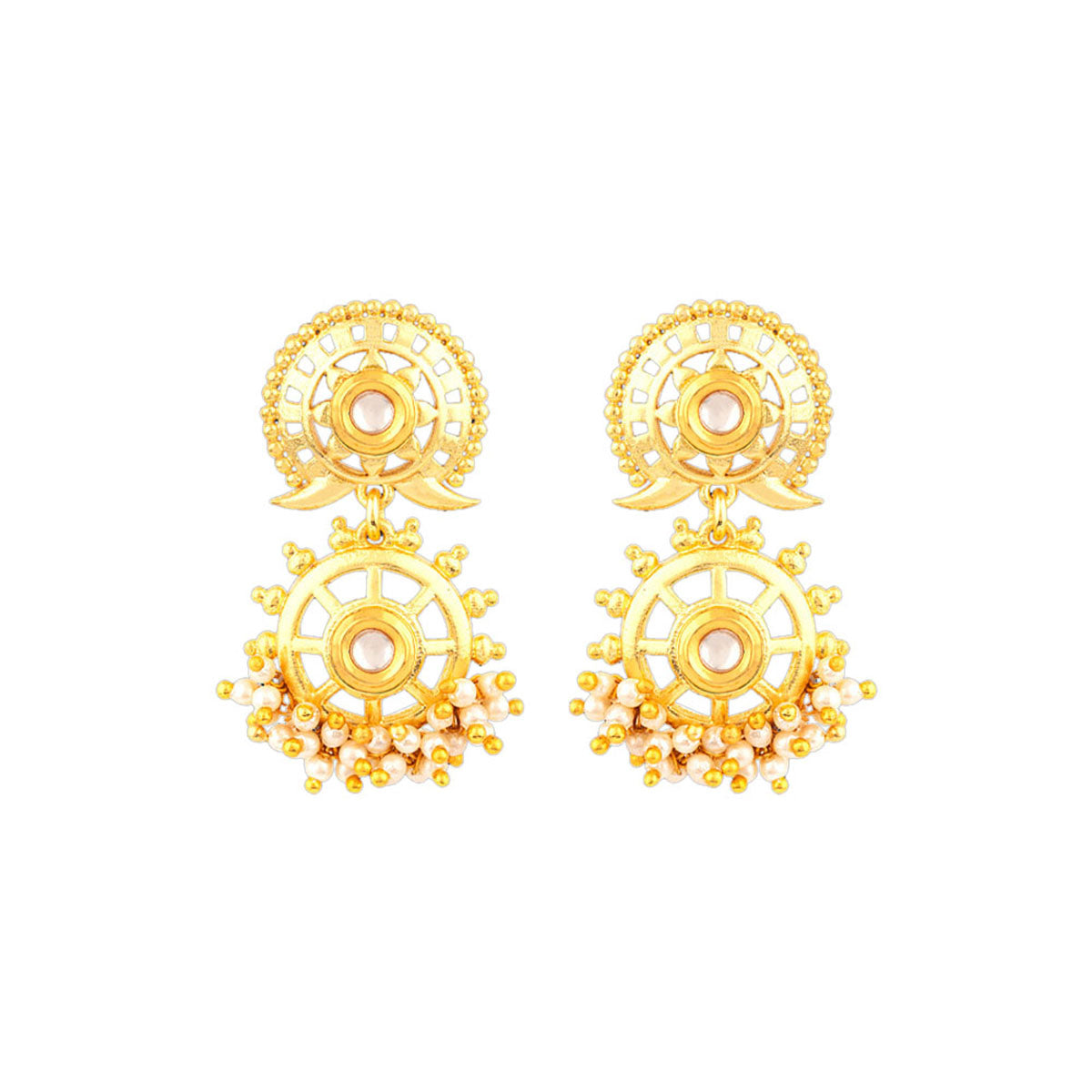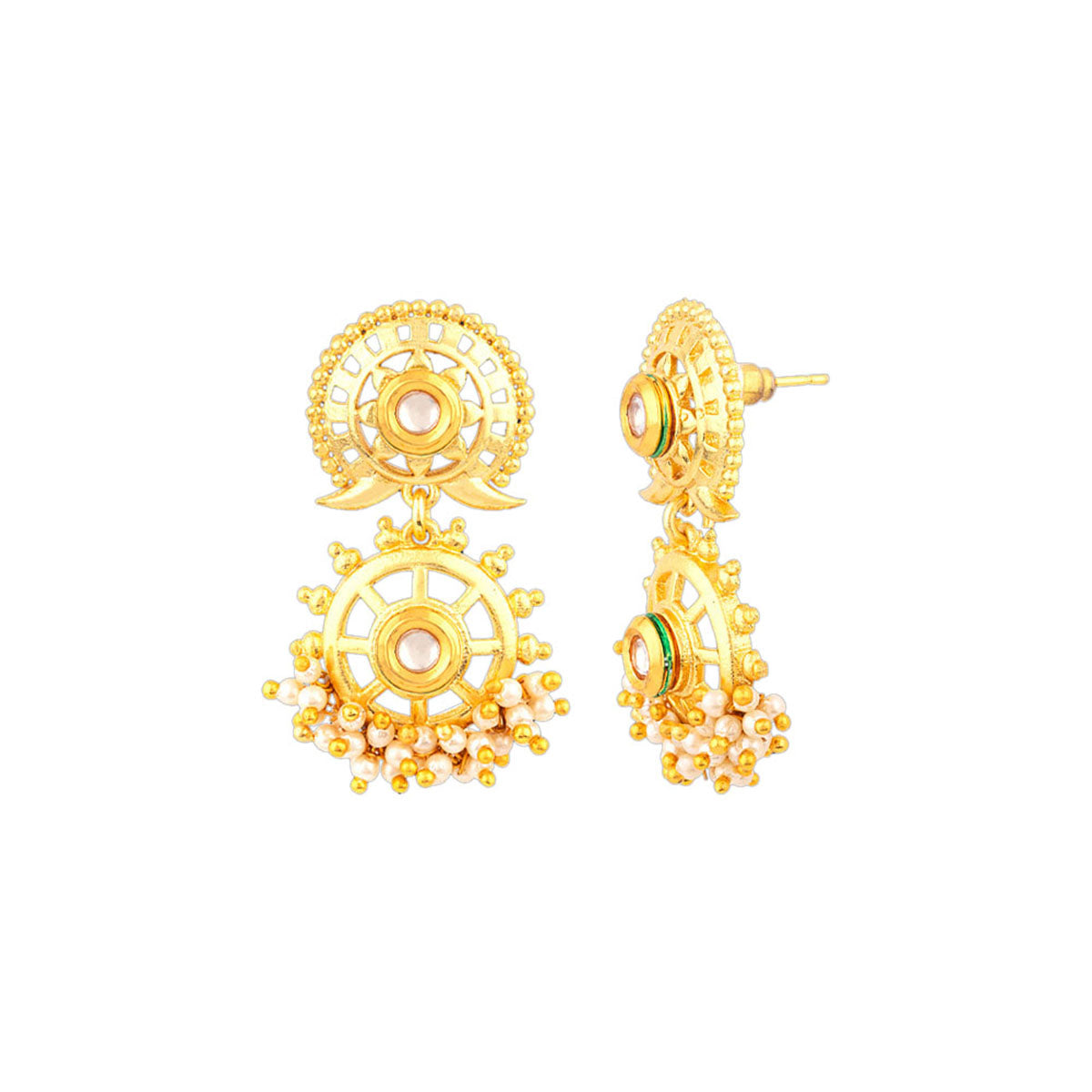 Inspired by the era of Rani Lakshmibai, the spokes drop earrings have been crafted from brass. Yellow gold plated and embellished. Wear with a traditional saree. This piece of jewelry comes with the Voylla assurance of quality and durability.
