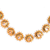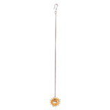 Inspired by old-school royal jewellery designs, recently popularised once again by Manikarnika, this traditional maang tika set has been designed for style and comfort. Made from brass and adorned with white pearls and oval cut faux kundan gems, the two tone plated bracelet will pair perfectly with your traditional outfits.