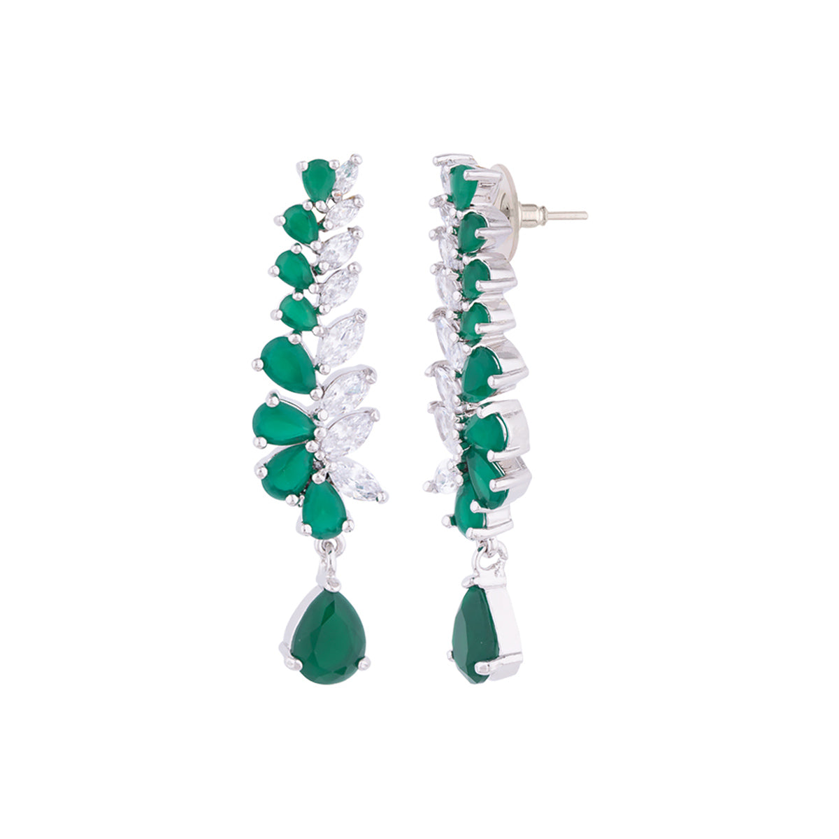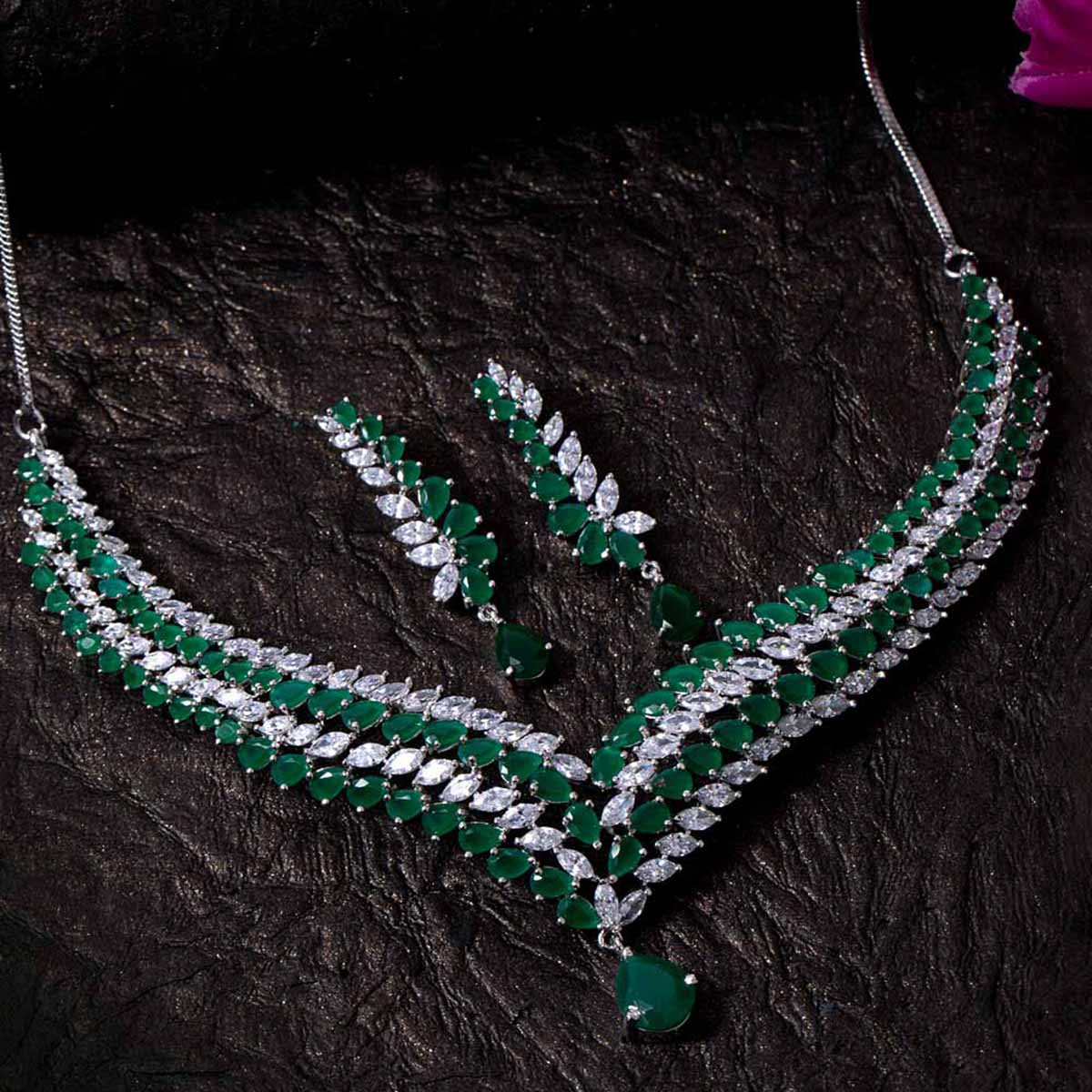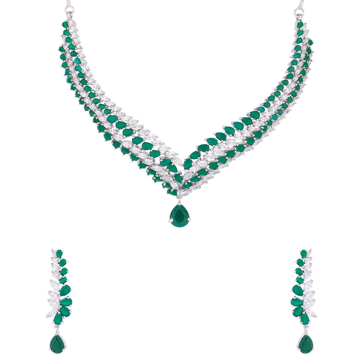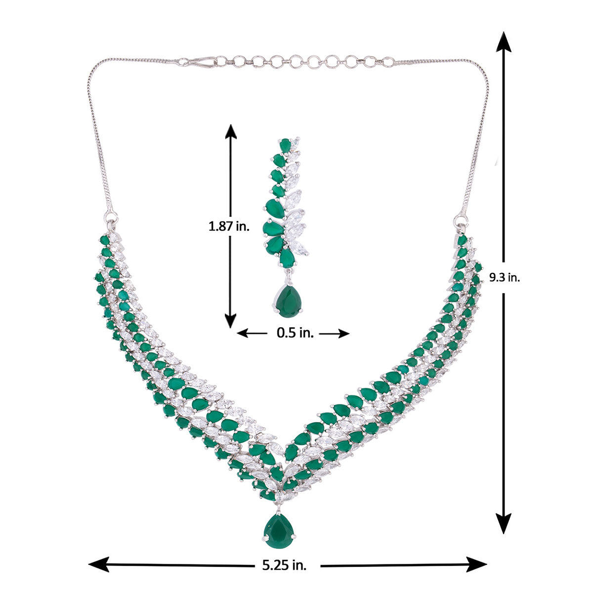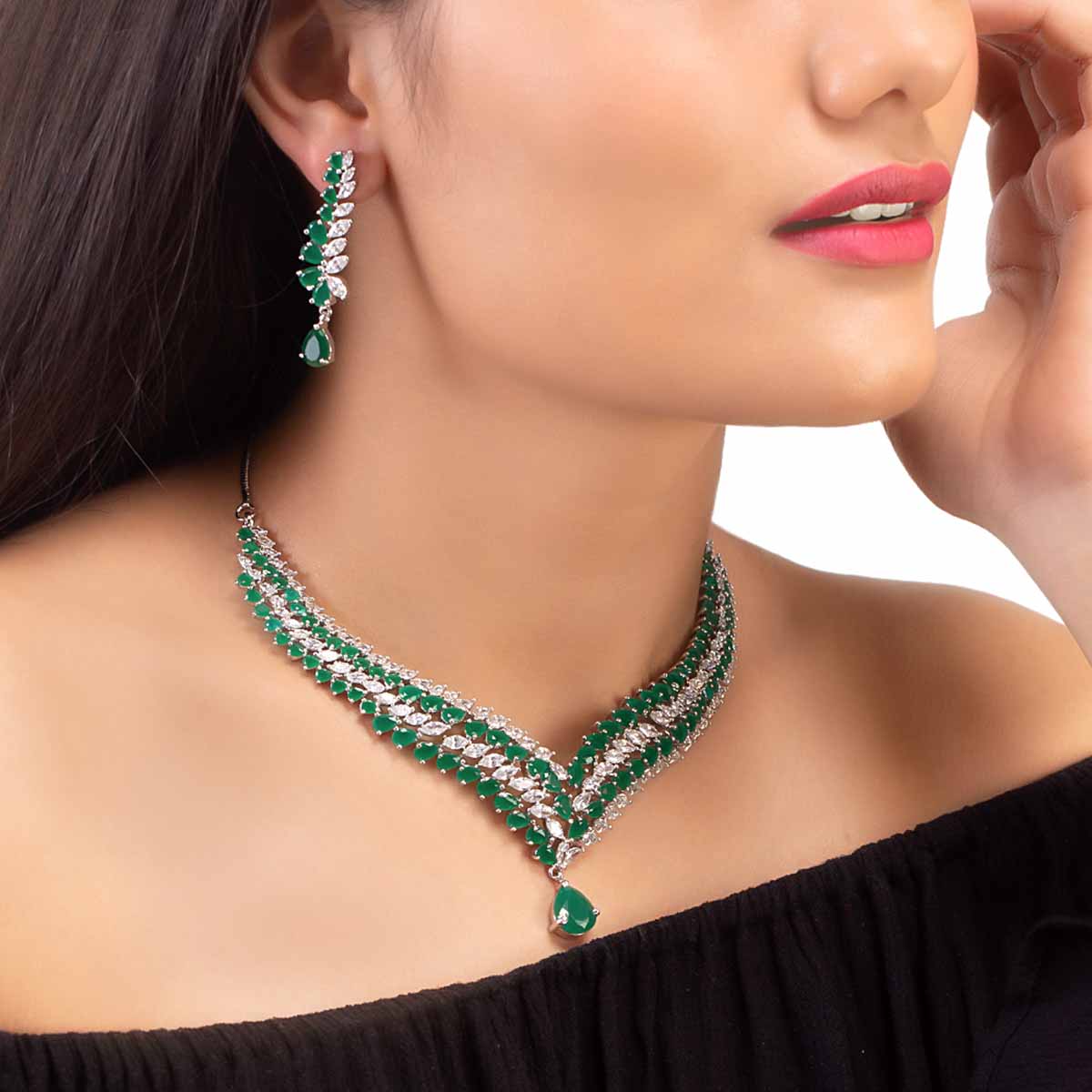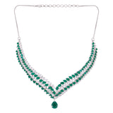 Victorian inspired brass necklace set with silver plating. Embellished with American Diamond gems. Good for formal attire of all kinds.