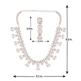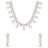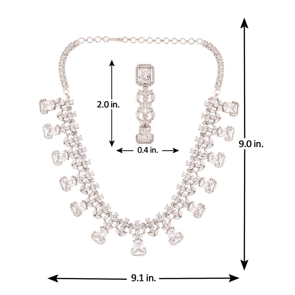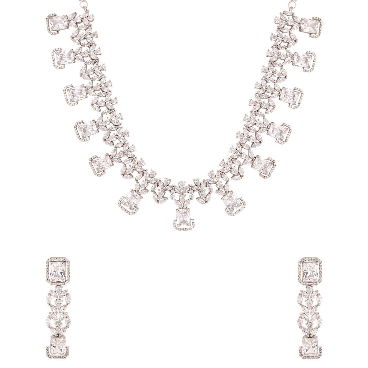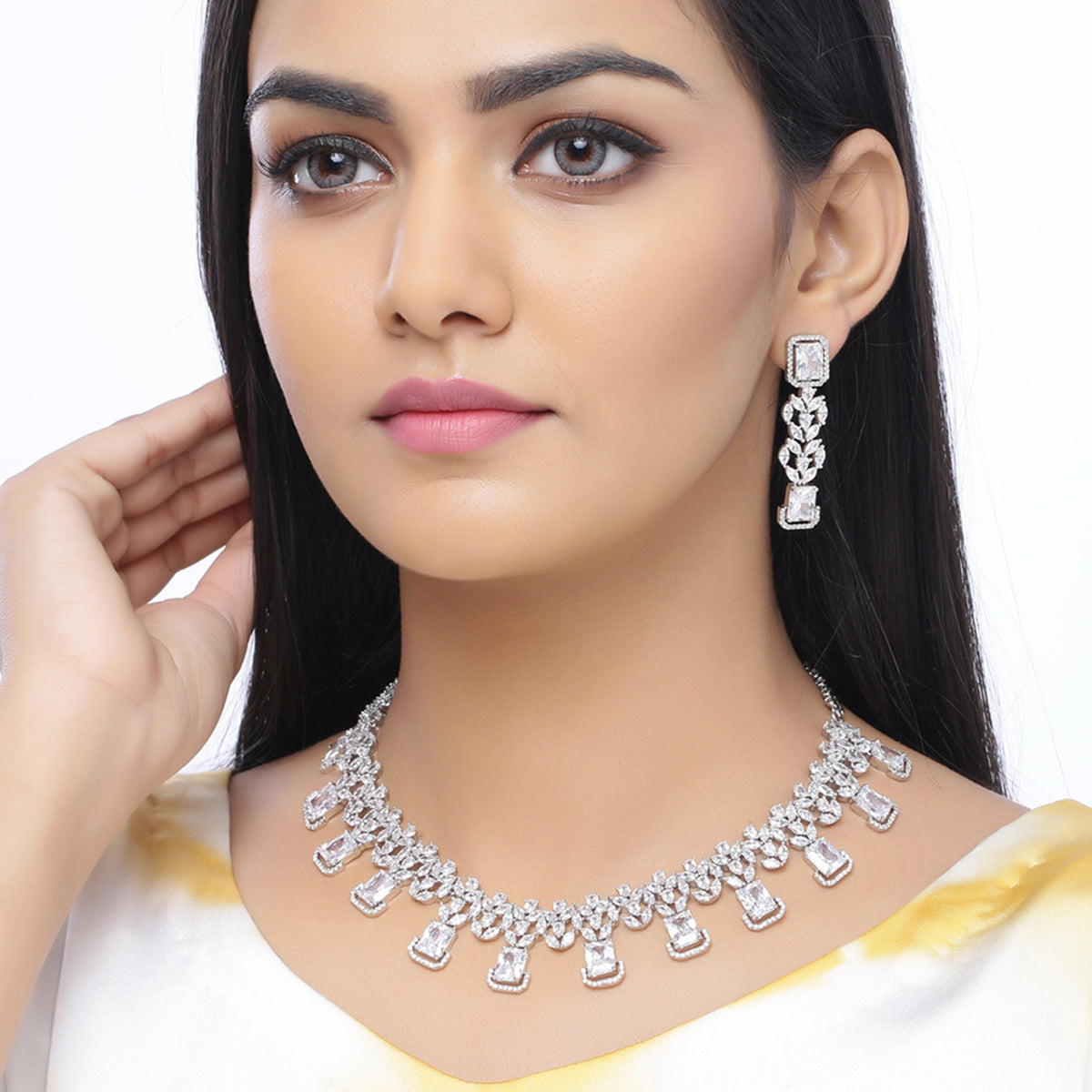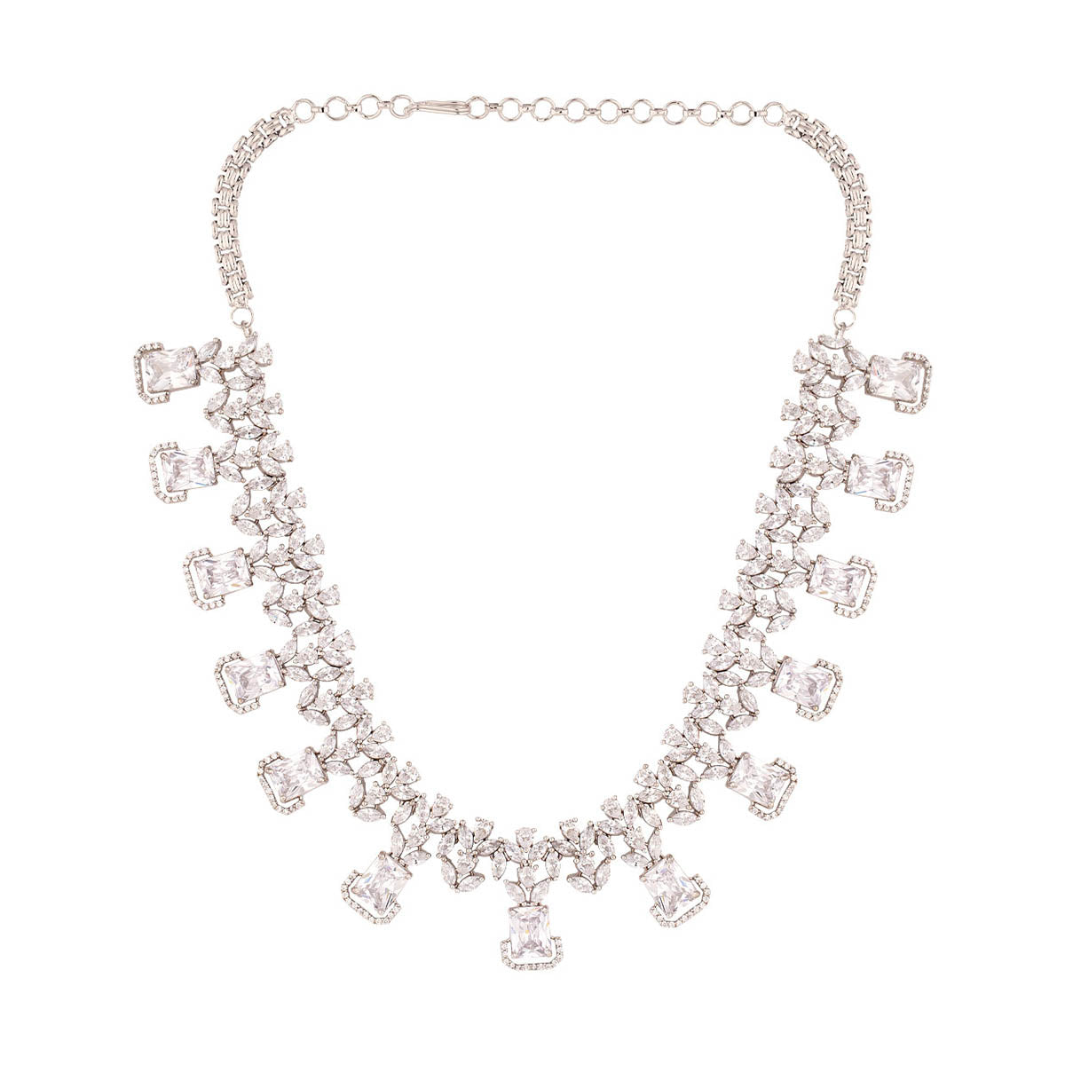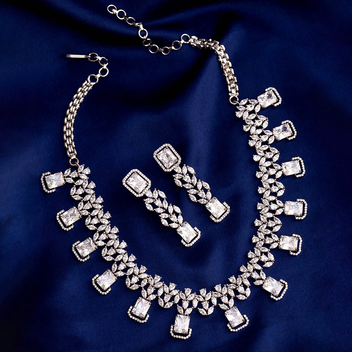 Victorian jewelry inspired brass necklace set. American Diamond gems embellished and silver plated. Pair with formal attire.