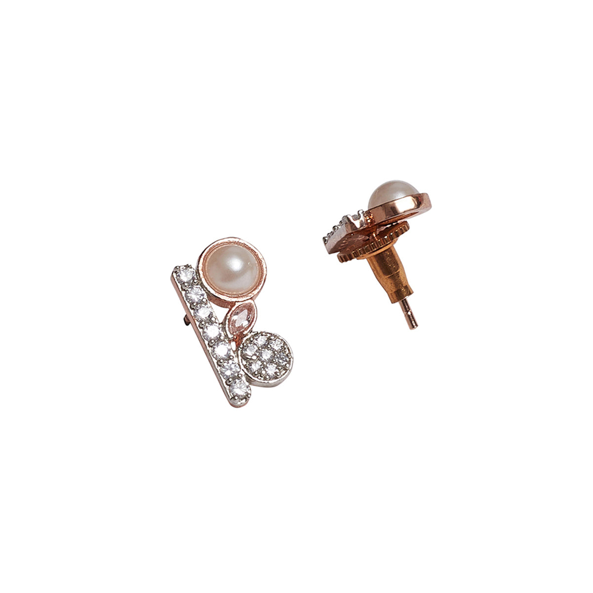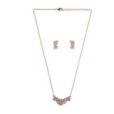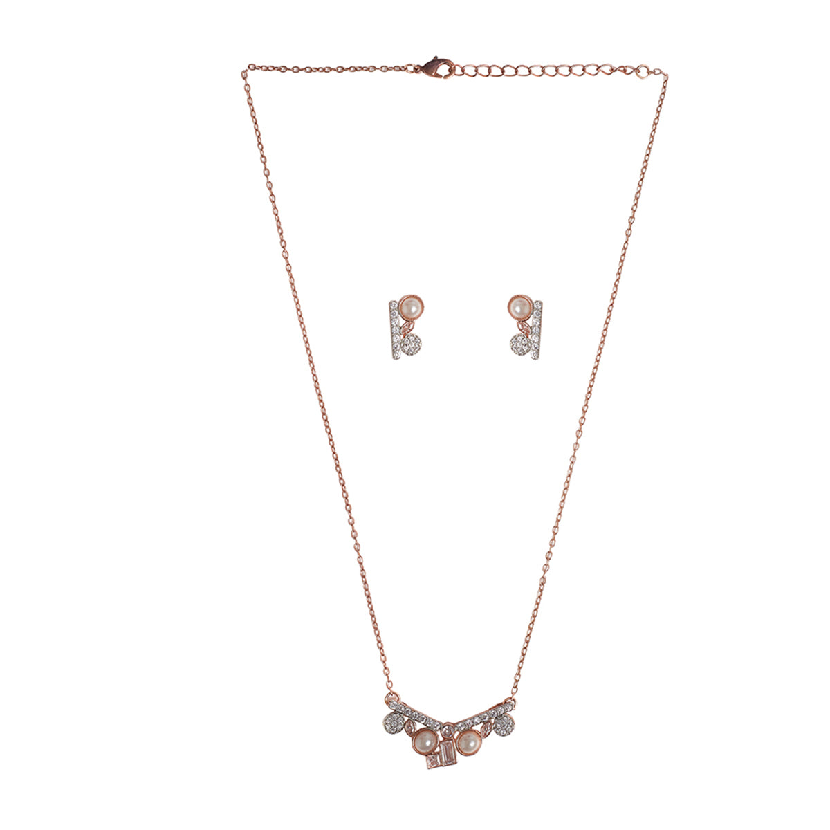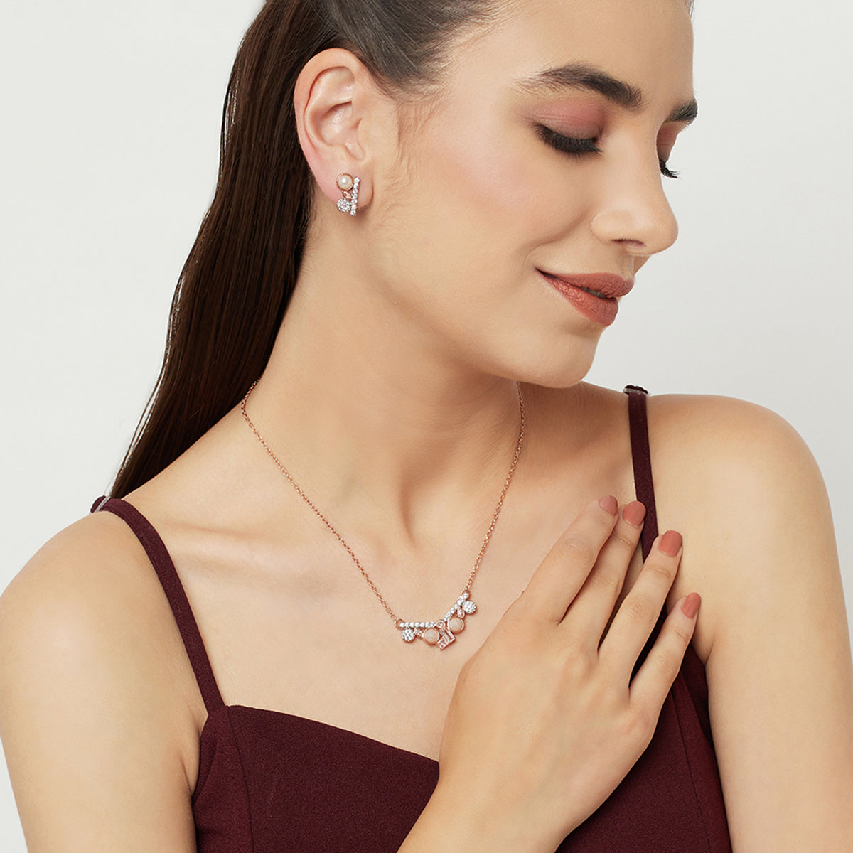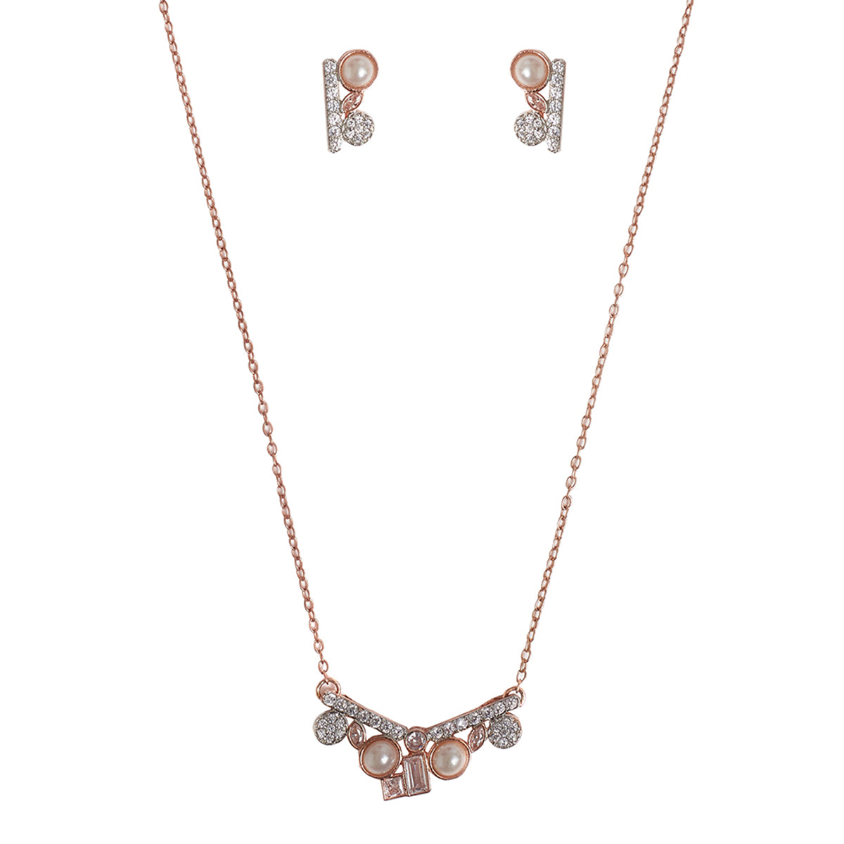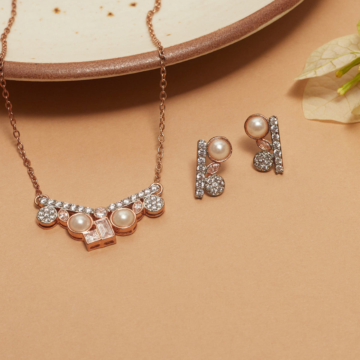 A delicate, vintage inspired pendant set, made from quality brass and white rhodium plated for added charm. The simple yet opulent set has been embellished with white faux pearls and zircon gemstones in a cluster setting. Pair the pendant and earrings with a cocktail dress, formal gown or even a designer saree.