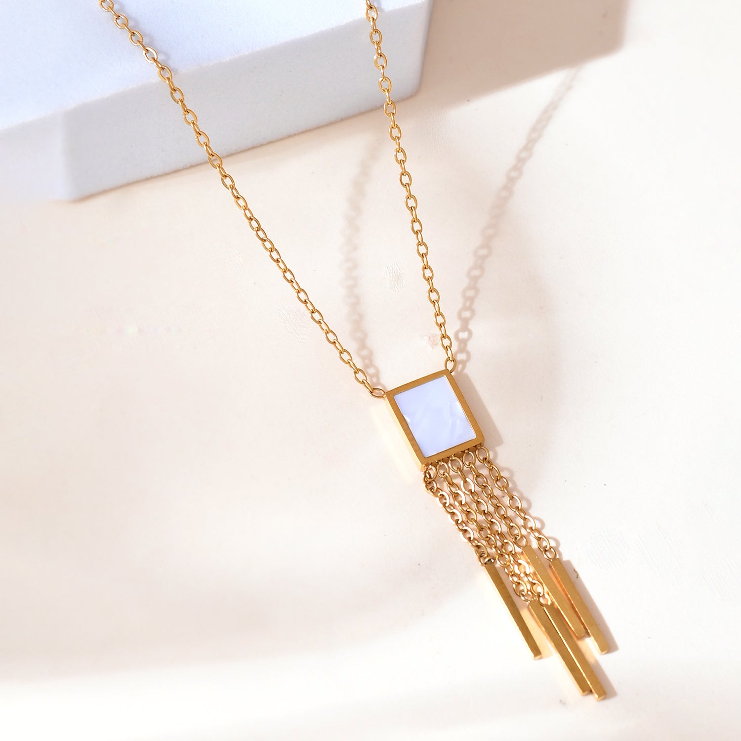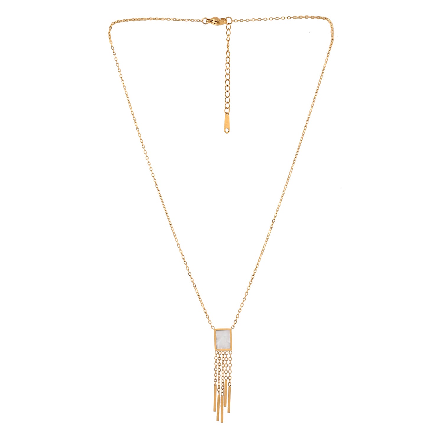 Ever feel like you’re missing that one special piece to complete your look? Look no further! This stunning Voylla pendant is more than just jewelry—it's a statement.Crafted from high-quality alloy and plated with a luxurious yellow gold finish, this pendant is a versatile addition to any jewelry collection. The centerpiece features a delicate square with a mother-of-pearl-like inlay, exuding sophistication and charm. Dangling from the square are multiple gold chains that culminate in sleek, rectangular fringes, adding a touch of playful movement and modern flair.Whether you're dressing up for a party, heading to work, or planning a vacation, this pendant is your go-to accessory. It's perfect for everyday wear and makes a thoughtful gift for any woman in your life, be it your sister, girlfriend, wife, mother, or friend. Celebrate special occasions like Diwali, Rakshabandhan, Christmas, New Year, or Valentine's Day with this stunning piece that promises to make any outfit shine.