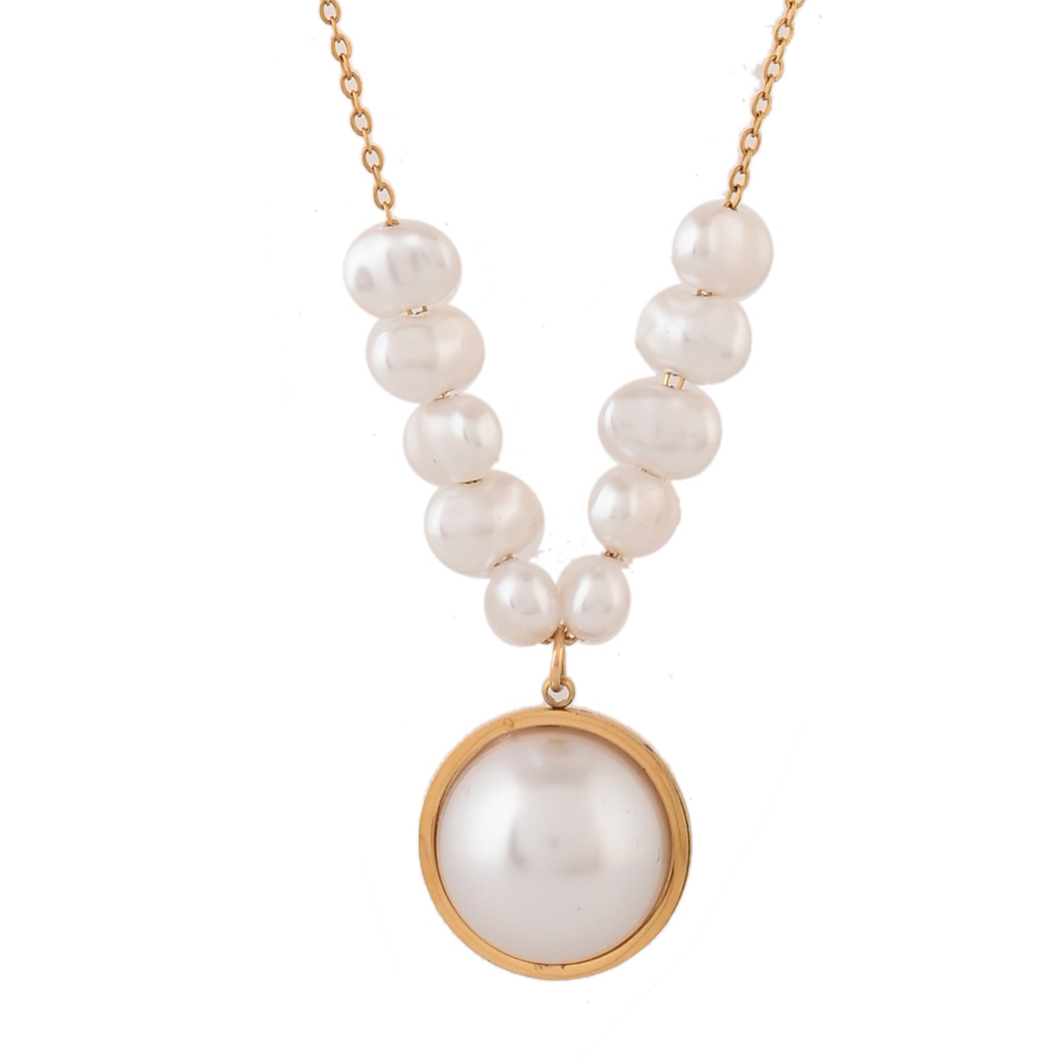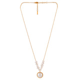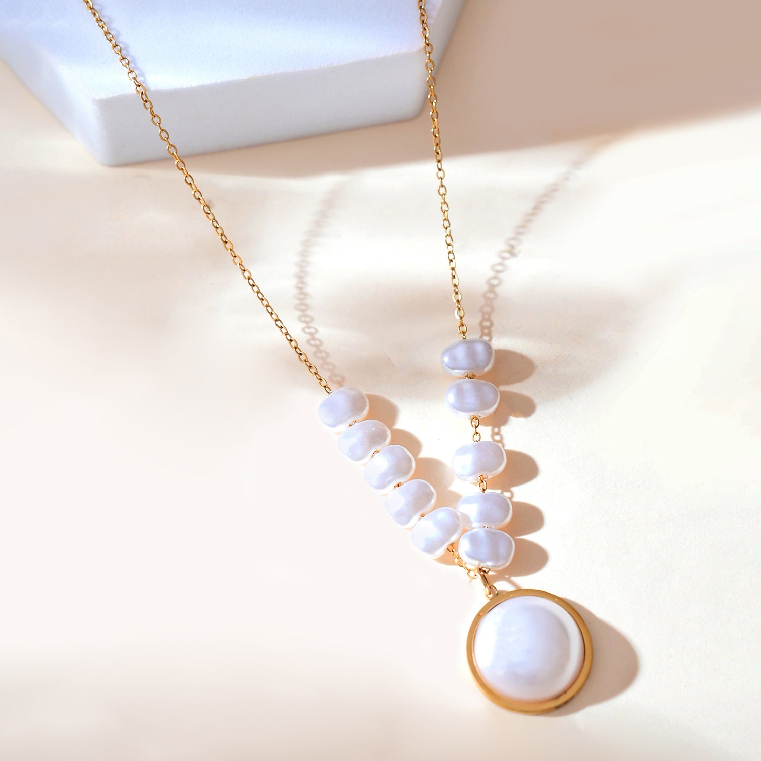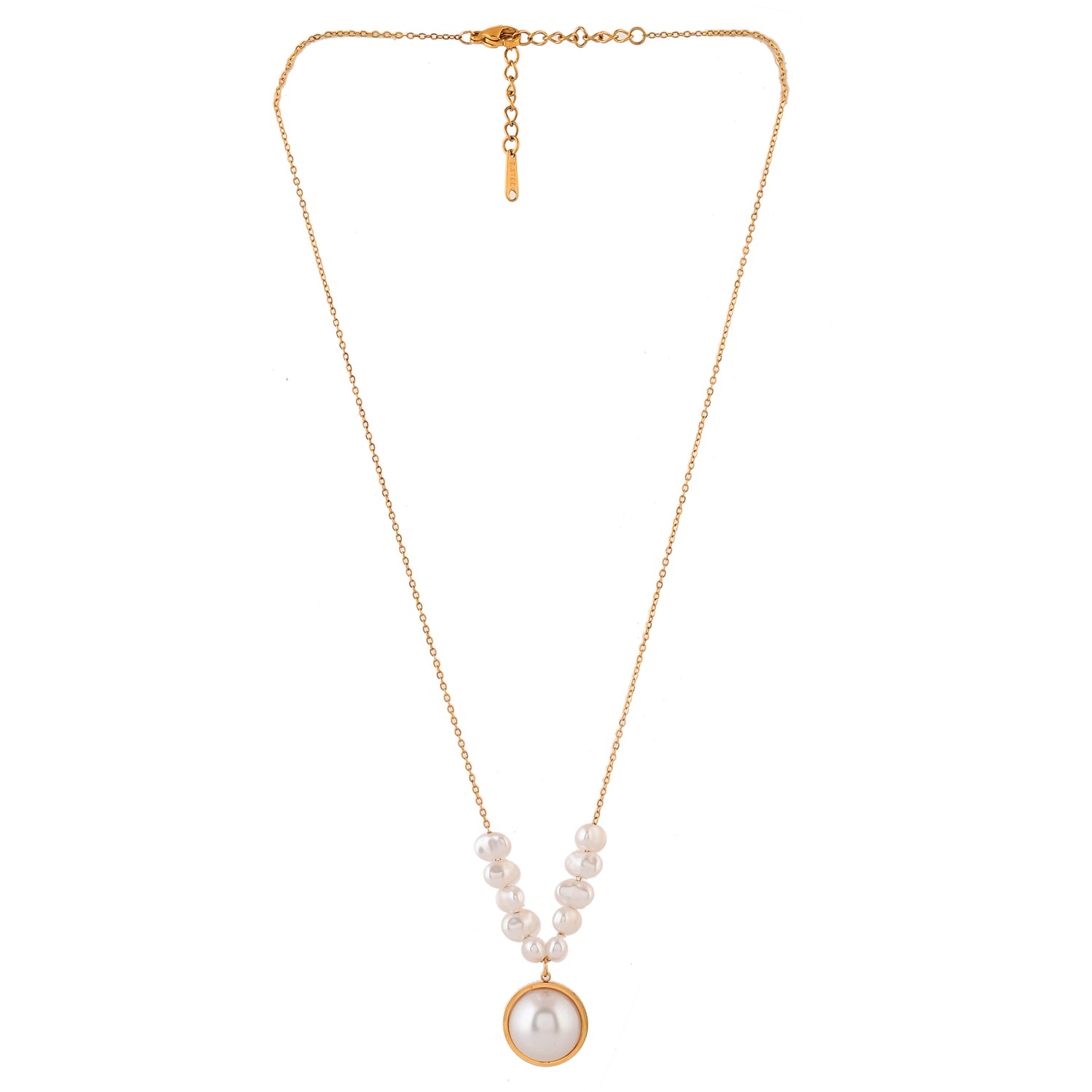 Meet your new favorite pendant—a stunning blend of timeless charm and modern flair. This Voylla creation is designed with an alloy base and is beautifully plated in yellow gold. It features faux pearls that shimmer and add a touch of sophistication to any outfit.This stunning piece features a delicate yellow gold-plated alloy chain, adorned with lustrous, irregularly shaped pearls that cascade gracefully. The centerpiece is a large, round pearl encased in a sleek gold frame, exuding timeless elegance and sophistication. Perfect for any occasion, whether it's a party, work, or a casual day out, this pendant is a versatile addition to any jewelry collection. Ideal as a gift for women, be it for Valentine's Day, Diwali, Raksha Bandhan, or Christmas, this pendant is sure to make any woman feel cherished and adored.