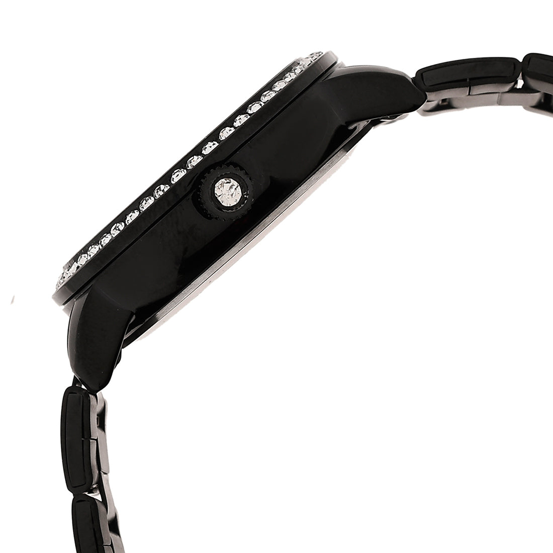 A studded analog watch with classic black dial. White rhodium plated and crafted from high quality stainless steel, the watch will pair well with all your looks and outfits.