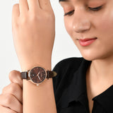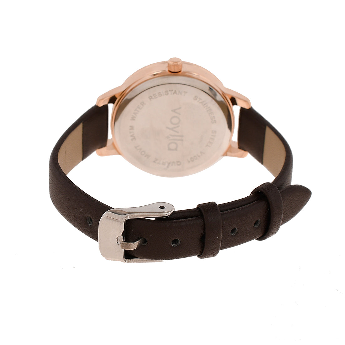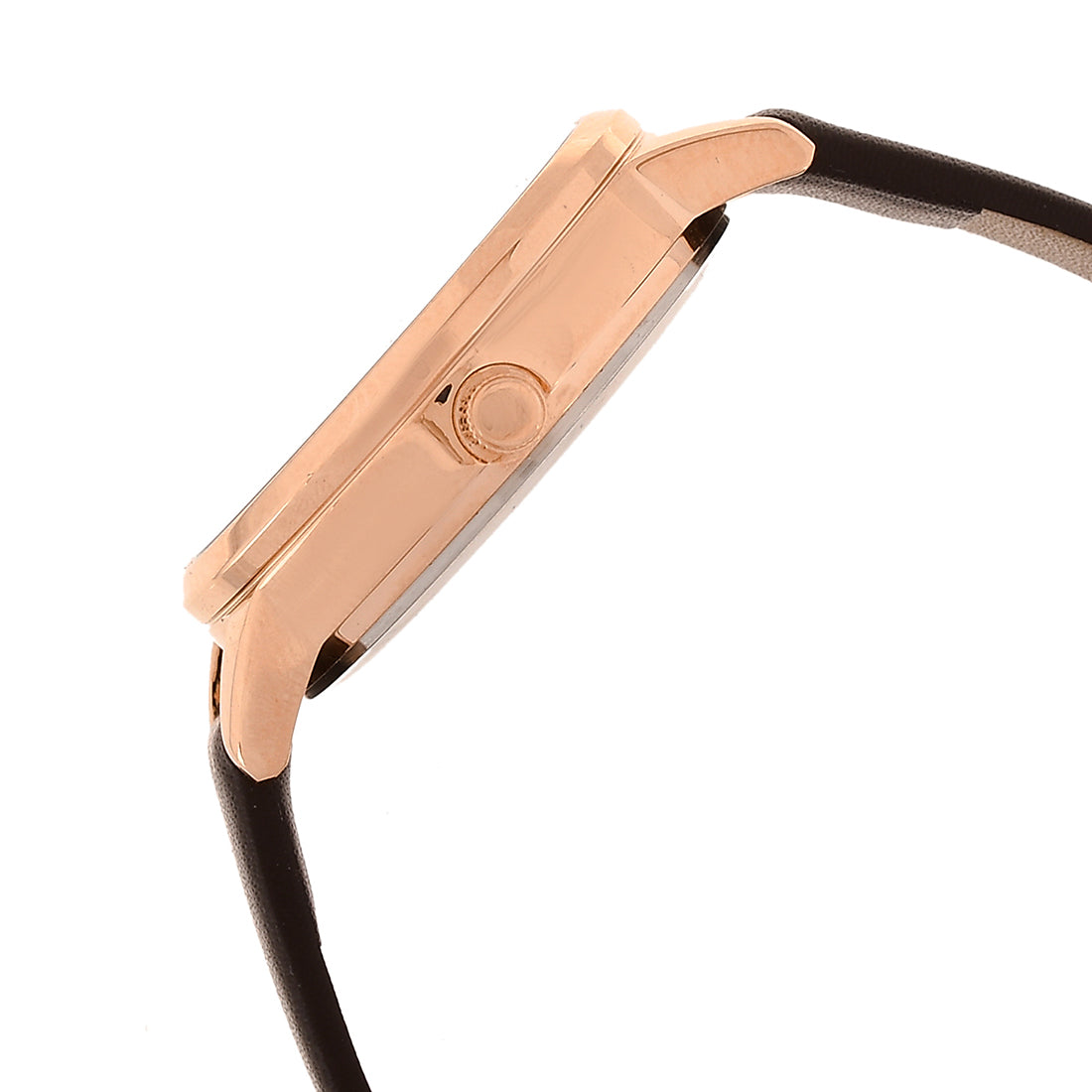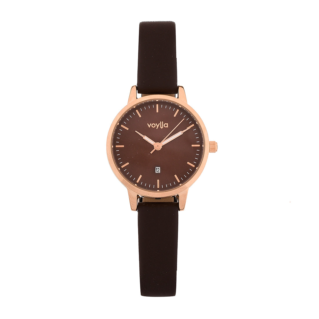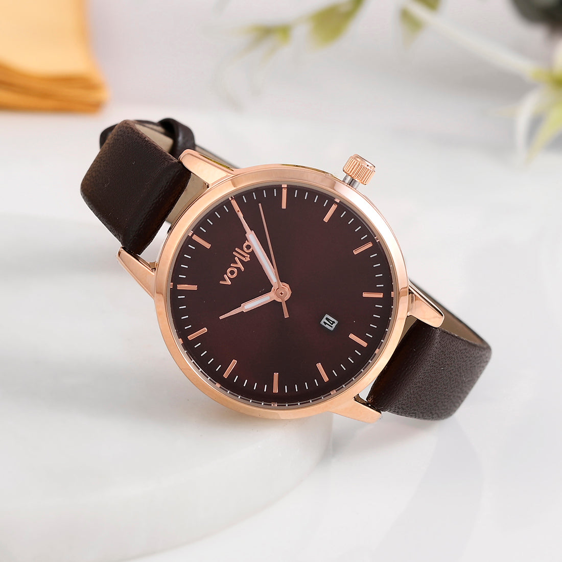 Rose gold plated watch with a brown dial and strap. Made from brass and a good match for formal workwear.