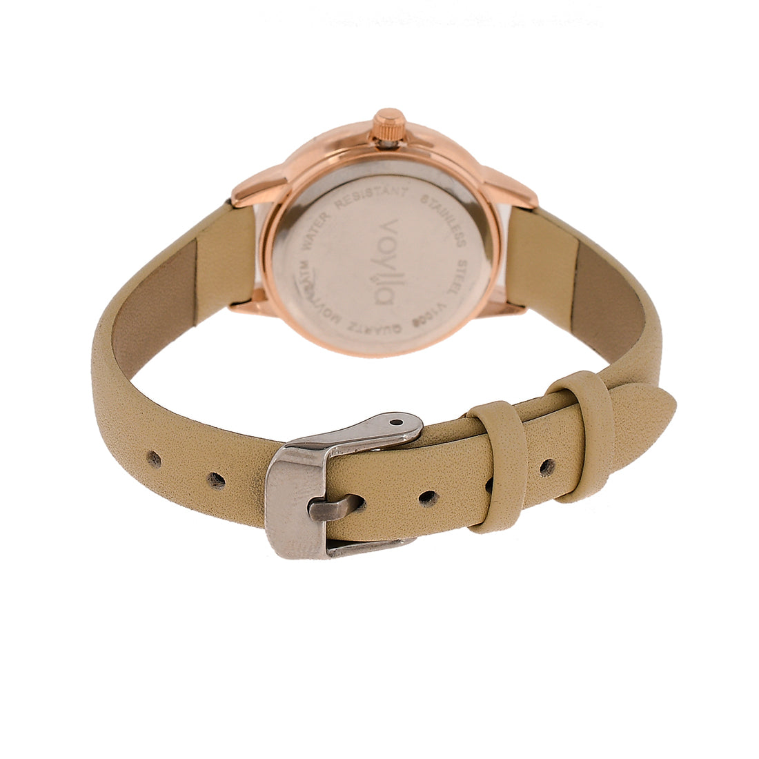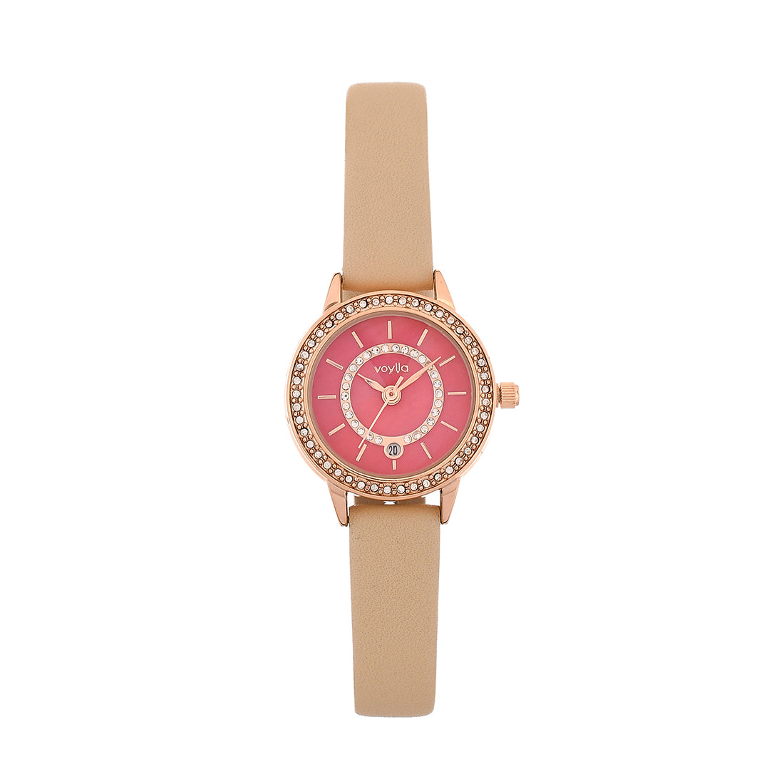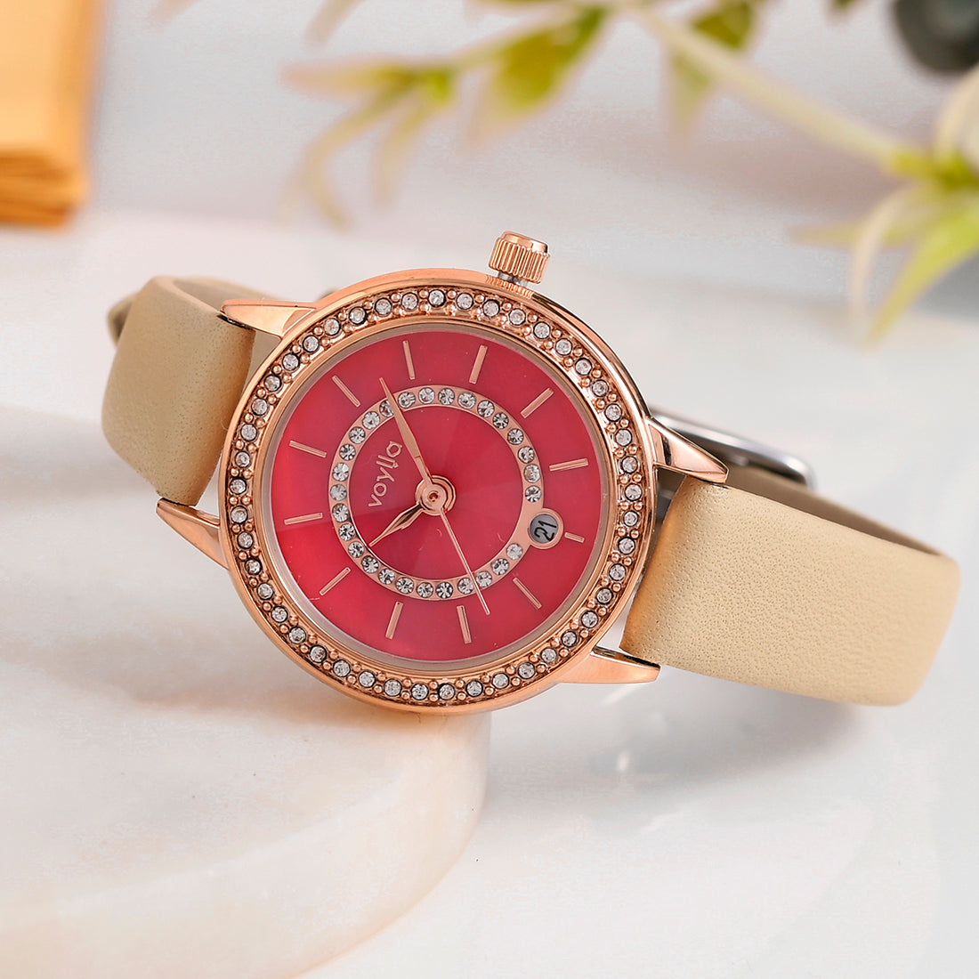 Brass analog watch for women with a royal red dial and gemstone embellishments. Rose gold plated for added charm, the watch will pair well with a wide range of looks and outfits.