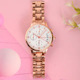 A classic chronograph watch for women with a white dial. Rose gold plated for added charm, the watch has been crafted from brass. The perfect accessory to compliment special occasion outfits.