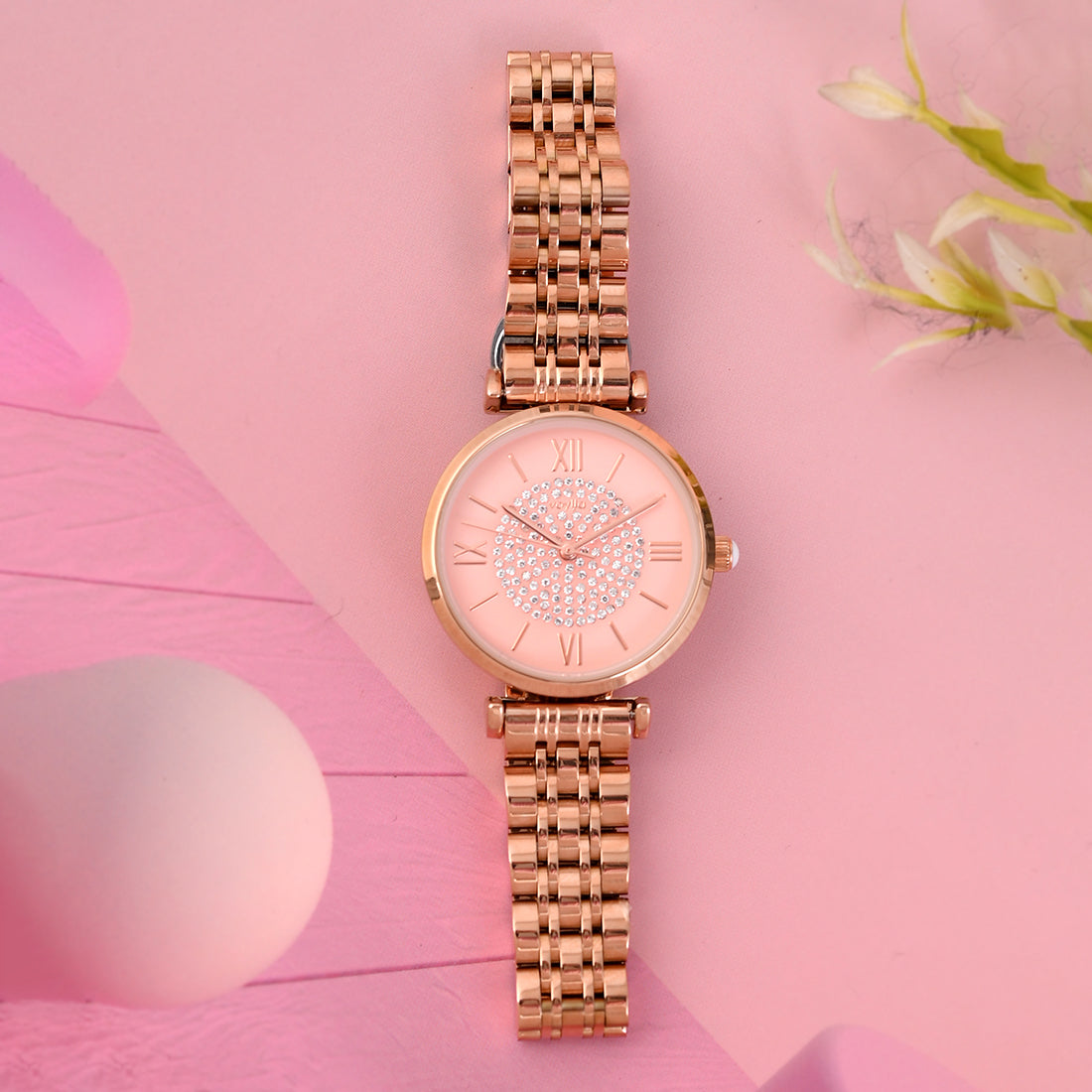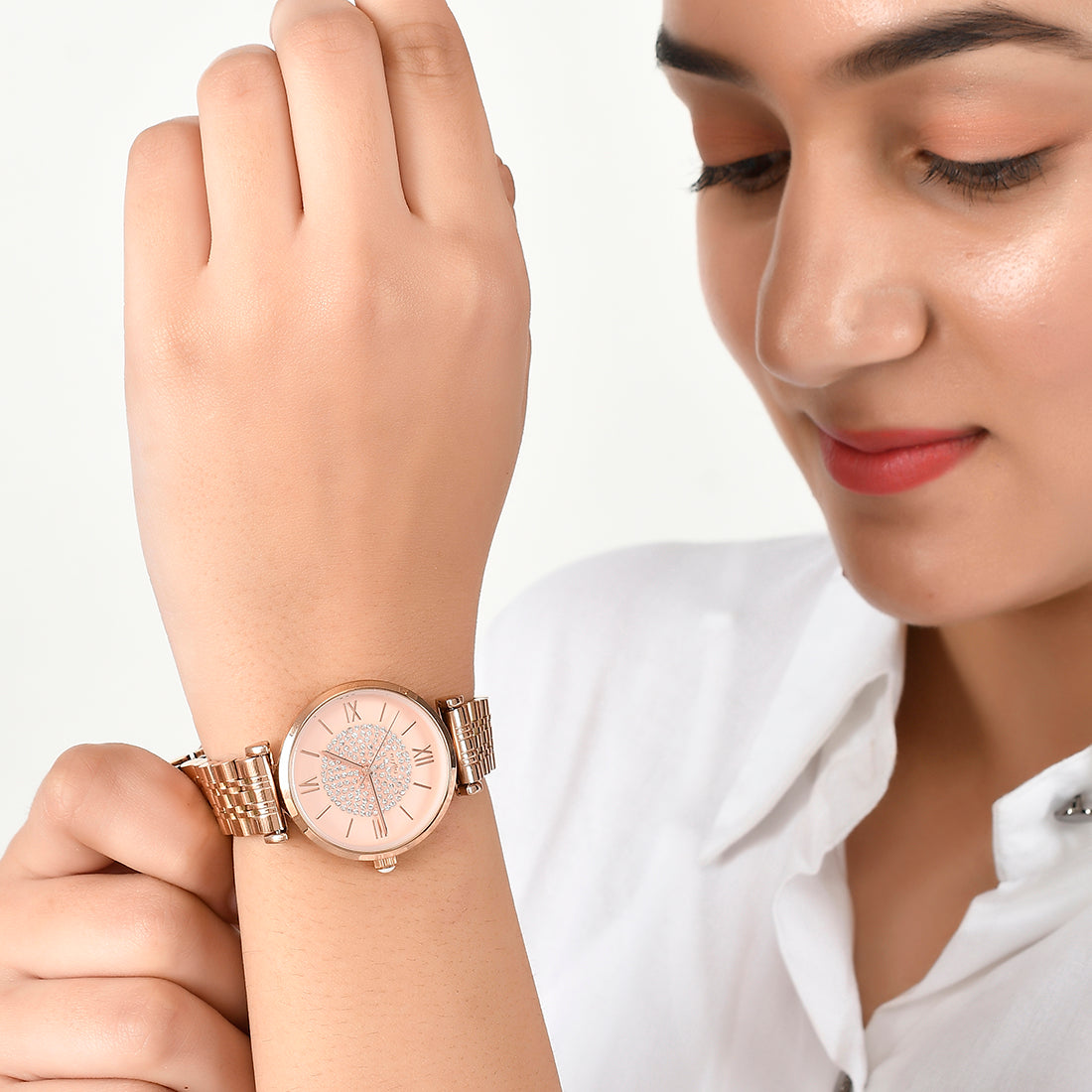 Gems adorned dial analog watch for women. Made from brass and rose gold plated. Pair with formal attire.