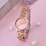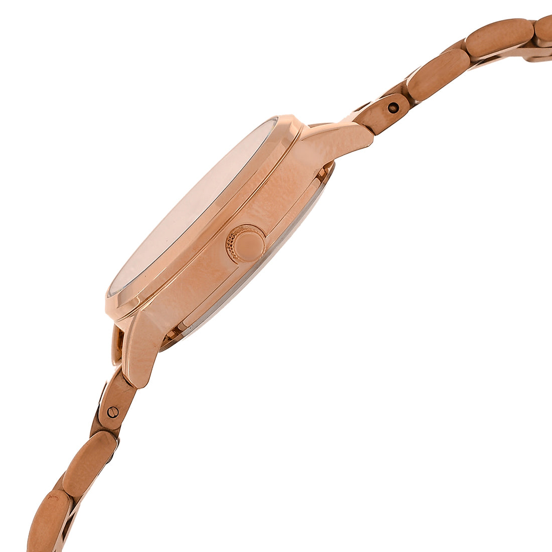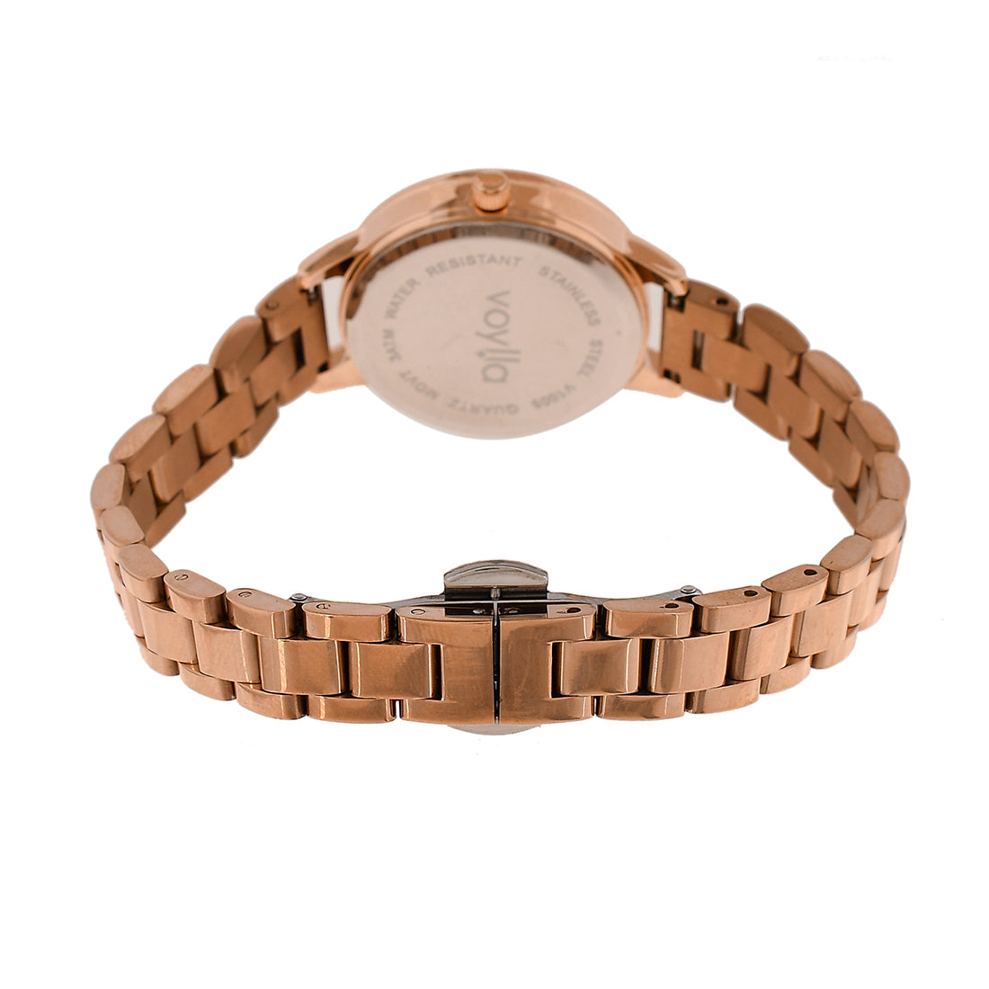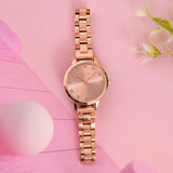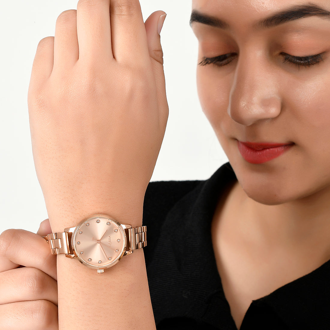 Analog watch with a rose gold dial and alluring rose gold plating. Made from brass and a good match for formal outfits.