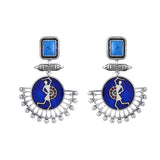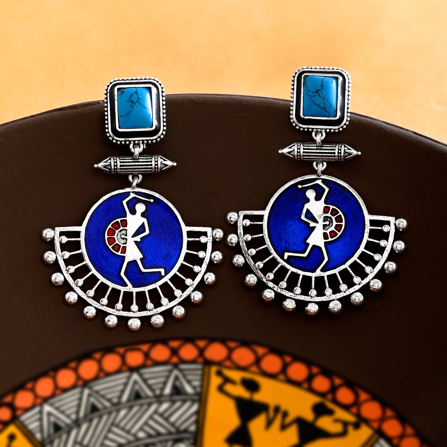 The grace and beauty of India's legendary Warli artform have inspired these enamelled drop earrings, which have been embellished with alluring blue stones. Made from brass and silver plated, the tribal motifs adorned earrings are lightweight, comfortable and versatile.