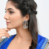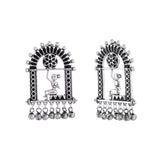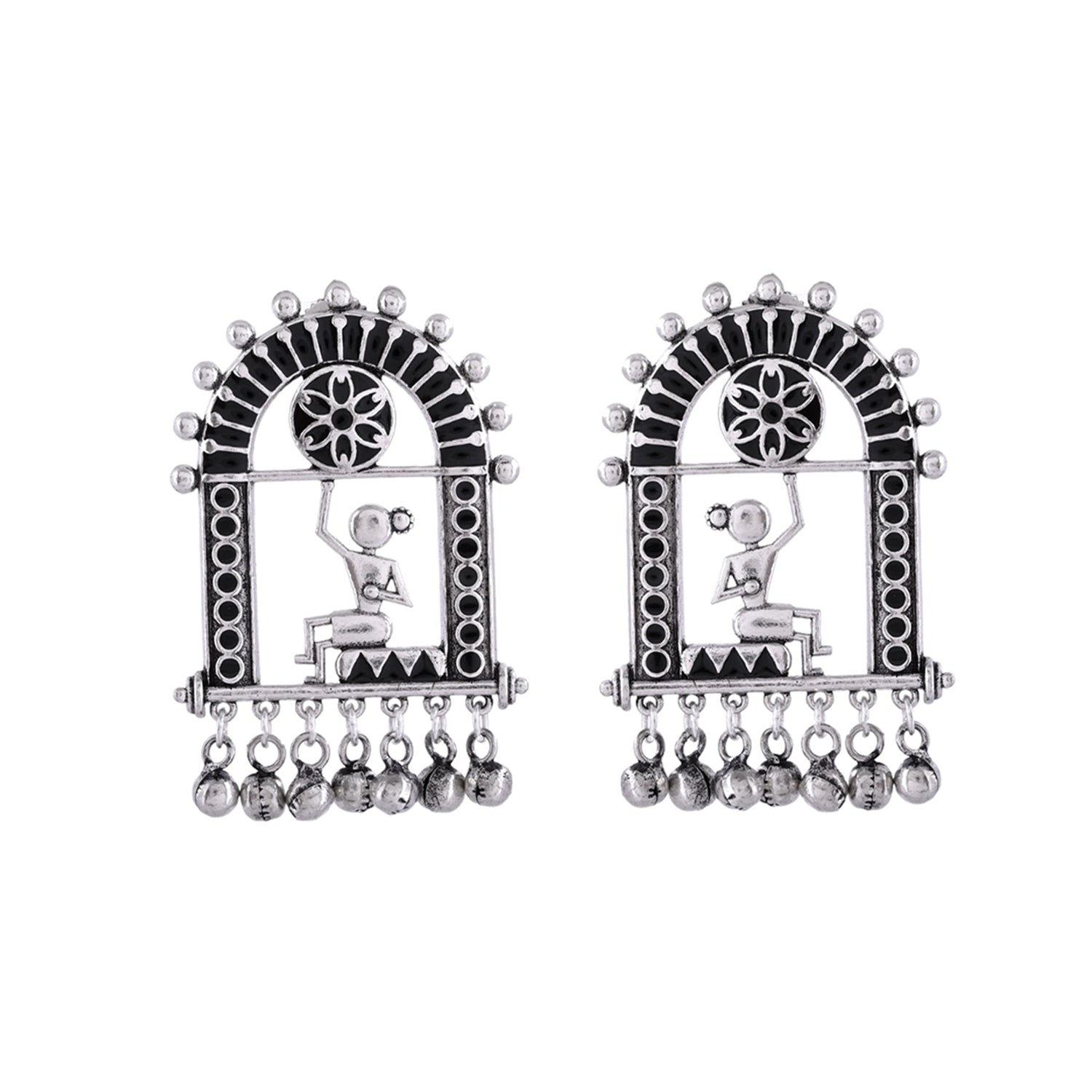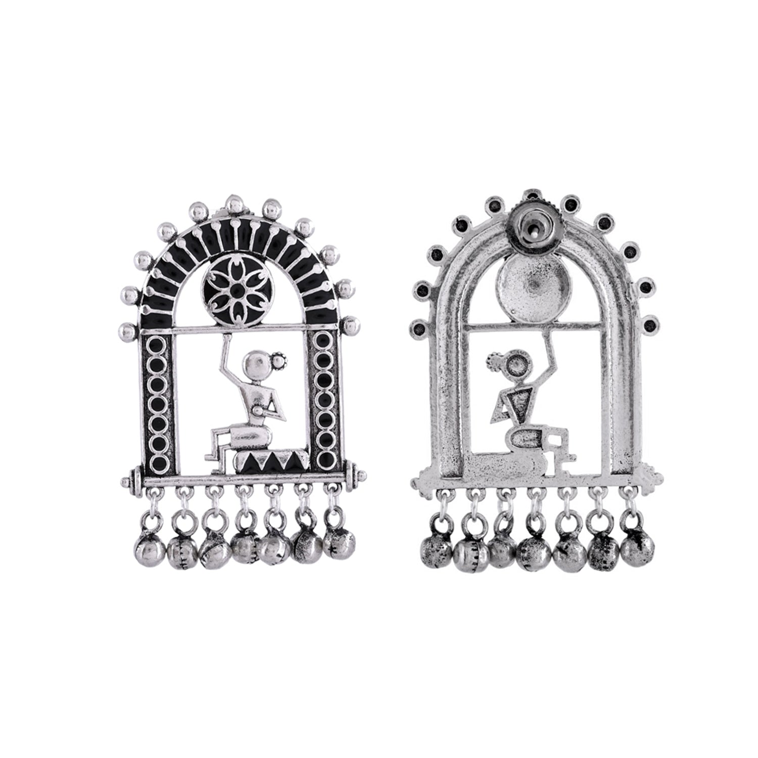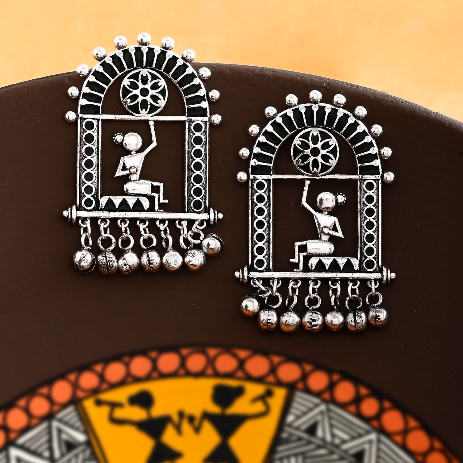Inspired by the legendary Warli artform, which has been making Indians proud since times immemorial, these earrings feature tribal motifs and metal ghunghroo embellishments. Made from brass, the comfortable and lightweight earrings are versatile. Silver plating adds to the their rustic charm.