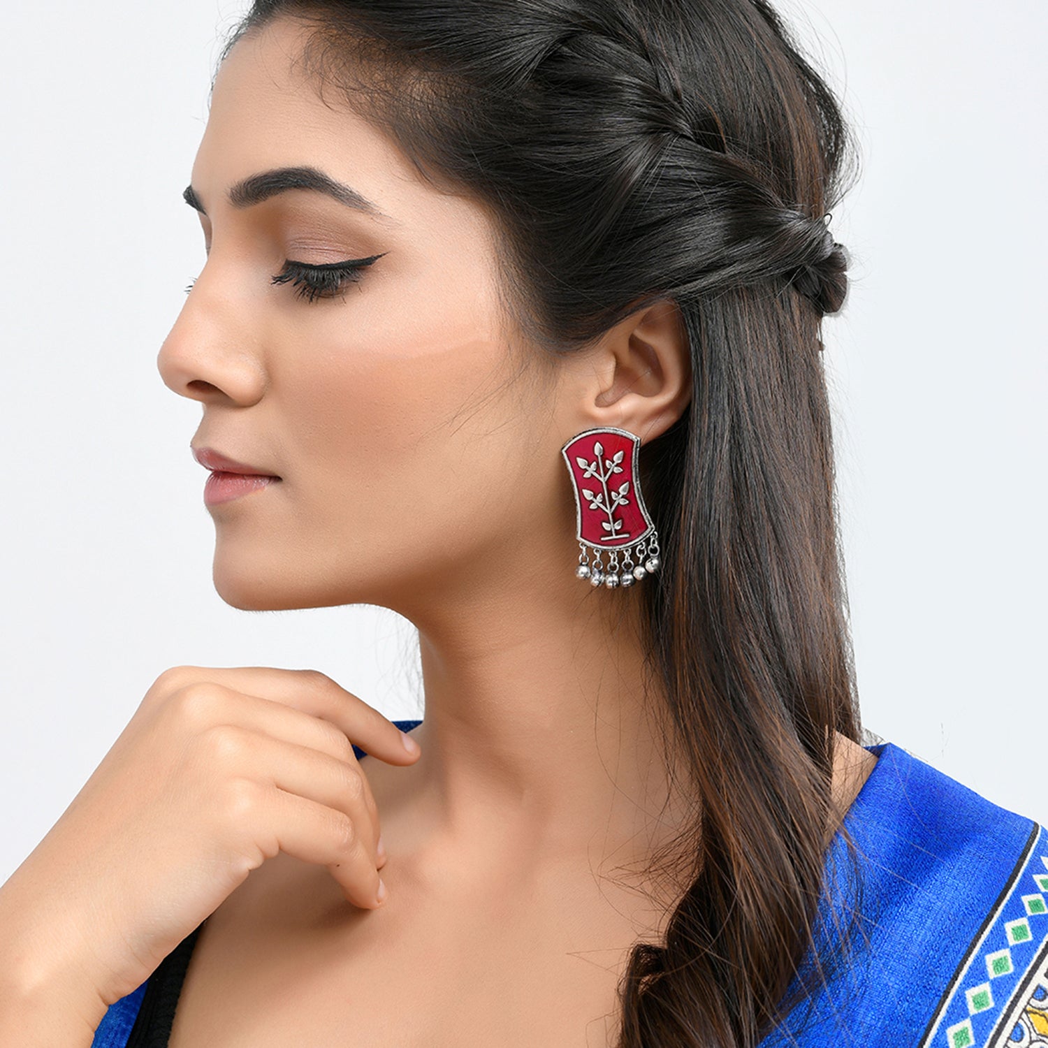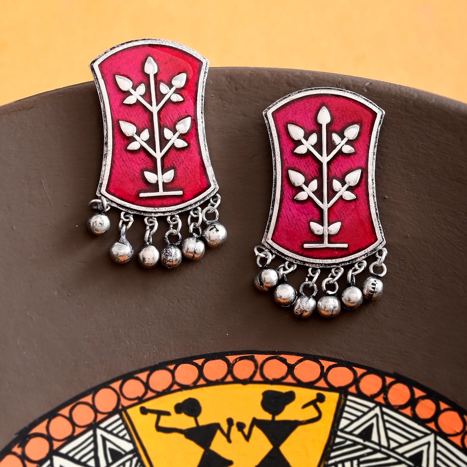 A glowing and fitting tribute to one of India's shining glories, the Warli artform, these enamelled earrings have been fashioned out of brass. Silver plating adds to the rustic charm of this pair, which features tribal motifs and can be paired with a wide range of looks and outfits.