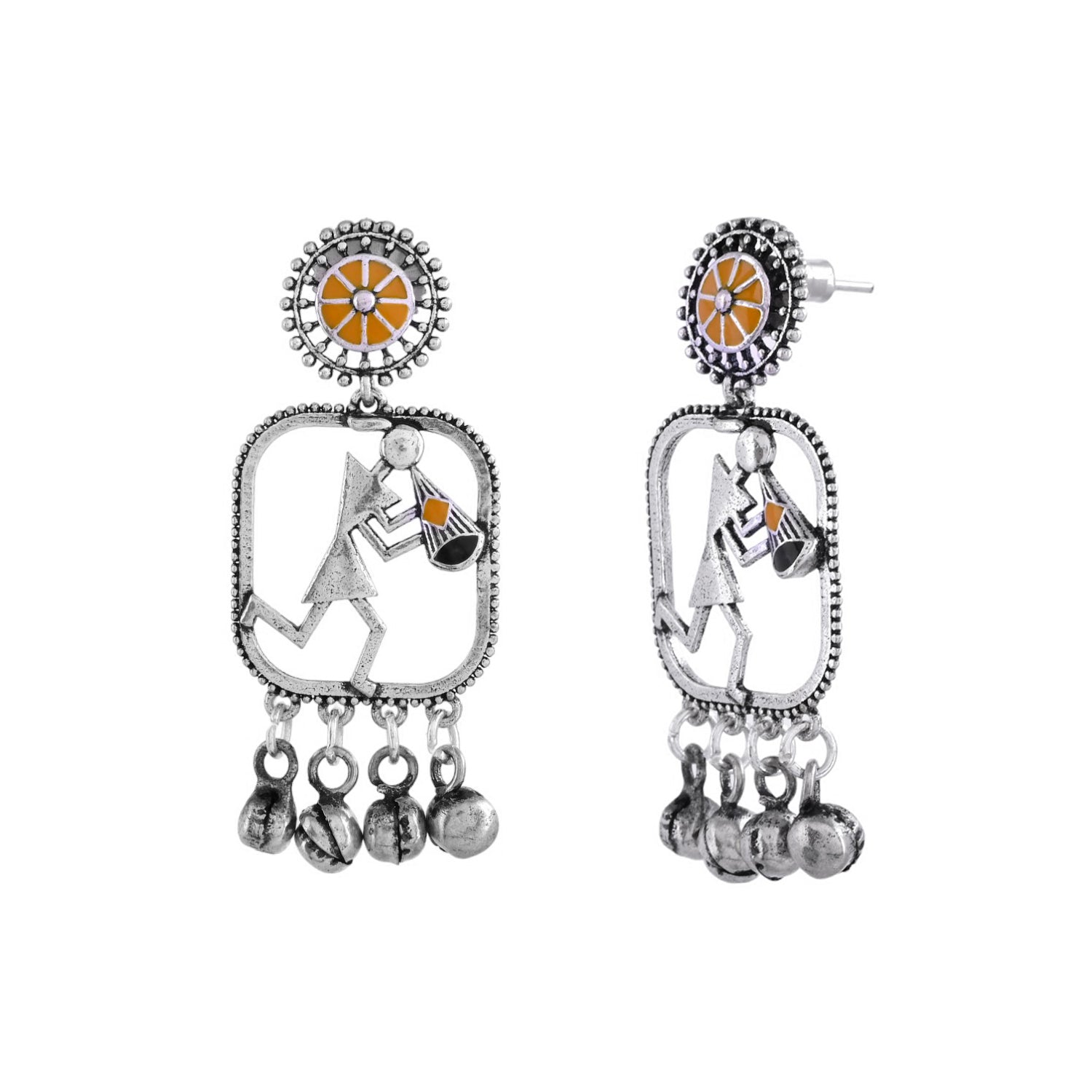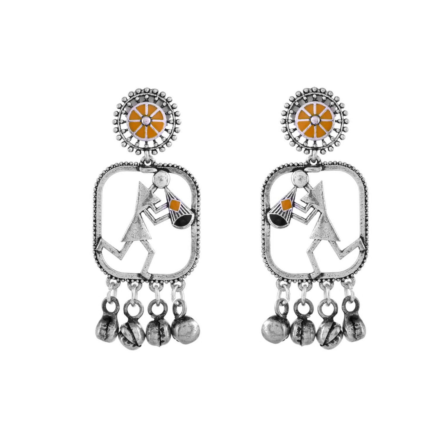 A celebration of India's heritage, these drop earrings have been inspired by the Warli artform. The perfect combination of Bohemian and tribal elements, the brass earrings have been given a silver plating. Enamel details add to the charm of this versatile pair.