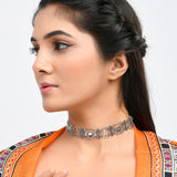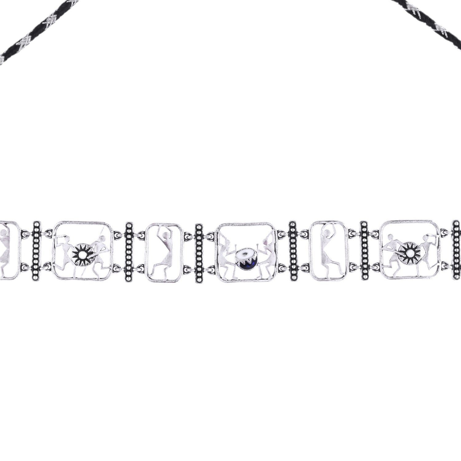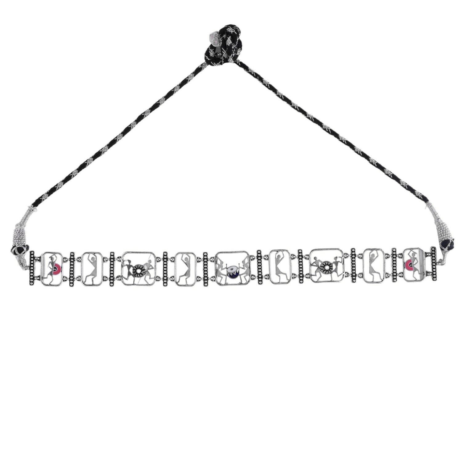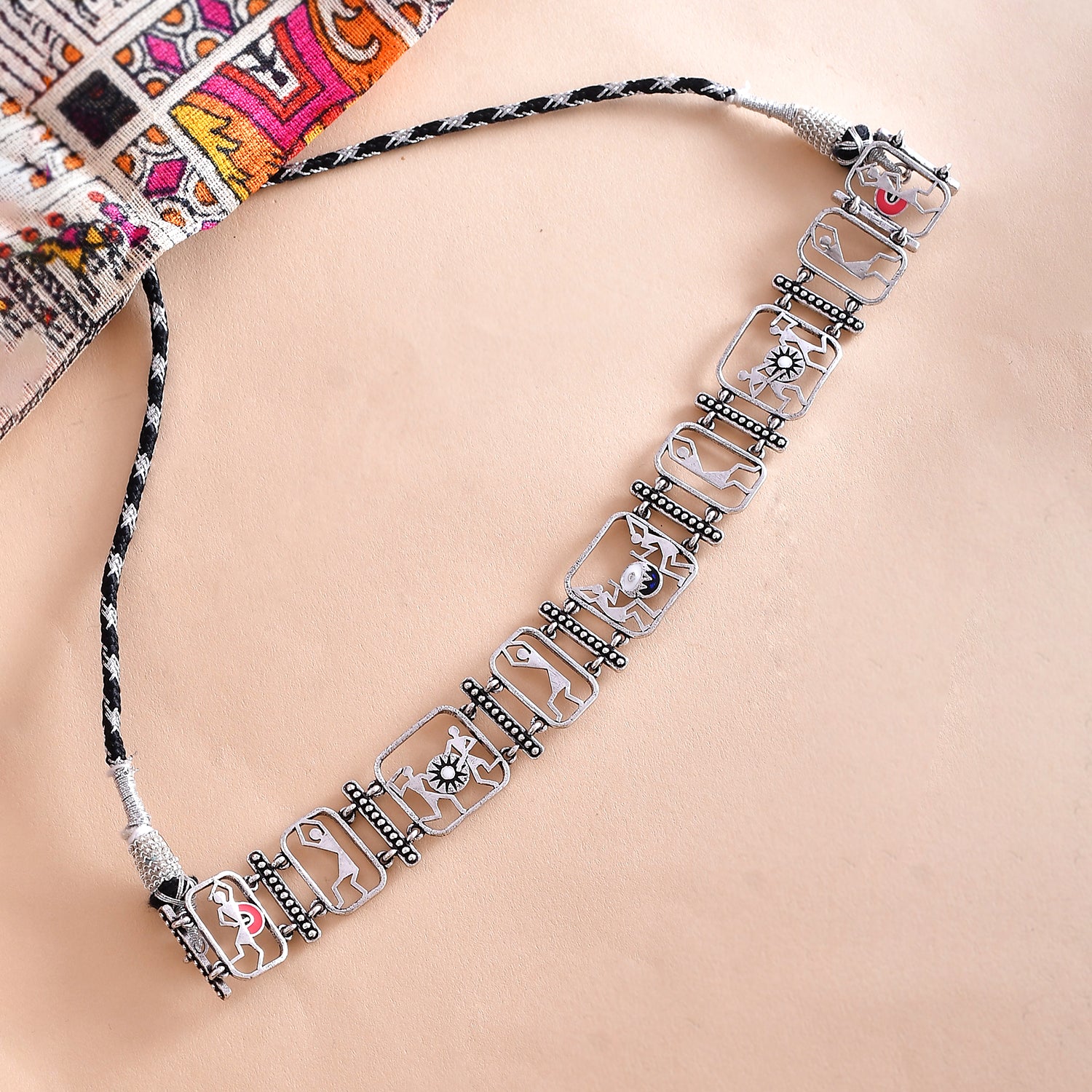 Charming minimalism and rustic grace meet in this choker necklace, which has been inspired by Warli artform and adorned with tribal motifs. Made from brass and silver plated, the necklace promises to be a comfortable wear at all times. Versatile enough to be paired with just about everything.