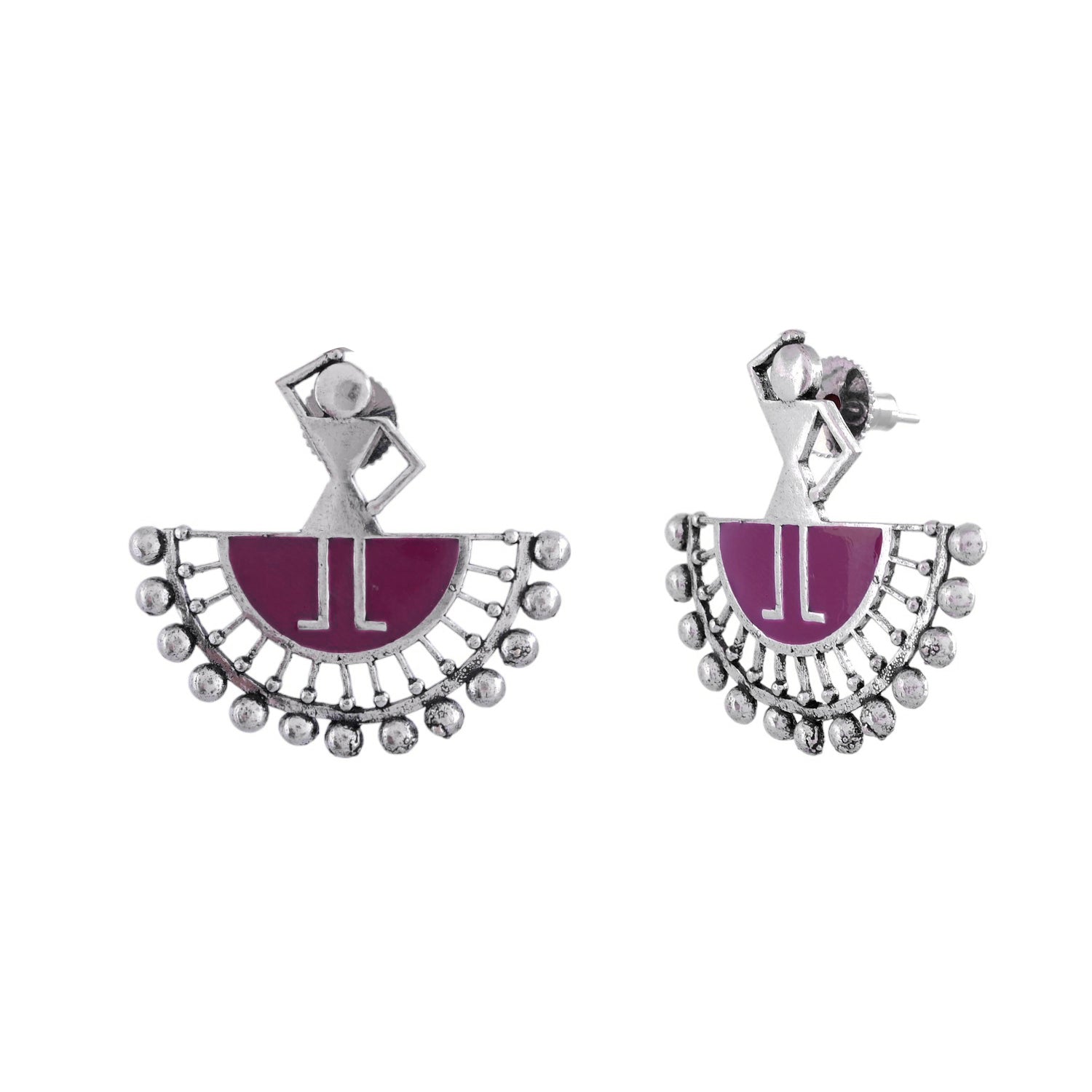 Grace and minimalism of the Warli artform have inspired these gorgeous tribal motifs earrings, which have been fashioned out of brass. Enamelled and silver plated, the pair is lightweight, comfortable and versatile.