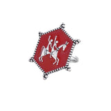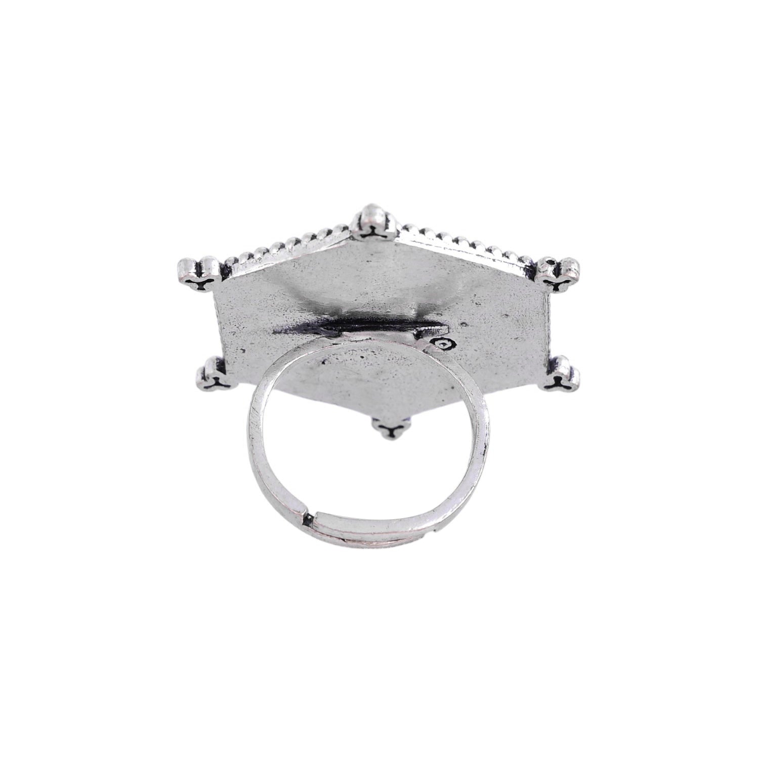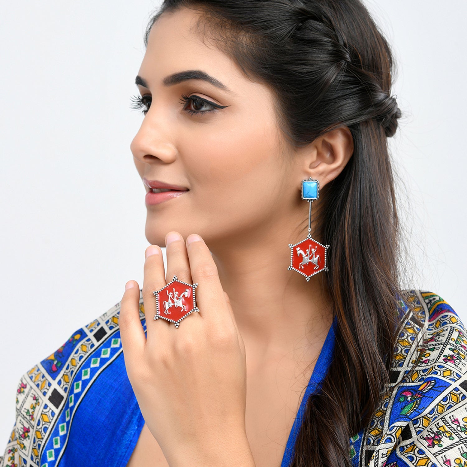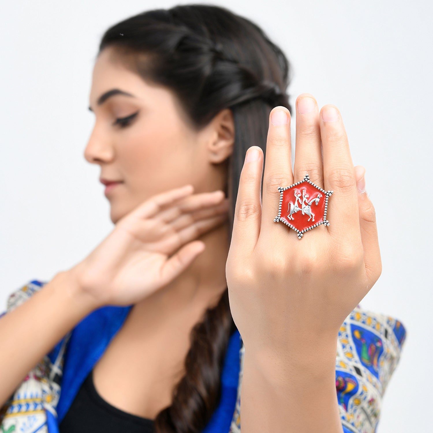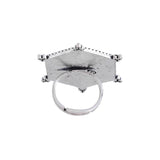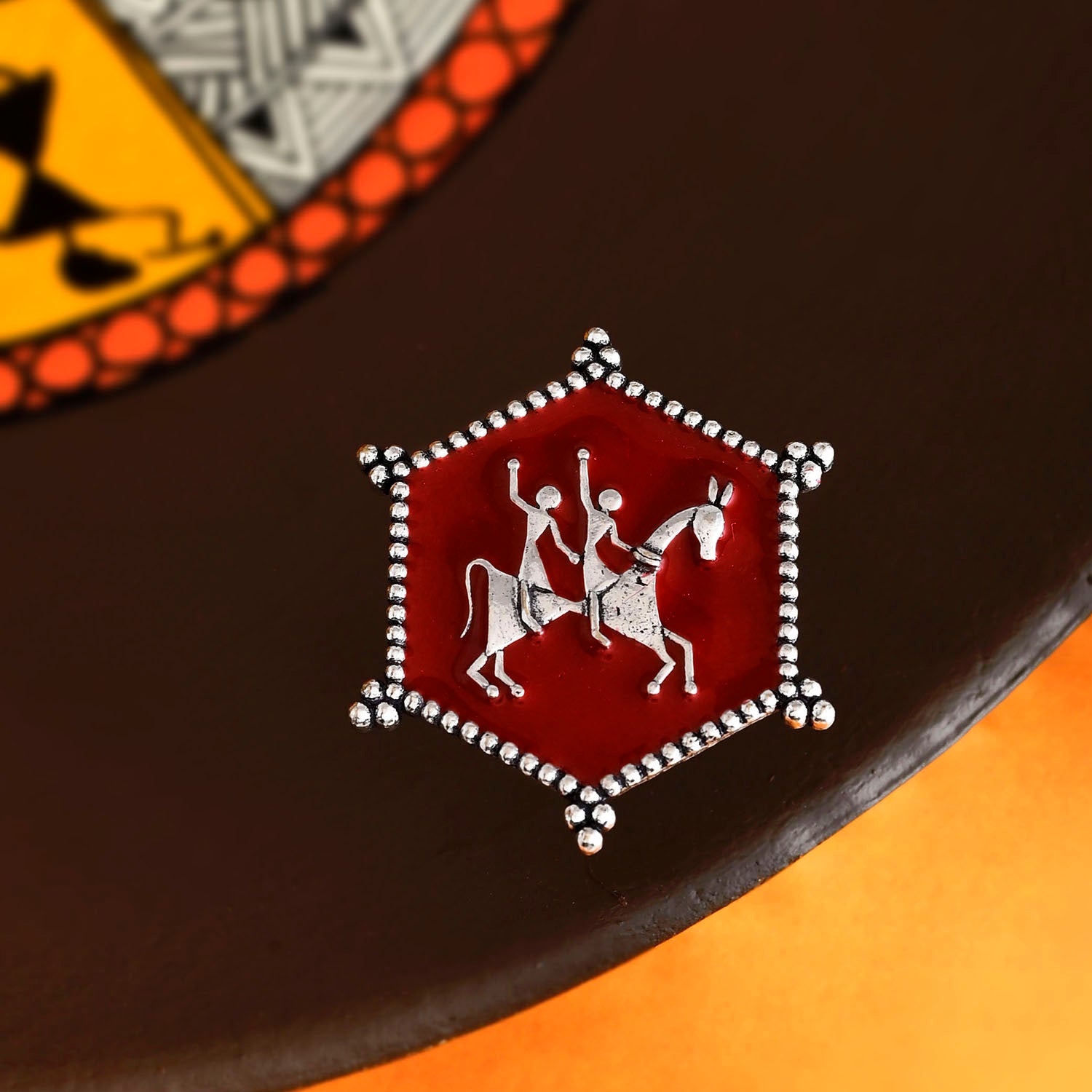 Enamelled statement ring, adorned with tribal motifs and designed as a tribute to the legendary artform of Warli. Made from brass and silver plated, the ring is adjustable for maximum comfort and can be paired with a wide range of looks and outfits.
