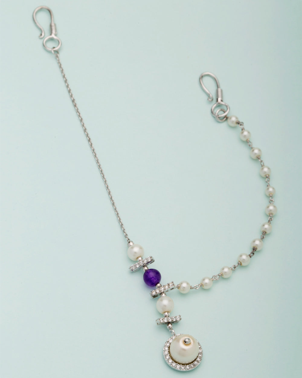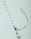 Voylla present silver plated matha patti that is studded with white & blue pearl, gemstone and has an exquisite details.It is beautifully studded with American Diamond stone and linked with white pearl. It is a beautiful round design in center with white pearl. The matha patti is typically worn by brides and it makes feel you like a princes.