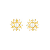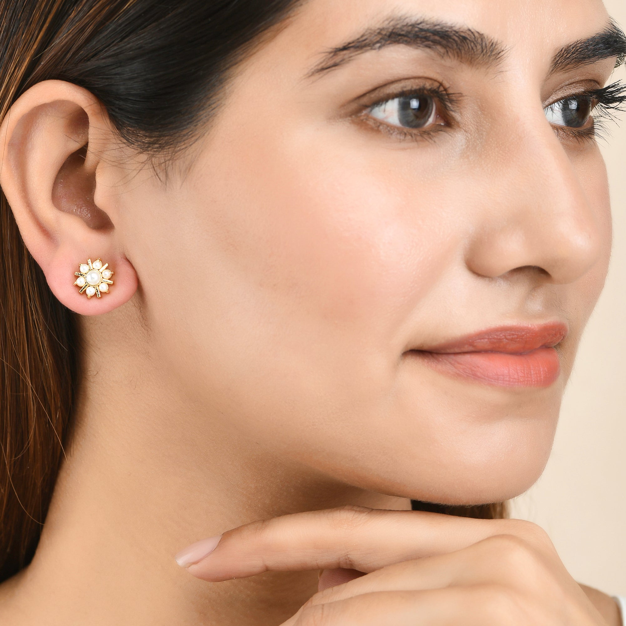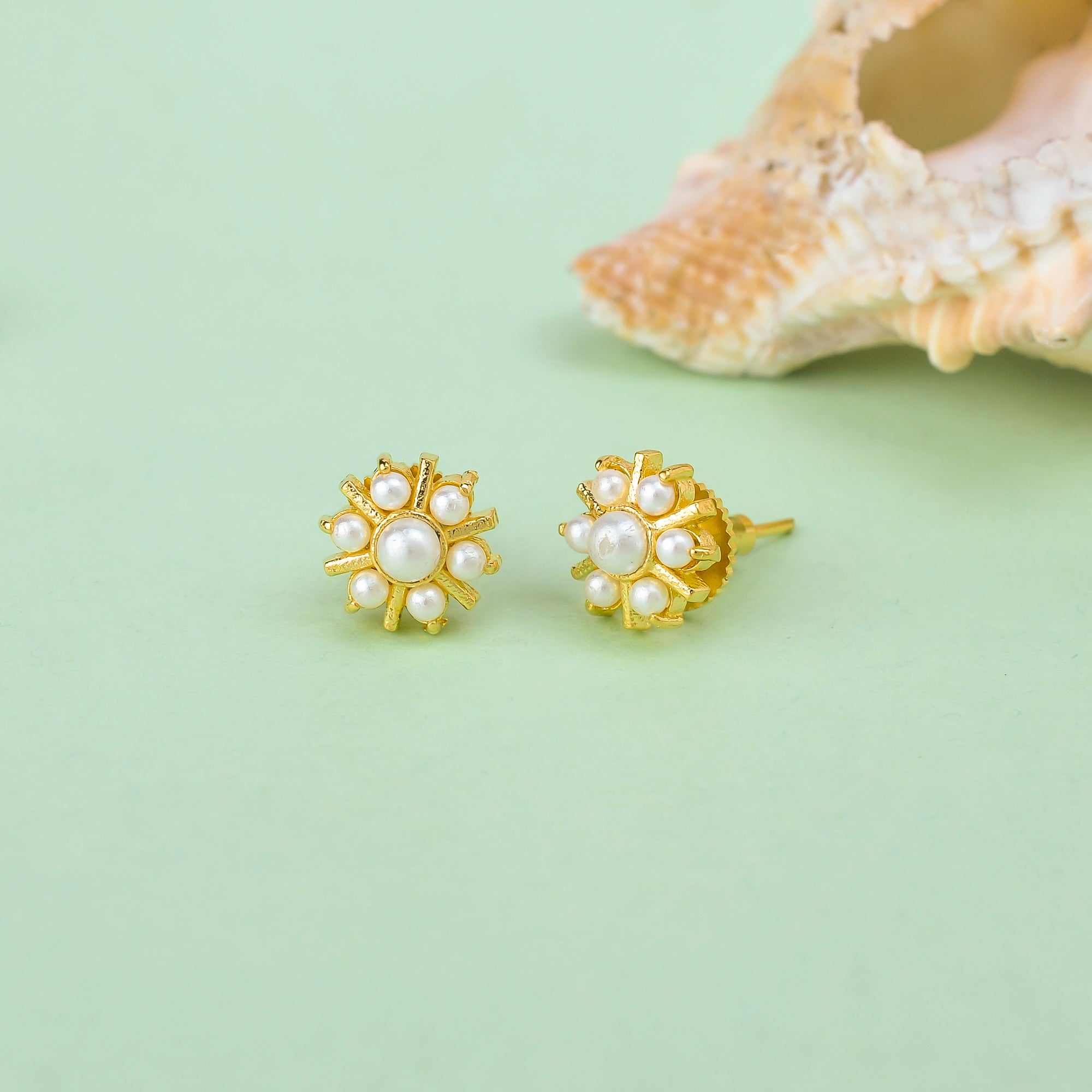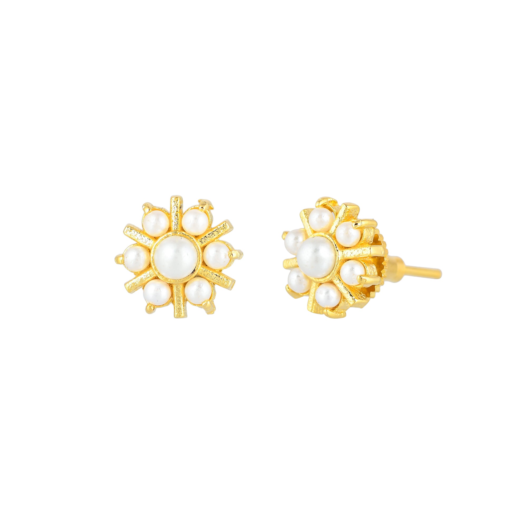 Gold plated white pearl beaded stud earrings, fashioned out of brass. Pair with ethnic attire.
