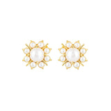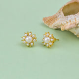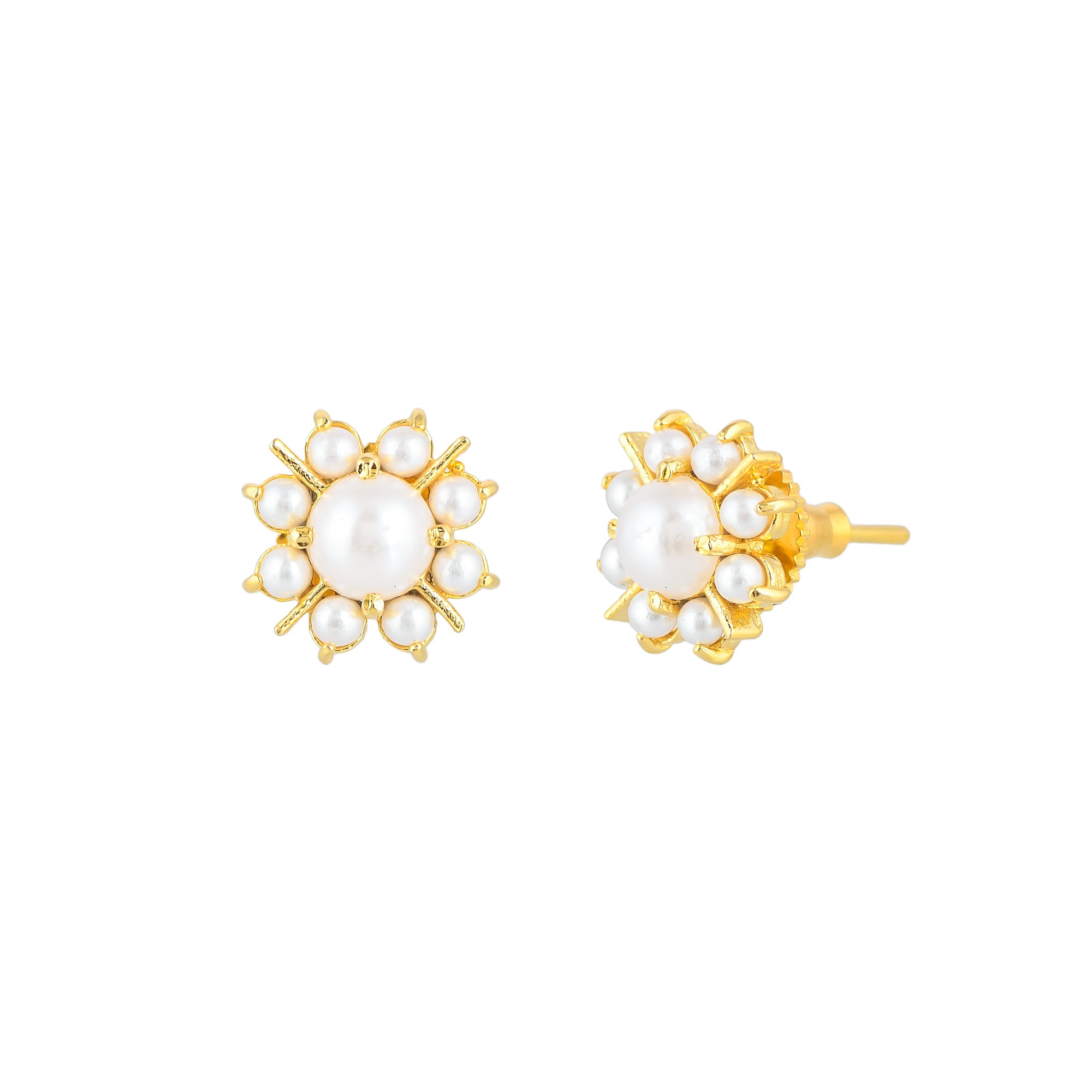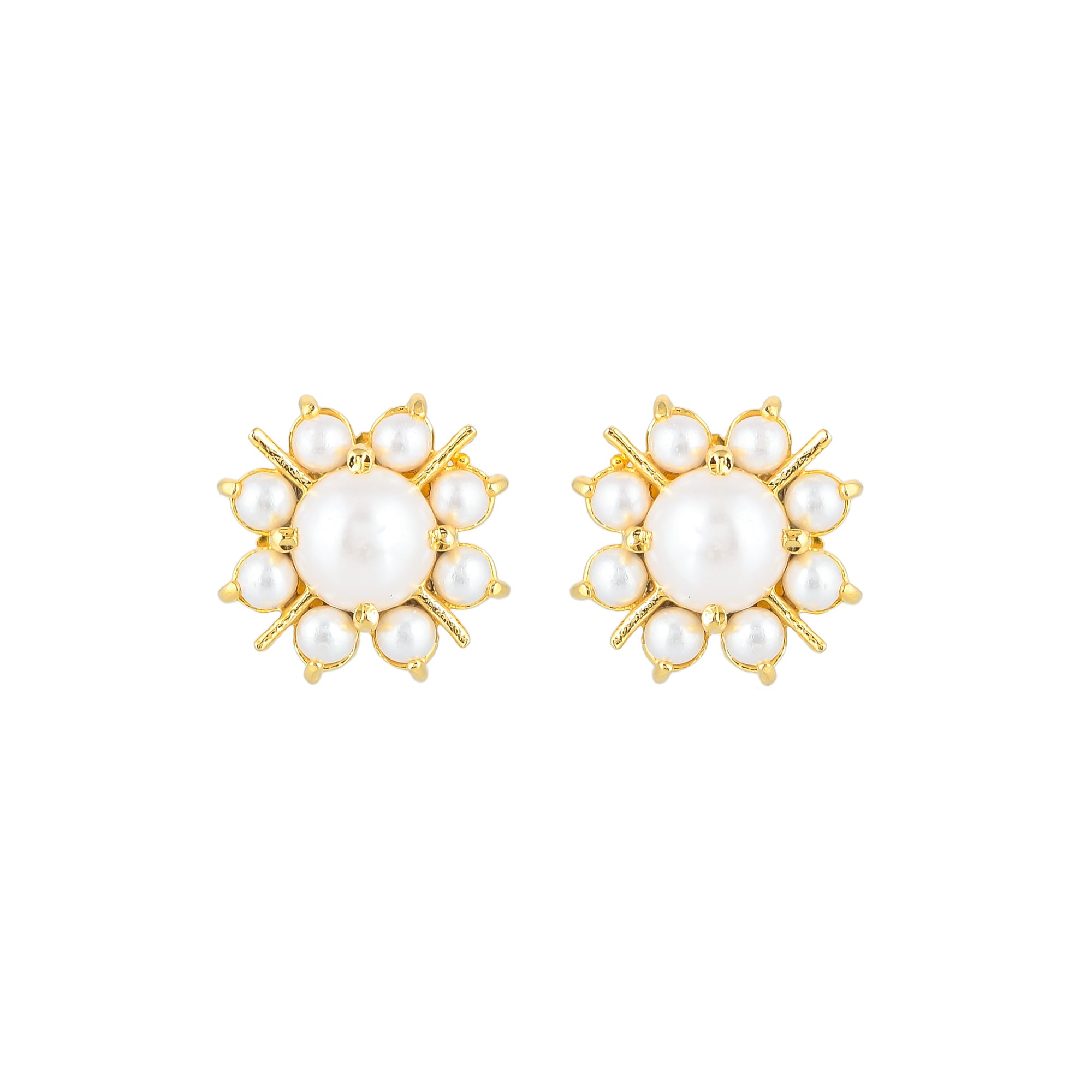 White pearl beads adorned yellow gold plated stud earrings. Fashioned out of brass. Wear with everyday attire.