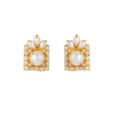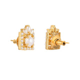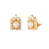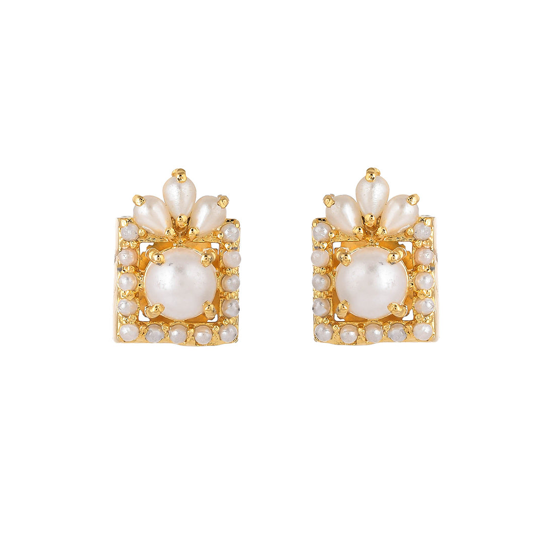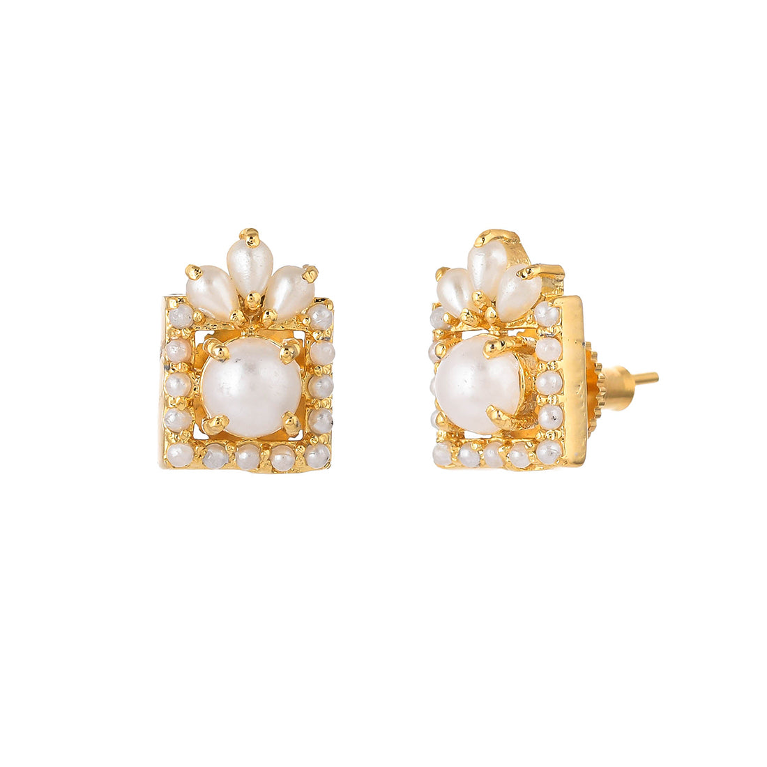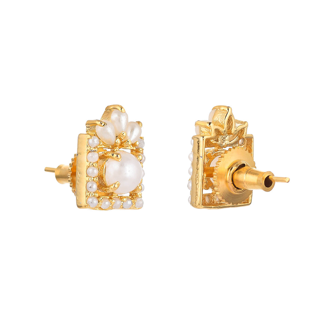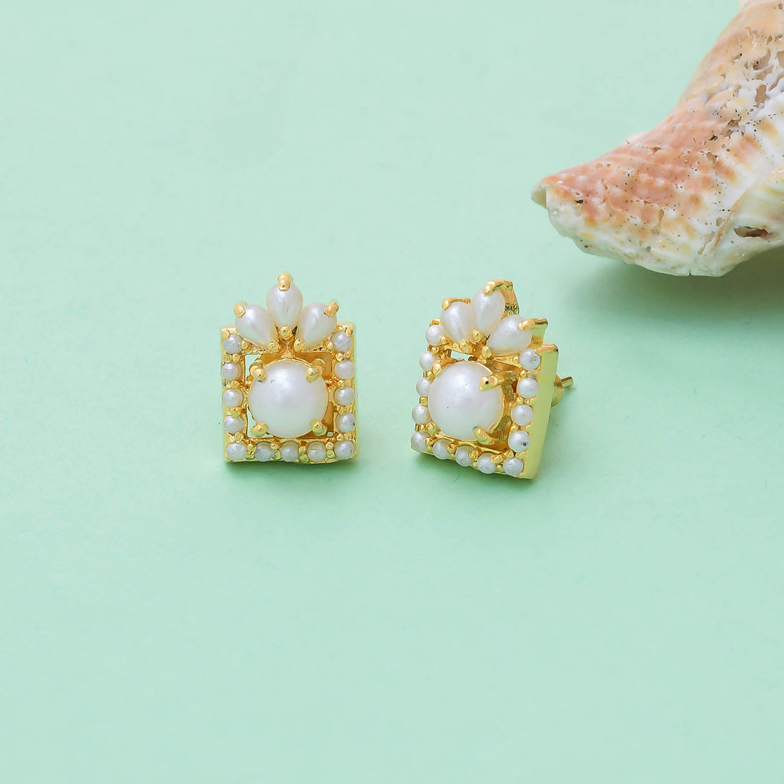 Yellow gold plated stud earrings with white pearl beads. Made from brass, the earrings can be paired with just about everything.