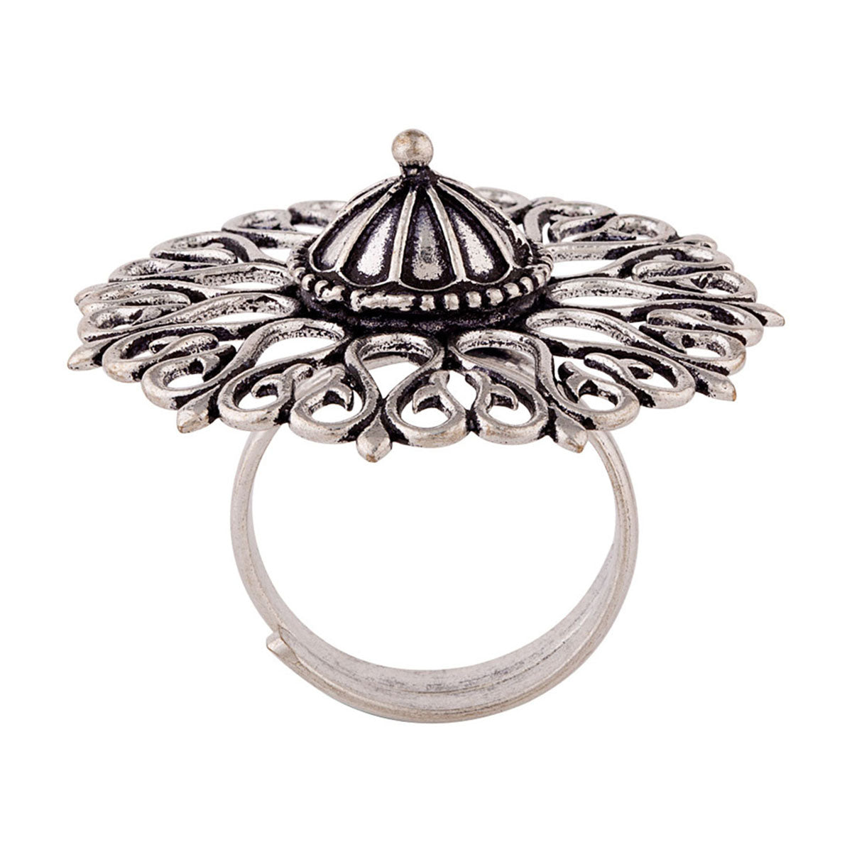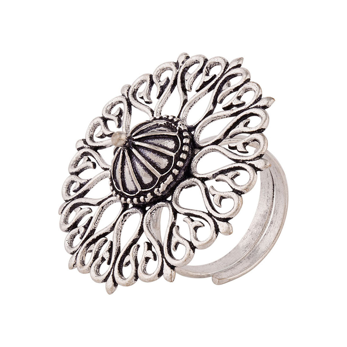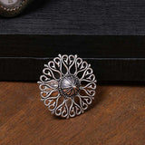 Brass ring with cutwork, shaped into a floral motif. Oxidised silver plated, lightweight and perfect for everyday wear.