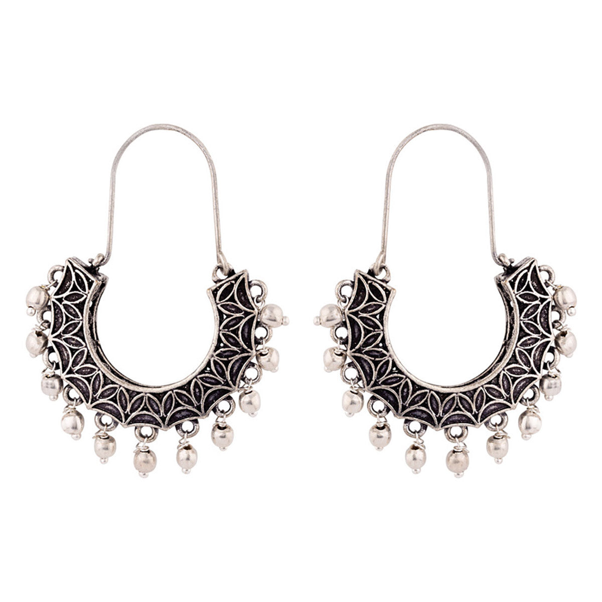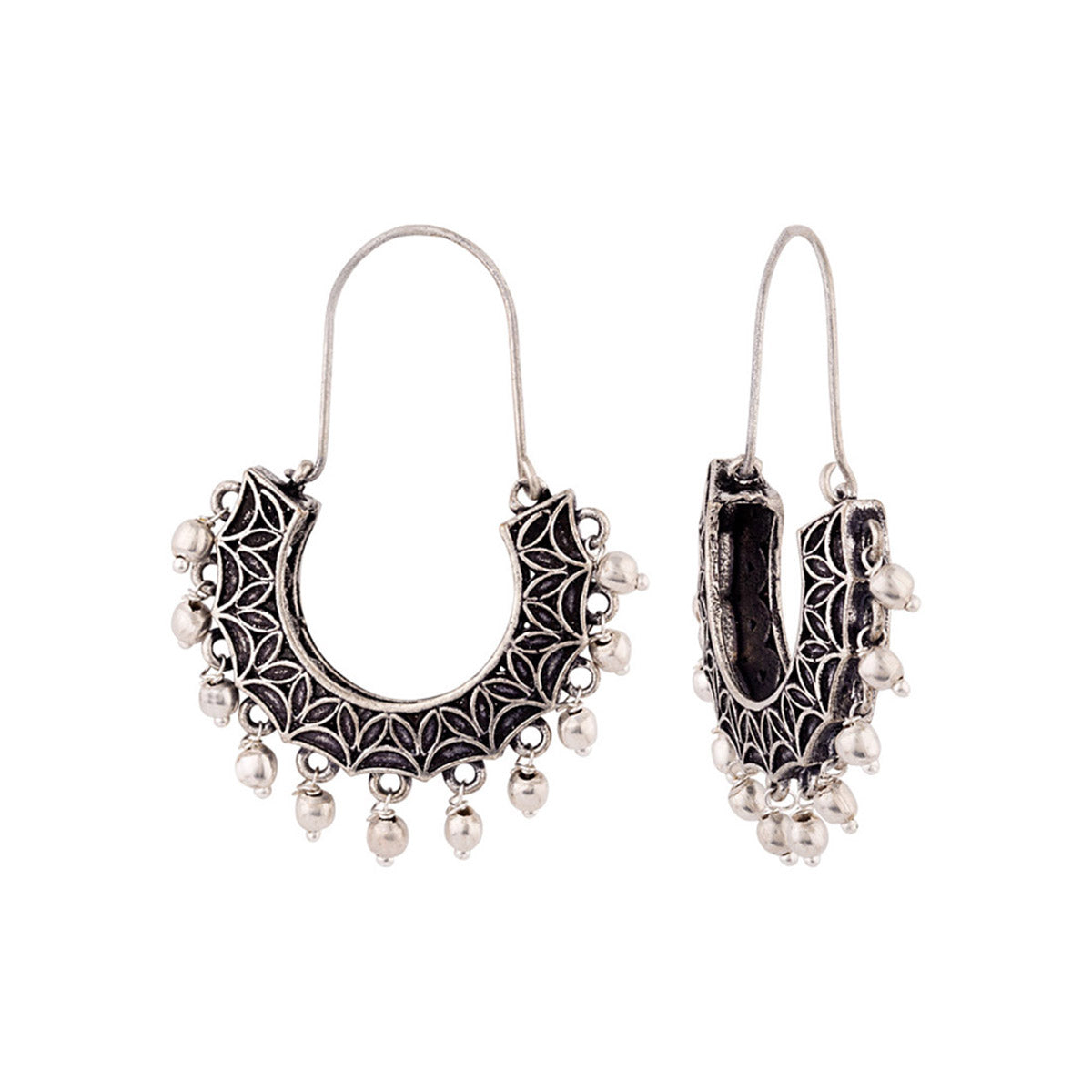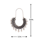 Featuring light metal embellishments, these brass hoop earrings have been given an oxidised silver plating. Pair with a casual kurta or saree.