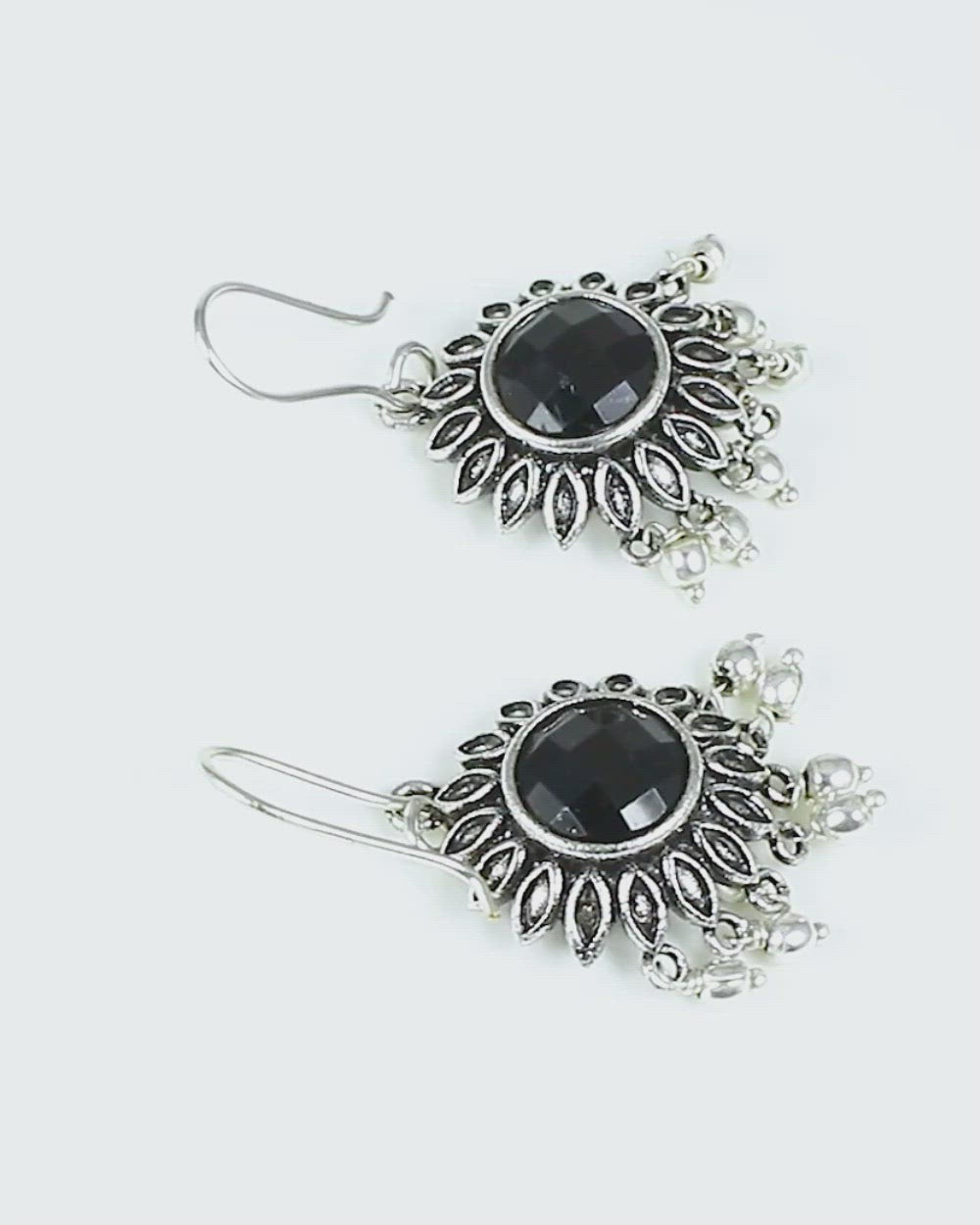 Embellished with a single round cut black gem, these earrings have been crafted from brass. Oxidised silver plated and perfect for everyday wear.