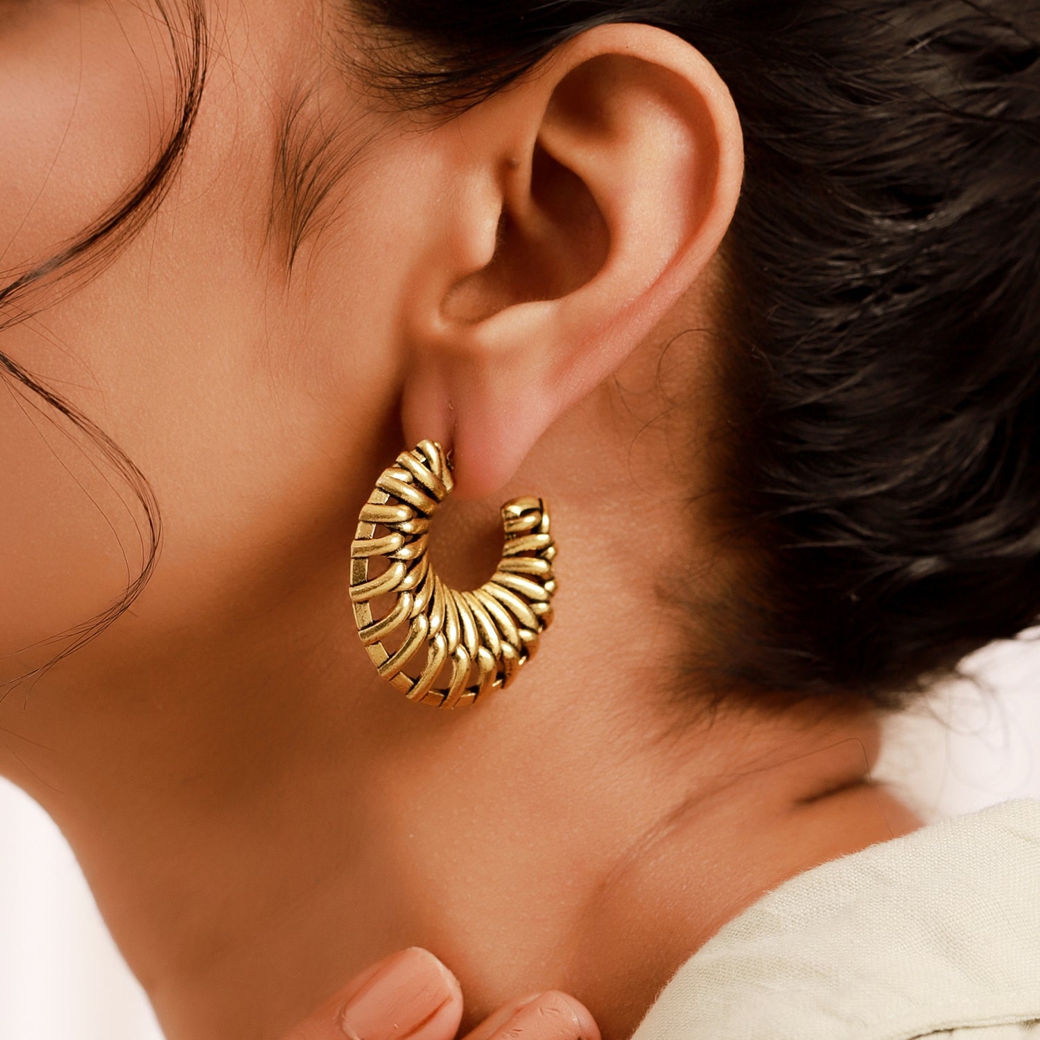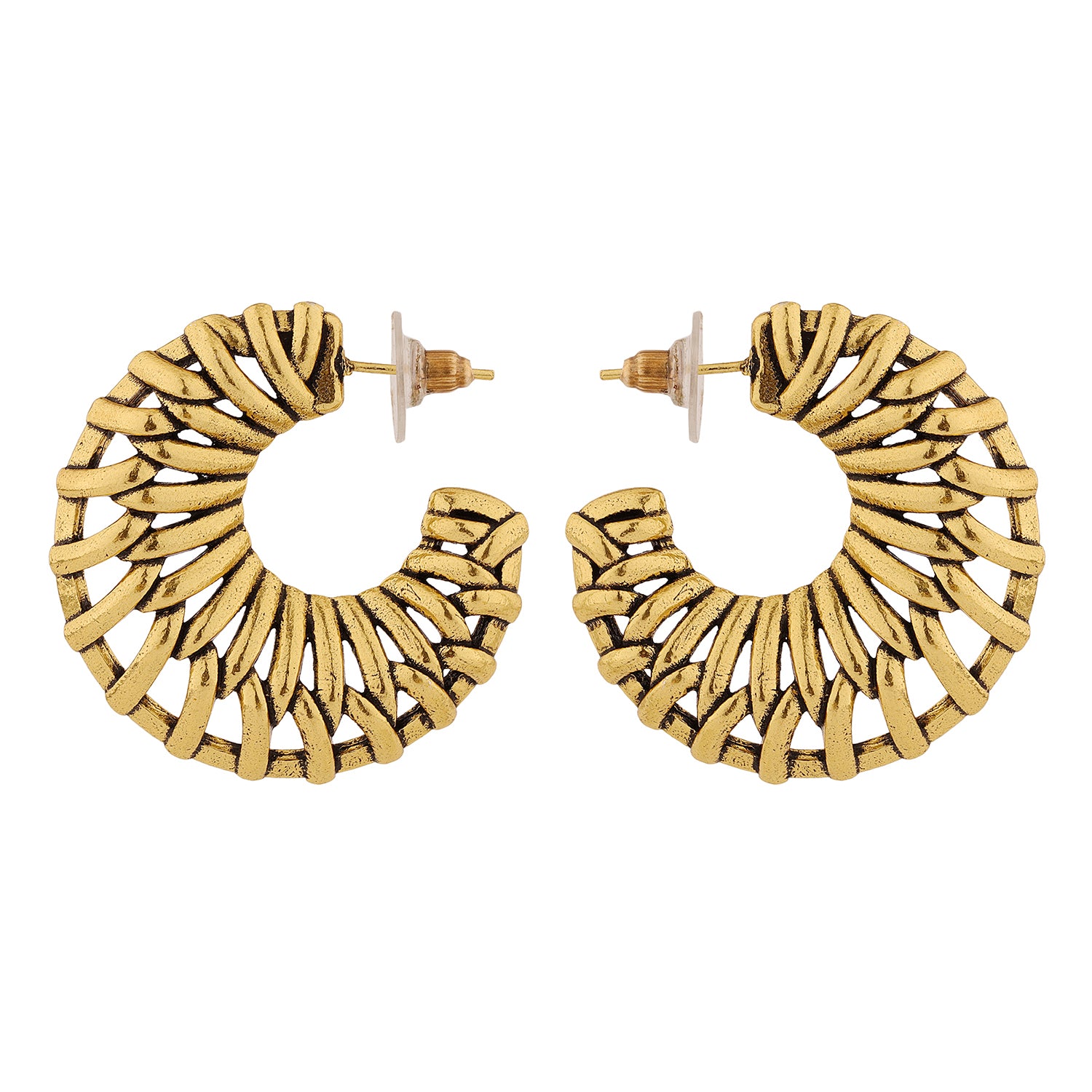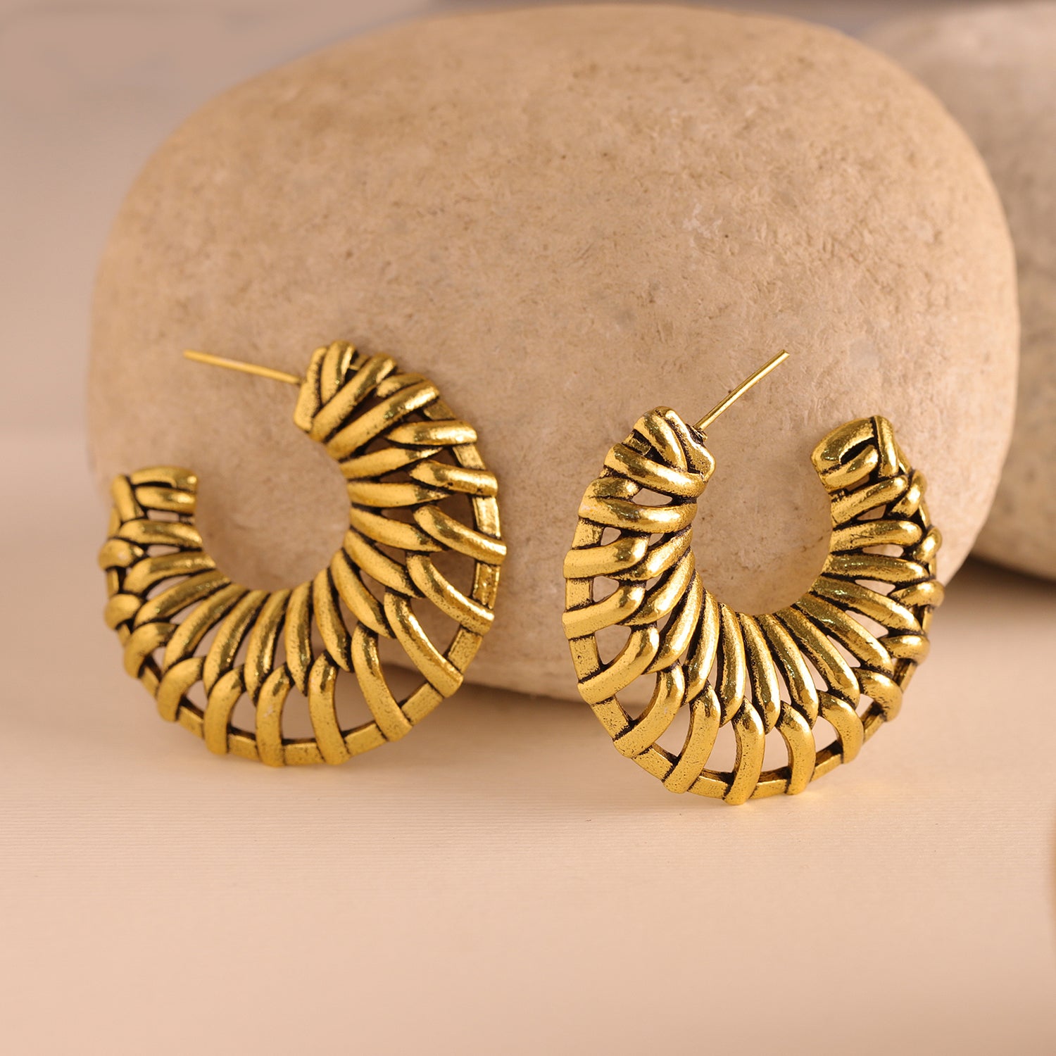 Introducing the Woven Wonder Plain Dutched Weave Hoop Earrings, a stunning addition to any jewelry collection. These earrings are meticulously crafted from high-quality brass and feature a beautiful gold oxidized plating that exudes elegance and sophistication. The intricate dutched weave design showcases the artistry and attention to detail, making these earrings a true statement piece. Perfect for everyday wear or special occasions, these boho-chic earrings add a touch of glamour to any outfit. Whether you're dressing up for a vacation, office, or a casual outing, these versatile earrings are sure to complement your style. They make an excellent gift for women, suitable for occasions like Valentine's Day, Diwali, Rakshabandhan, Christmas, New Year, and more. Surprise your loved ones, be it your sister, girlfriend, wife, or mother, with these exquisite earrings that embody both beauty and craftsmanship.