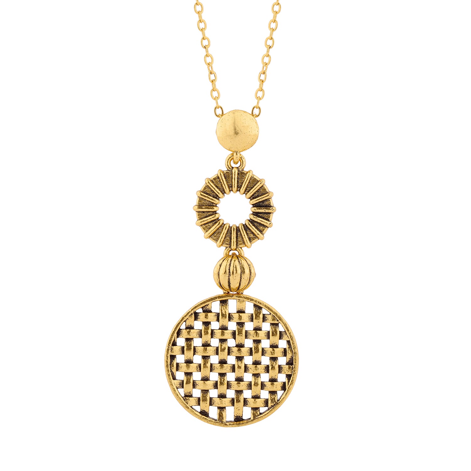 Introducing the Woven Wonder Plain Weaving Pendant, a stunning masterpiece from our Woven Wonder collection. This pendant showcases a meticulous design inspired by traditional basket weaving, embodying the essence of craftsmanship and heritage. Encased in a circular gold oxidized brass frame, the pendant features an intricately detailed woven pattern that exudes both elegance and sophistication. The pendant is suspended from a delicate gold-plated chain, adding a touch of refined charm to your neckline. Perfect for everyday wear, this boho-chic pendant effortlessly elevates casual and office attire, making it a versatile addition to any jewelry collection. The warm, gold oxidized finish adds a timeless appeal, making it an ideal gift for women on various occasions such as Valentine's Day, Diwali, Rakshabandhan, Christmas, and New Year. Whether you're looking for a thoughtful gift for your sister, girlfriend, wife, mother, or a special treat for yourself, this pendant is sure to impress with its timeless beauty and exceptional craftsmanship. Embrace the elegance of woven artistry and make a statement with this exquisite pendant.