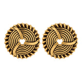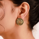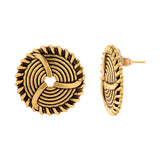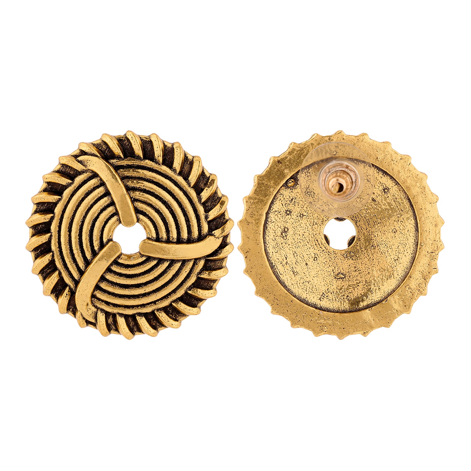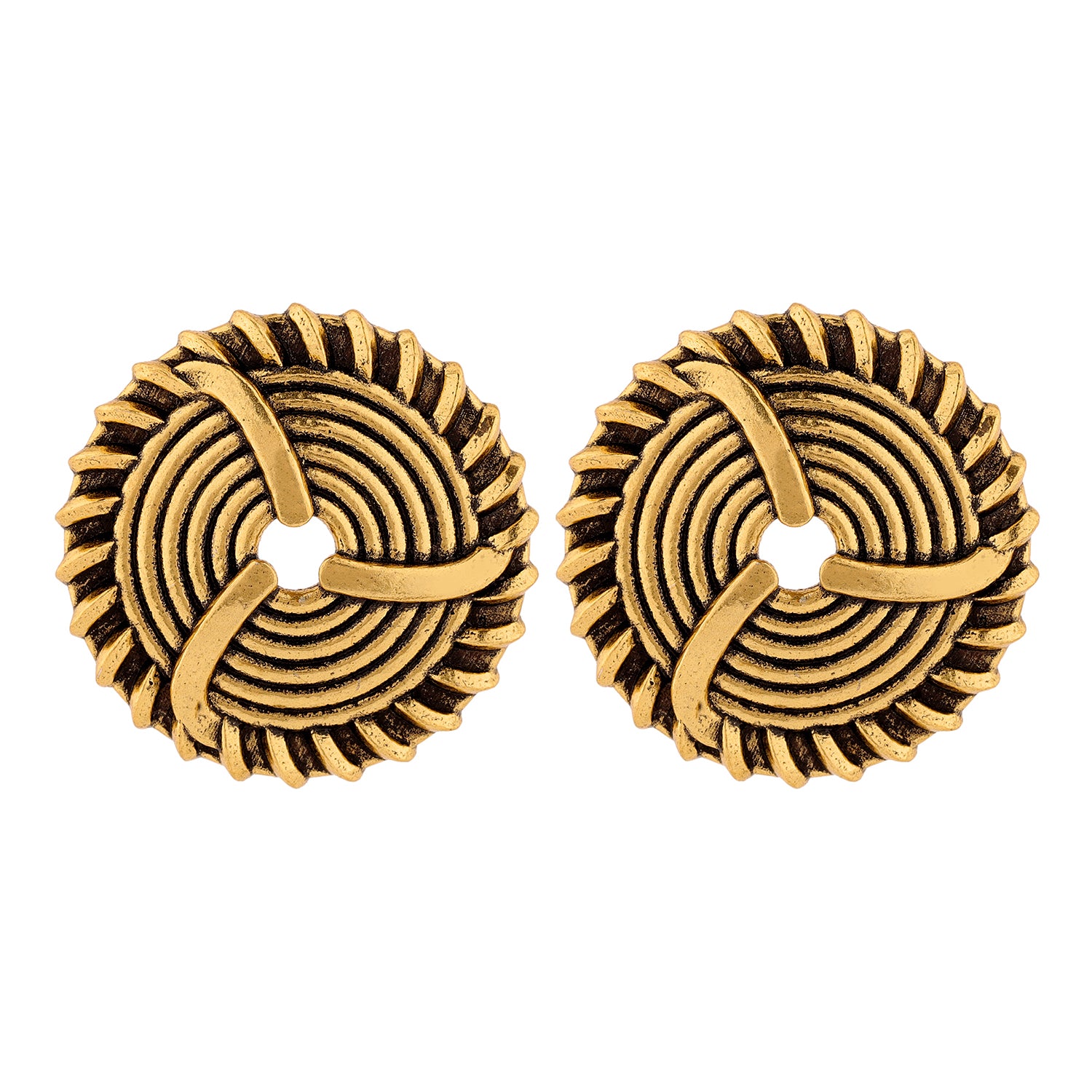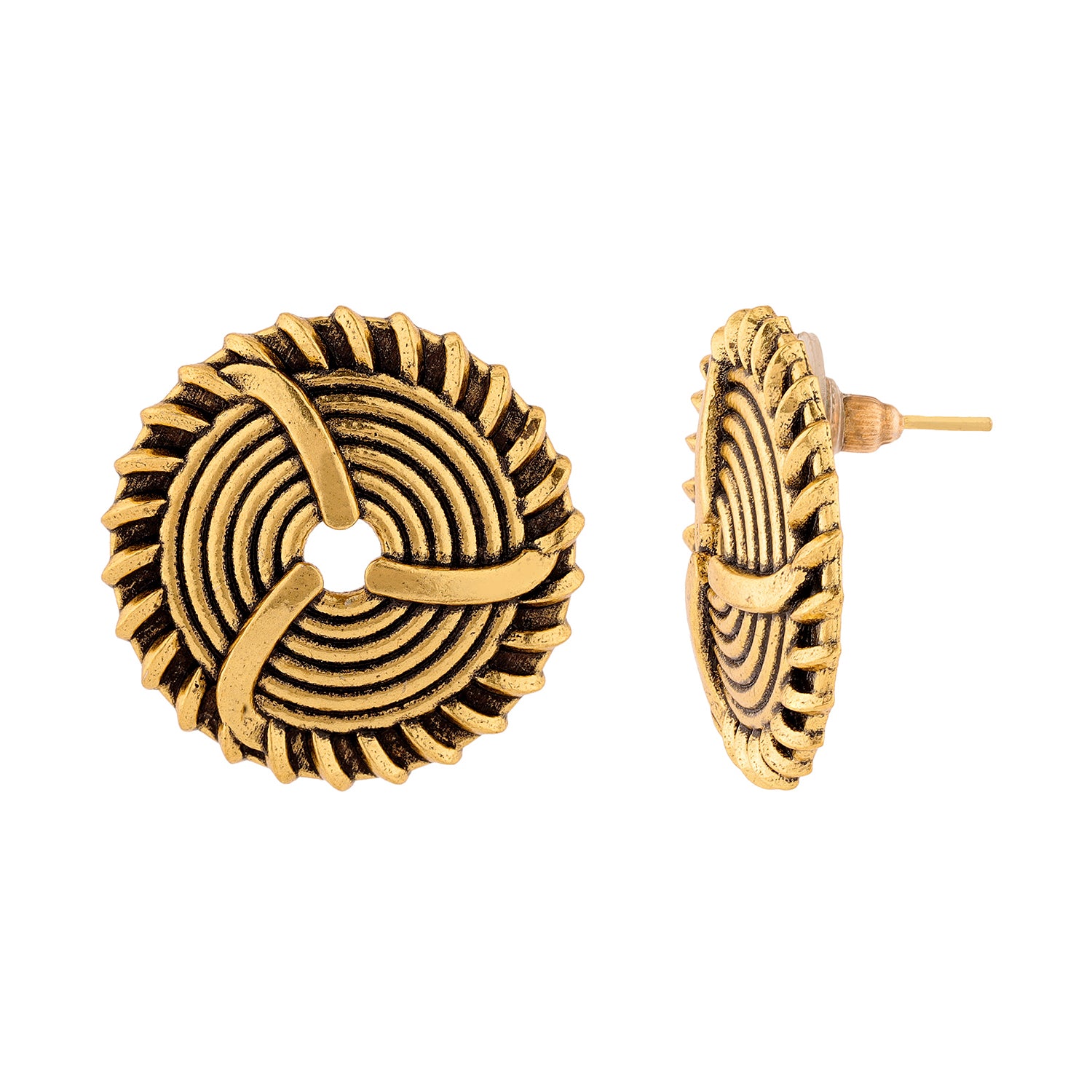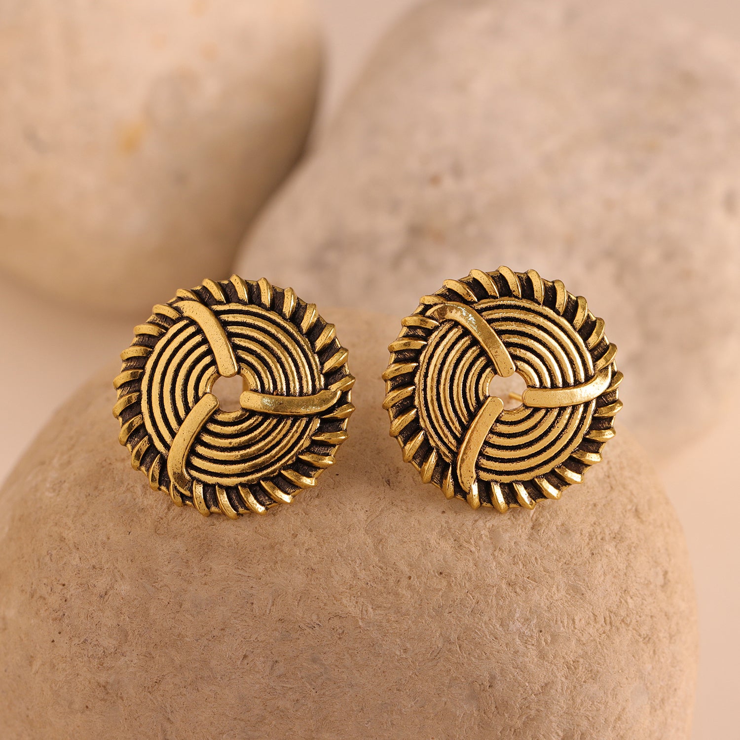 Introducing the Woven Wonder Swirled Stud Earrings, a stunning addition to your jewelry collection. Crafted from high-quality brass and plated with a chic gold oxidized finish, these earrings feature an intricate circular pattern inspired by the art of basket weaving. Their captivating design, part of the Woven Wonder collection, celebrates the beauty of natural patterns and the craftsmanship of woven forms. Perfect for both everyday wear and special occasions, these boho-chic earrings effortlessly elevate your style. Ideal for gifting, these statement earrings make a thoughtful present for any woman on occasions like Valentine's Day, Diwali, Rakshabandhan, Christmas, and New Year. Their timeless appeal complements both Western and ethnic outfits, making them a versatile and stylish accessory for vacation wear, office jewelry, or a special celebration. Embrace elegance and artistry with the Woven Wonder Swirled Stud Earrings, where traditional craftsmanship meets modern aesthetics.