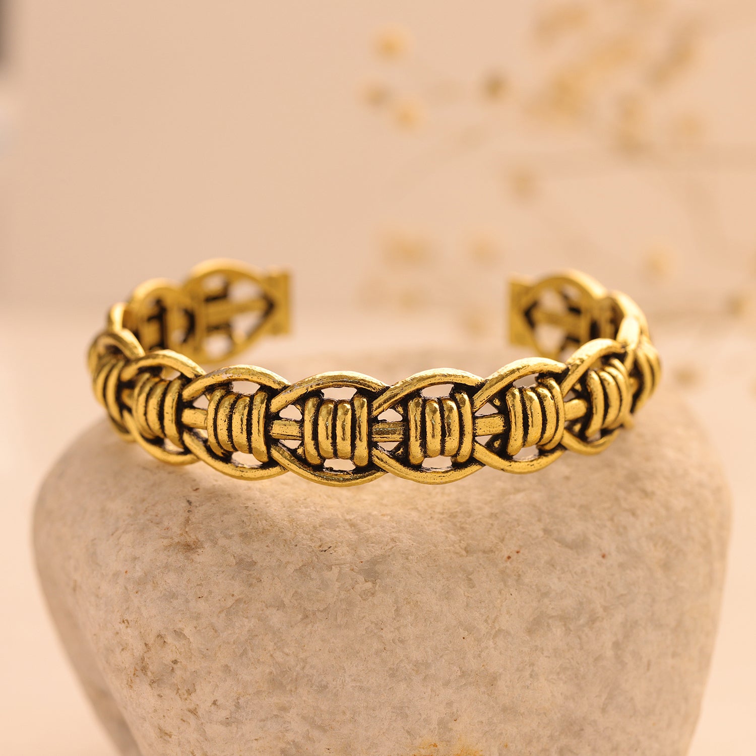 Celebrate the artistry of design with the Woven Wonder Weaved Cuff Bracelet, a true masterpiece for any jewelry lover. This bracelet features an intricate woven pattern that reflects the detailed craft of basket weaving, meticulously constructed from high-quality brass and adorned with a luxurious gold oxidized finish. As part of the Woven Wonder collection, this boho bracelet is perfect for everyday wear, adding a touch of elegance and sophistication to your casual and office looks. The gold oxidized plating not only enhances its aesthetic appeal but also ensures durability, making it a timeless addition to your jewelry collection. Whether paired with a chic outfit for a casual outing or styled as statement office jewelry, this bracelet complements any wardrobe effortlessly. Perfect for gifting on occasions like Valentine's Day, Diwali, Rakshabandhan, Christmas, and more, it's an ideal present for sisters, mothers, girlfriends, wives, and friends. Embrace the organic shapes and natural patterns of traditional basketry with the Woven Wonder Weaved Cuff Bracelet, where every detail speaks of craftsmanship and elegance.