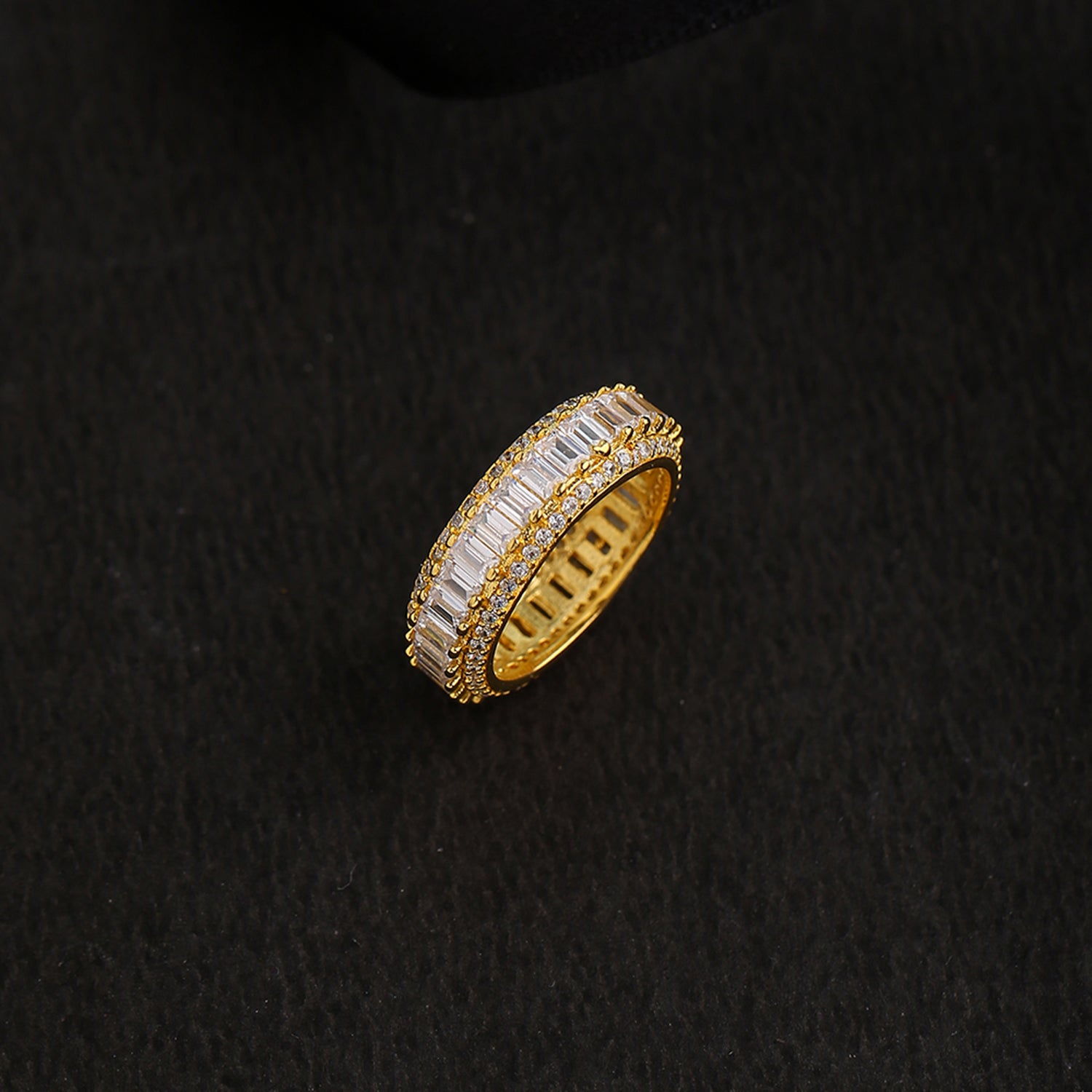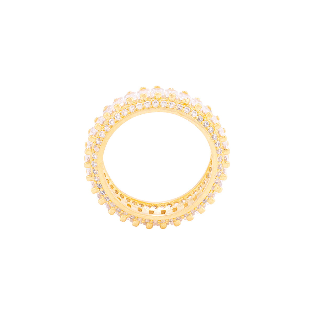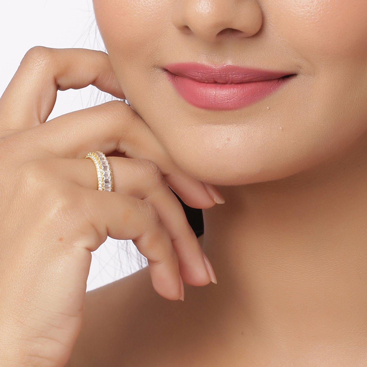 Band ring, embellished with zircon gemstones and yellow gold plated. Fashioned out of brass and good for everyday wear. This piece of jewelry comes with the Voylla assurance of quality and durability.
