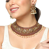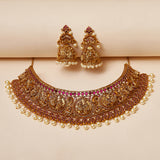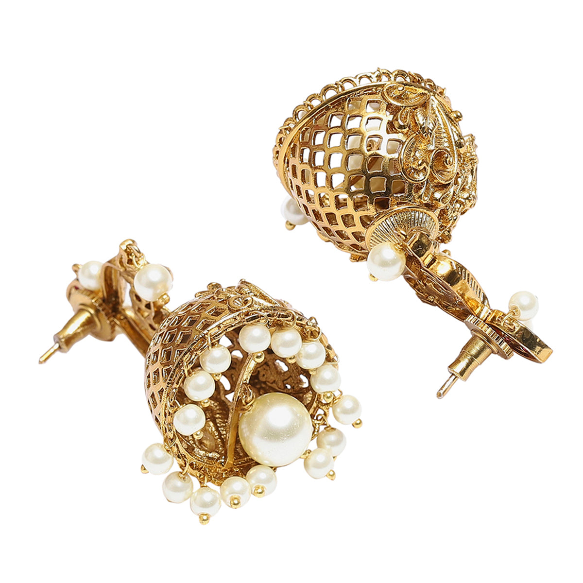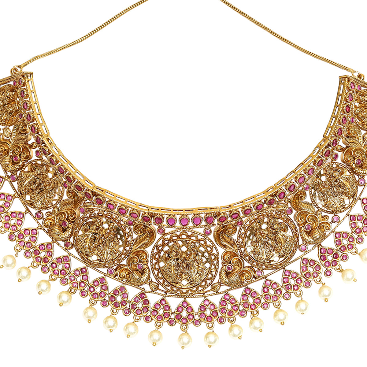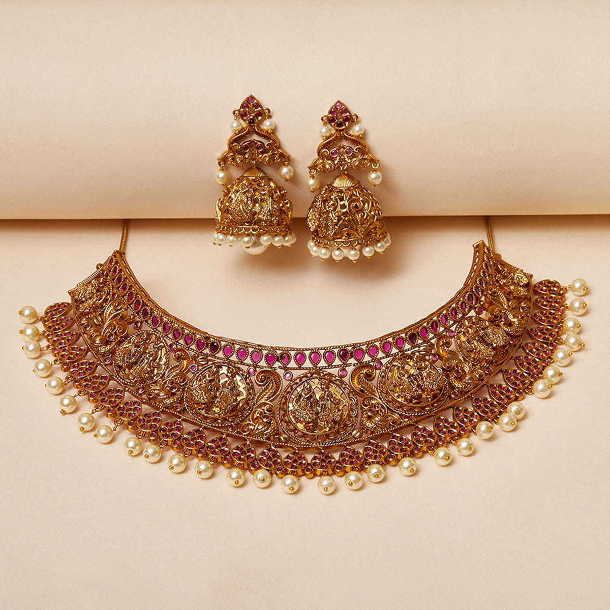 Brass jewellery set, fashioned after opulent antique jewellery pieces and adorned with faux pearls. The necklace and jhumka earrings have been given a lovely yellow gold plating. Pair the set with a traditional silk saree.