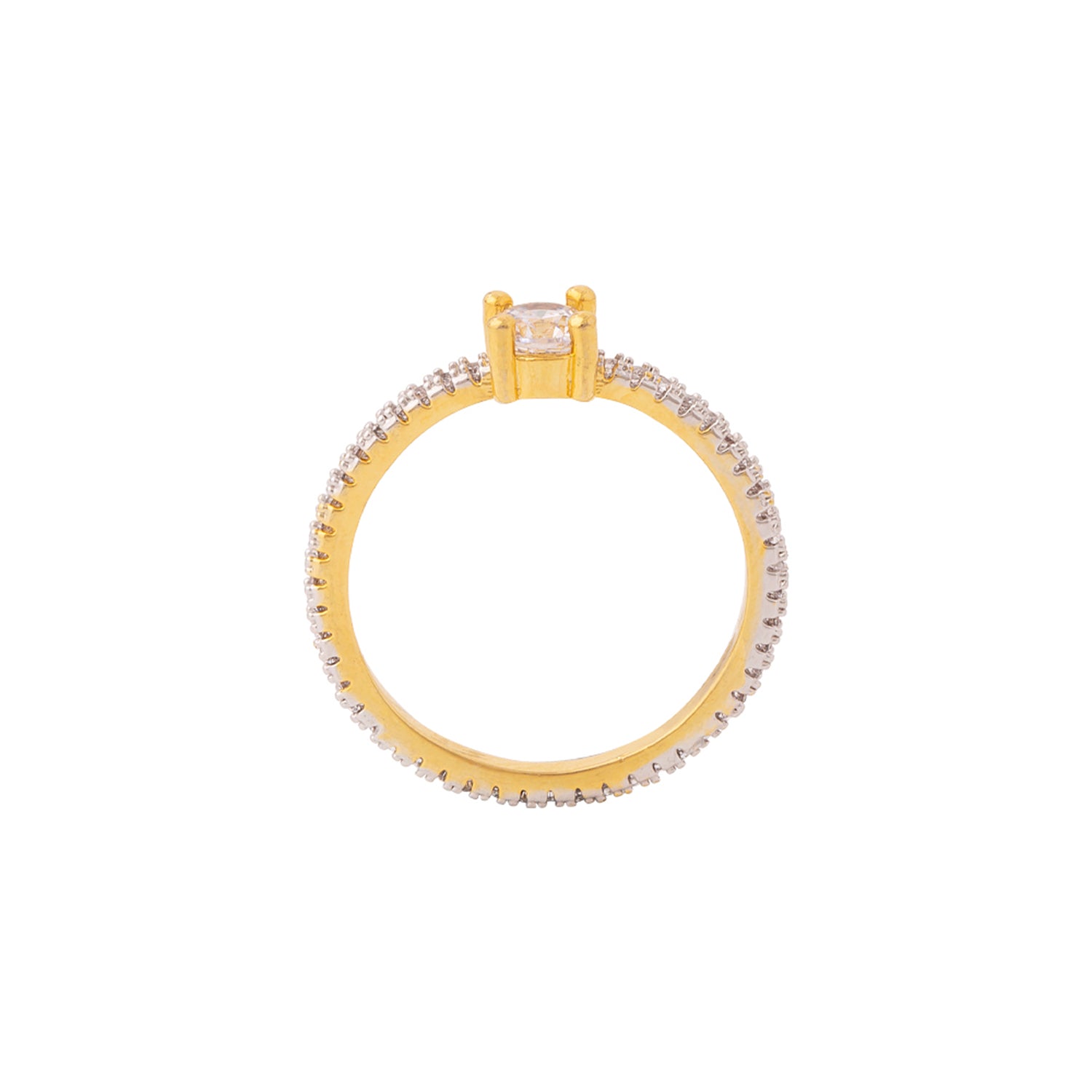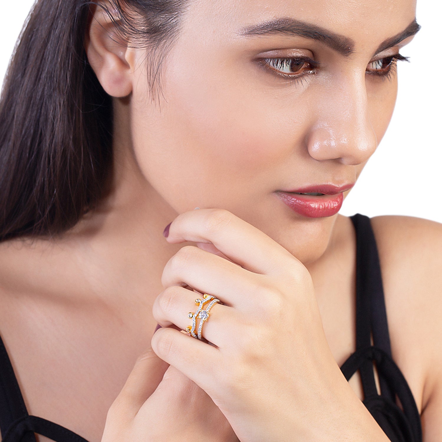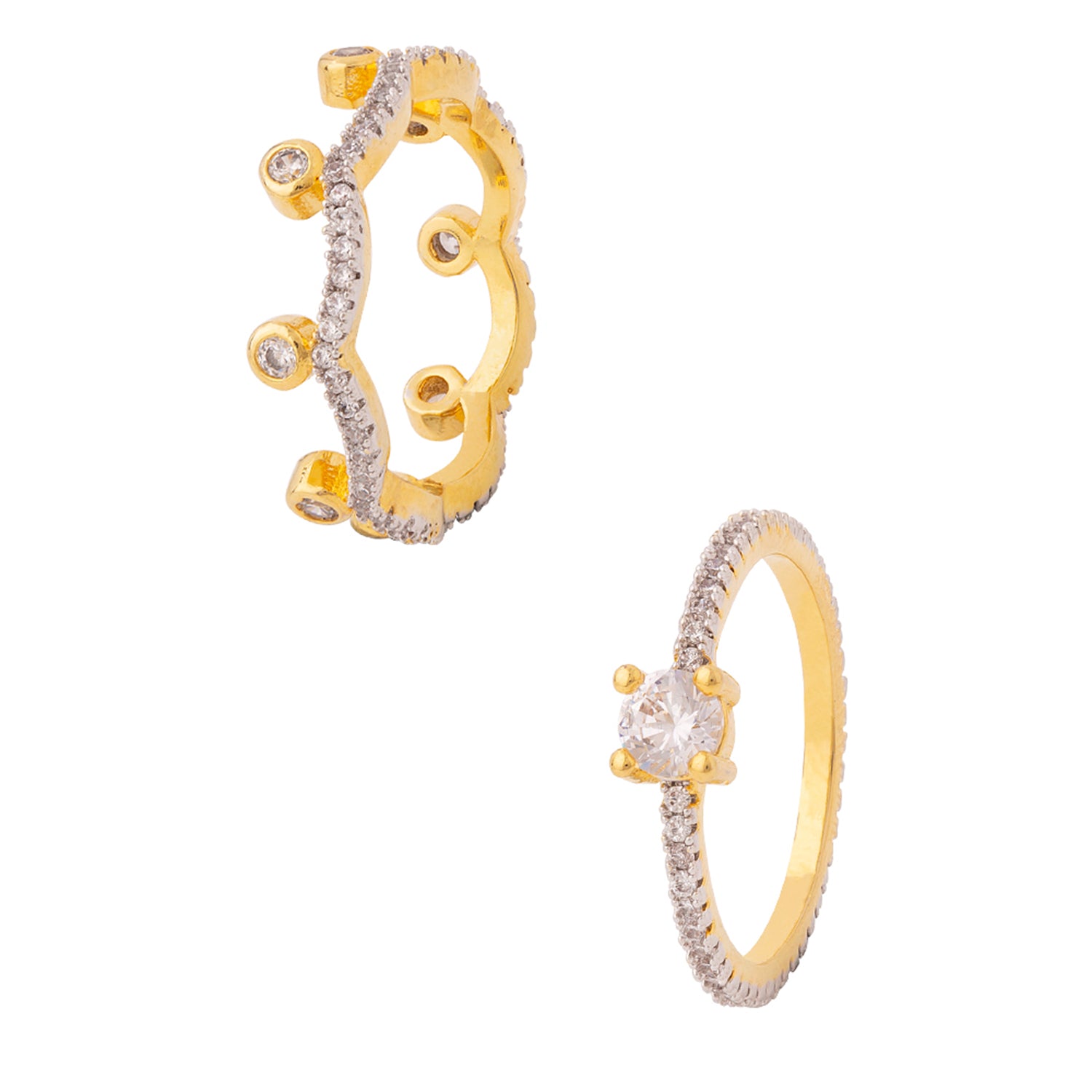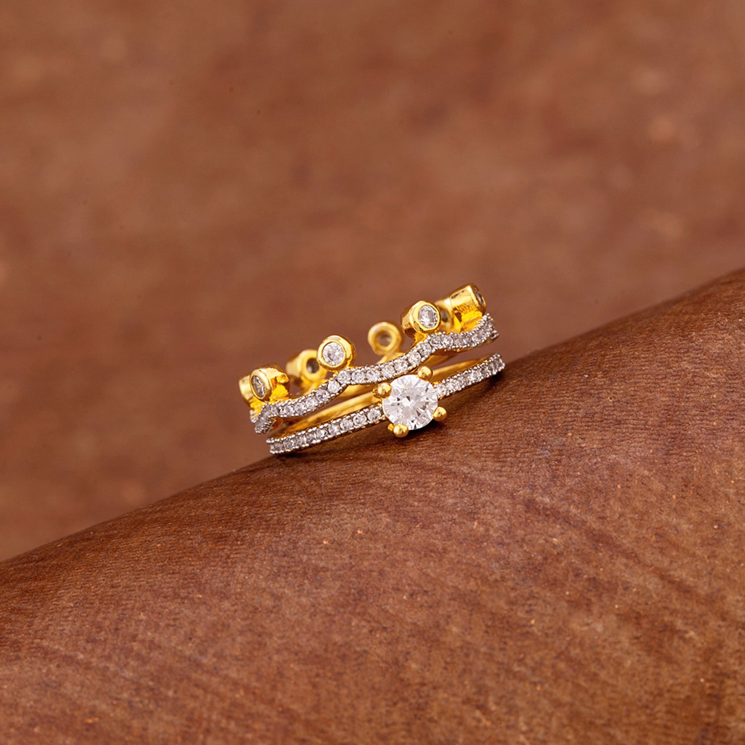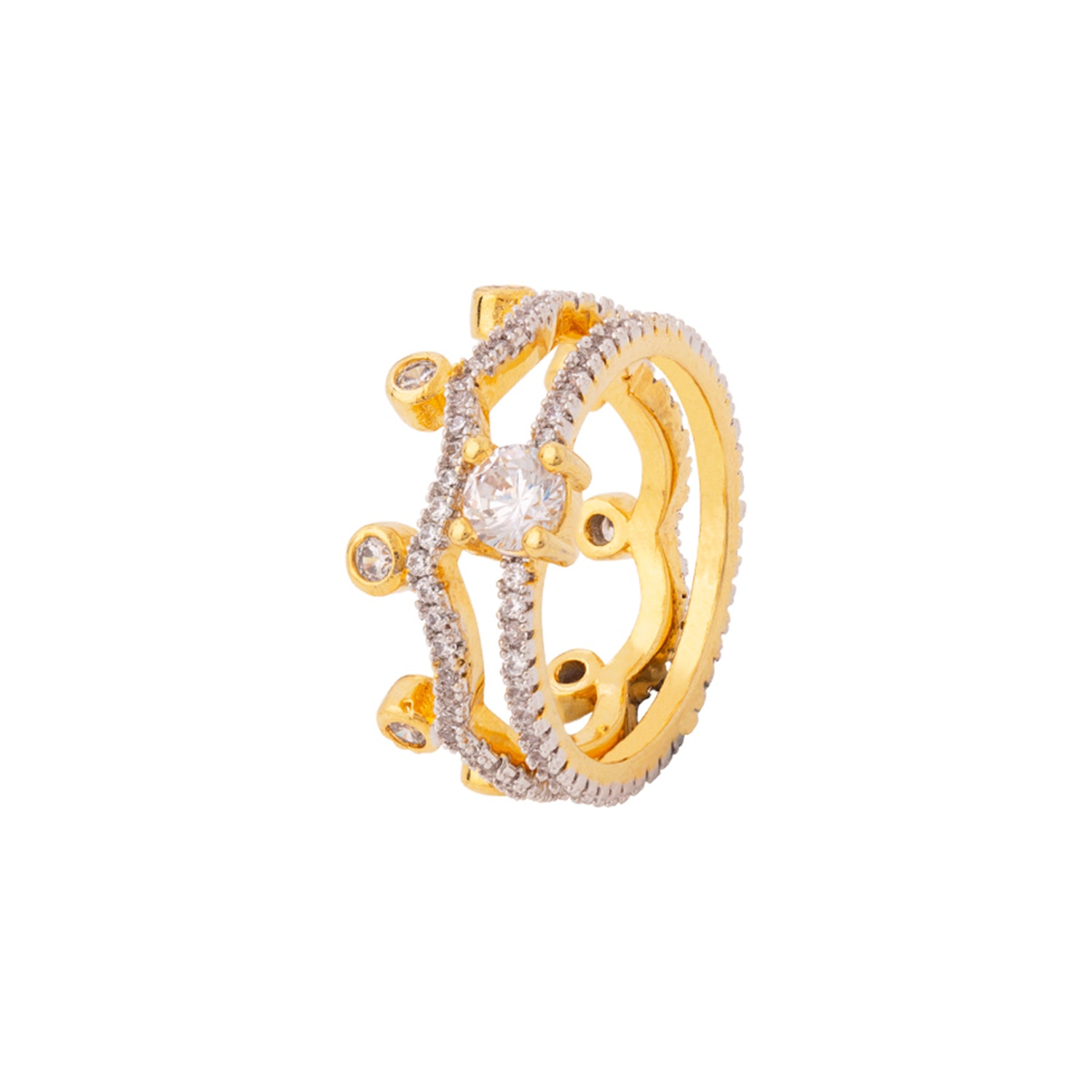 Crown ring made from brass and two tone plated. Embellished with zircon gems. Pair with a summer dress. This piece of jewelry comes with the Voylla assurance of quality and durability.