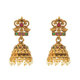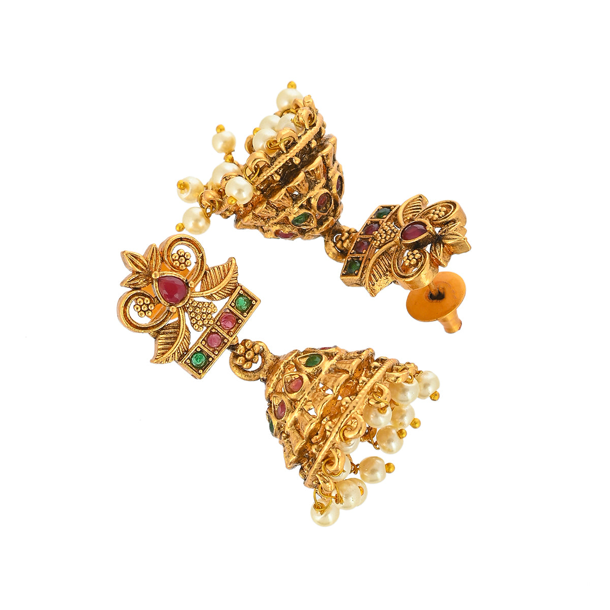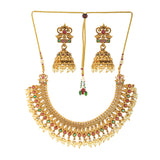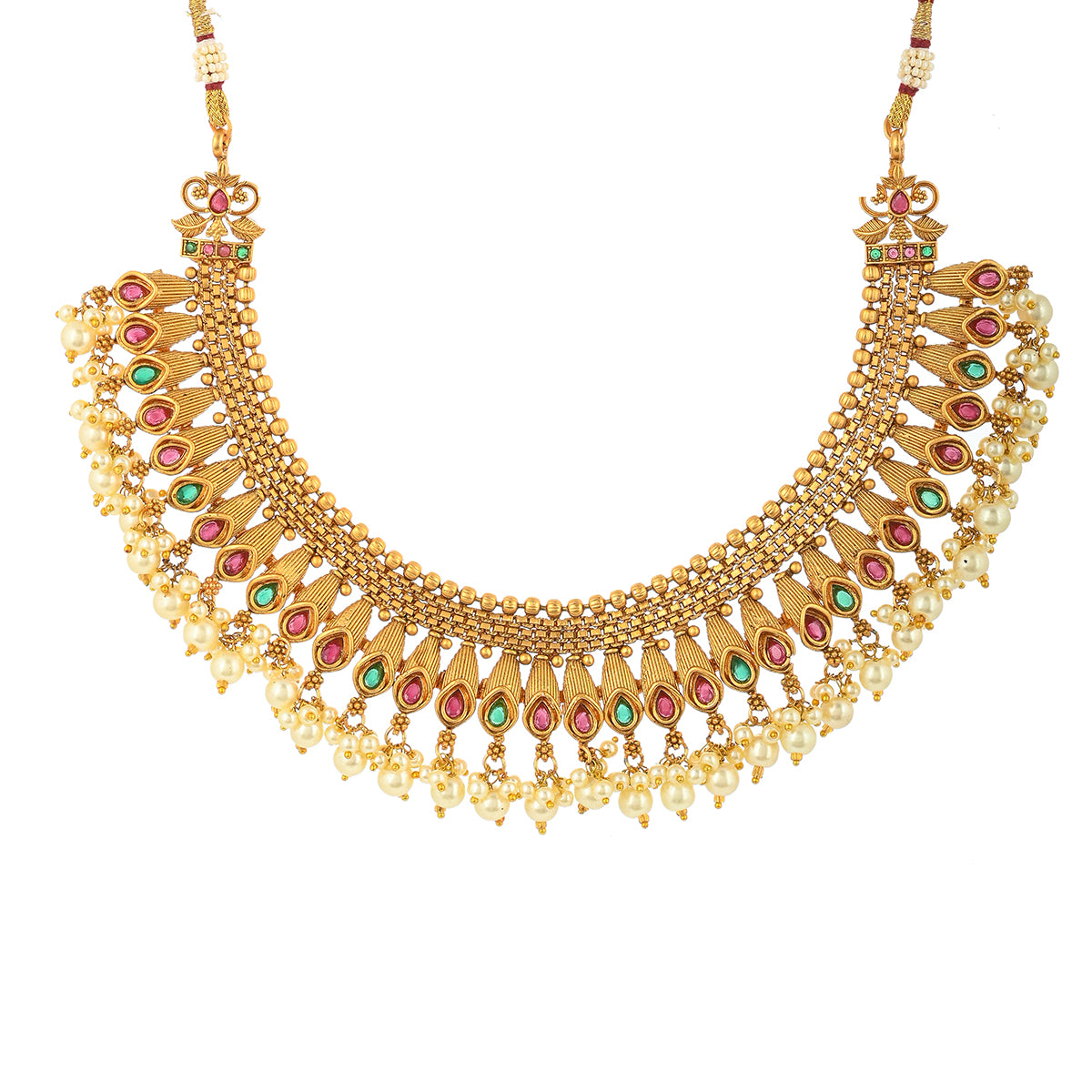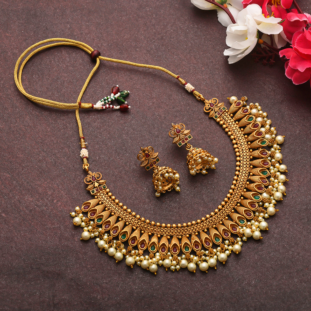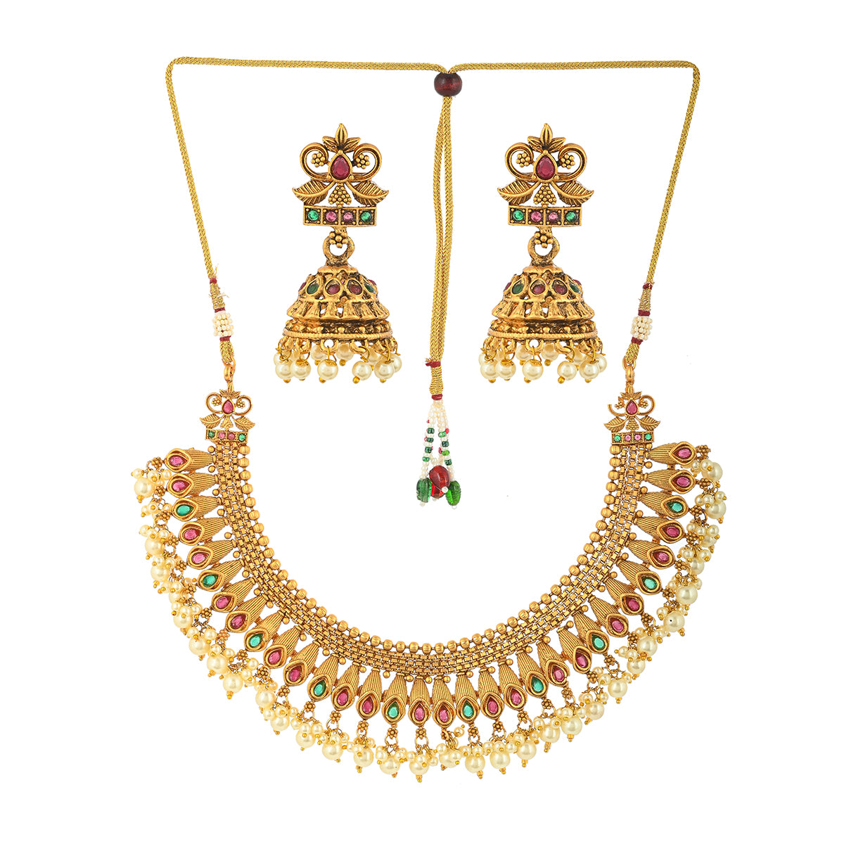 Faux pearls and zircons embellished jewellery set, fashioned from brass into an antique inspired design. The choker necklace and jhumka earrings have been given a lovely yellow gold plating that adds to their allure. Wear the set with a traditional saree or lehenga.