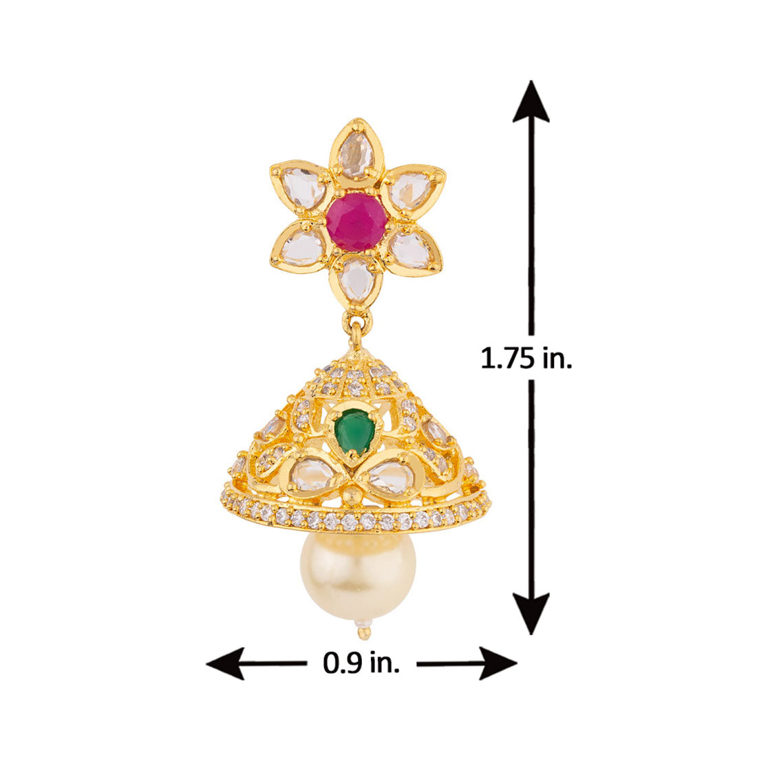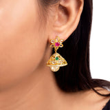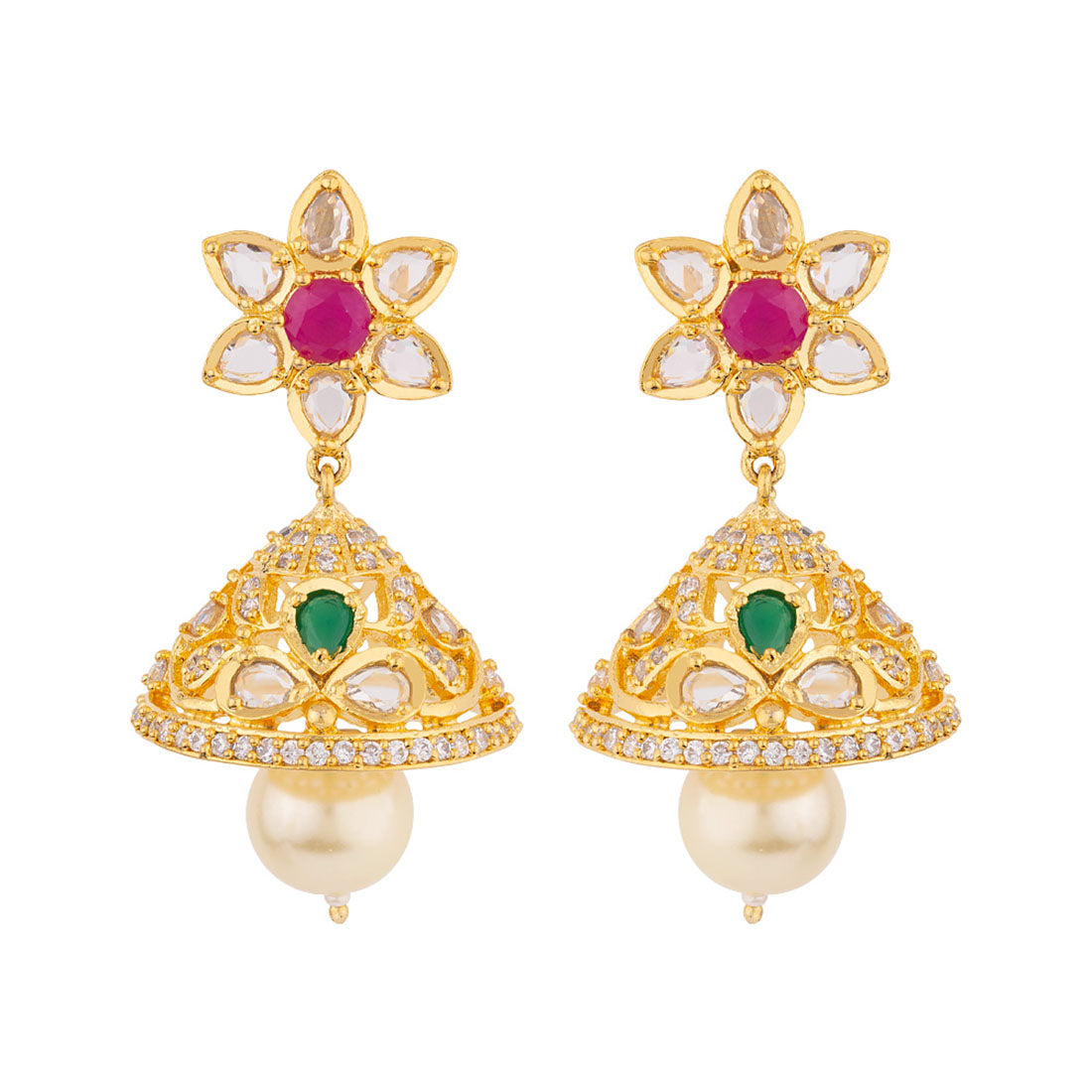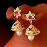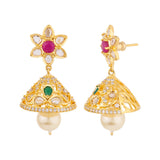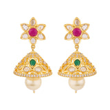 Zircon gems and floral motifs jhumka earrings fashioned out of brass. Yellow gold plated and good for ethnic looks.