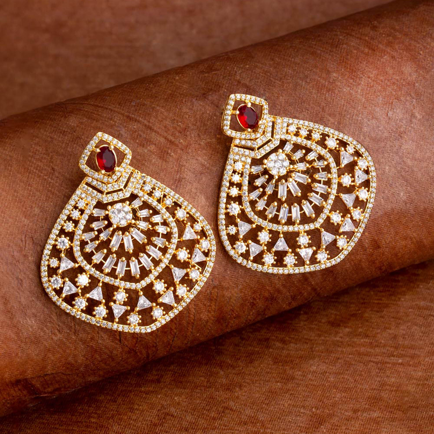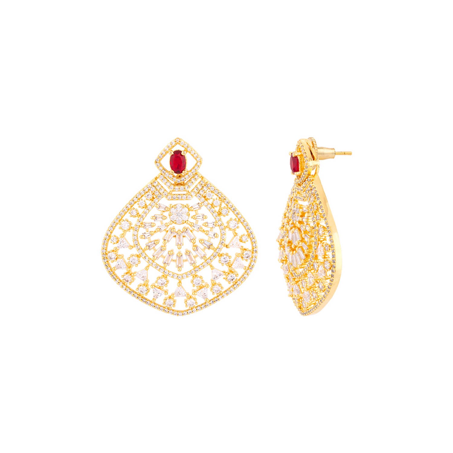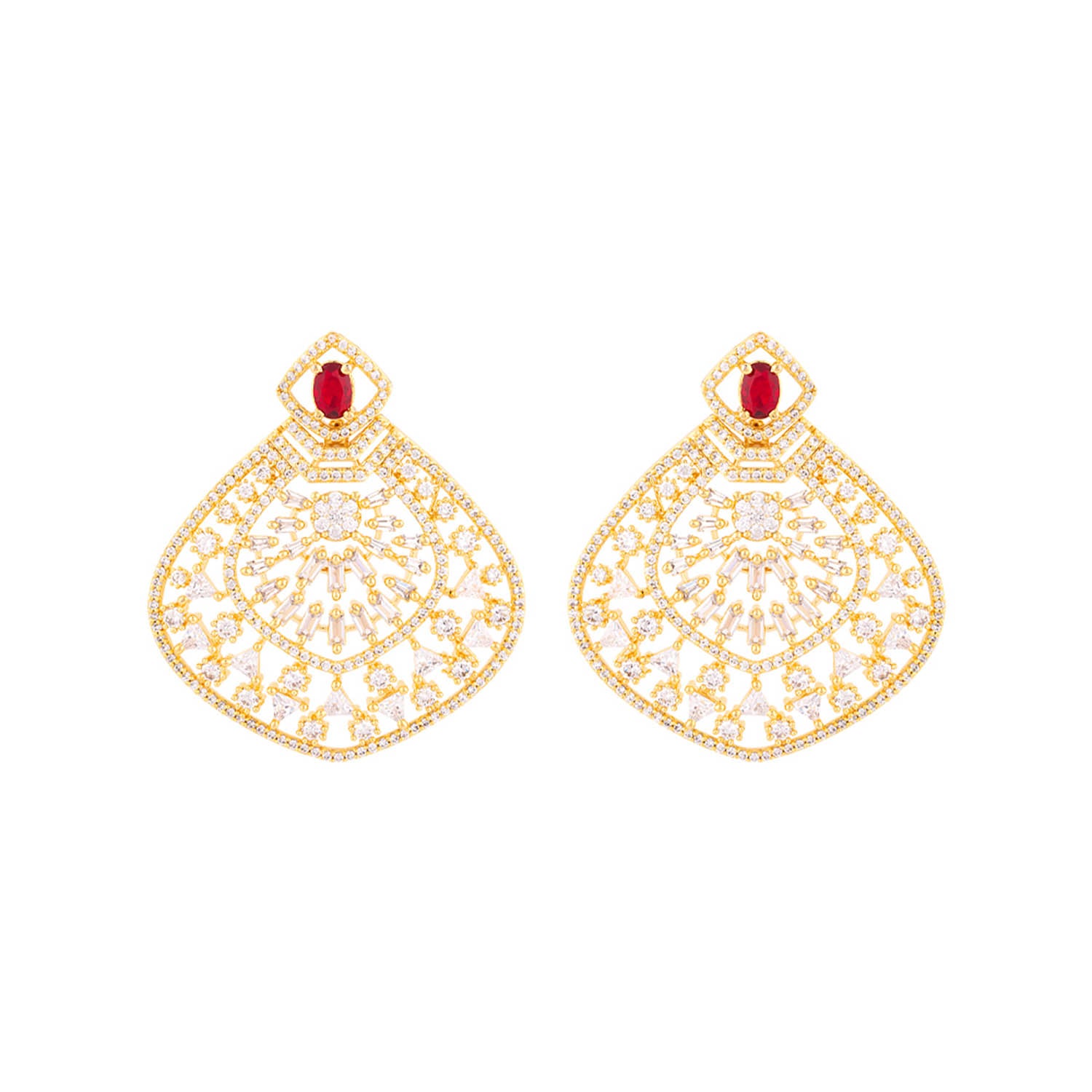 Statement earrings made from brass and yellow gold plated. Embellished with zircon gemstones. Good for formal wear.