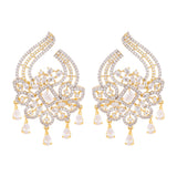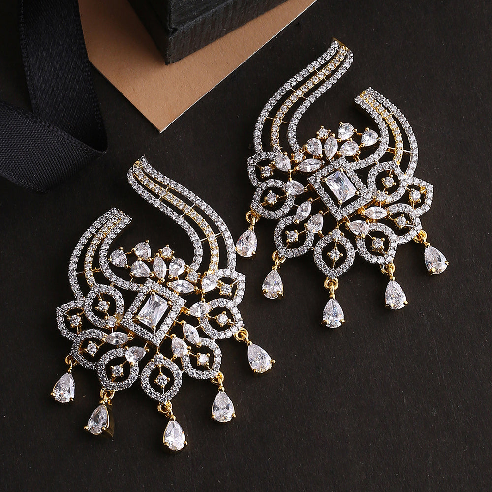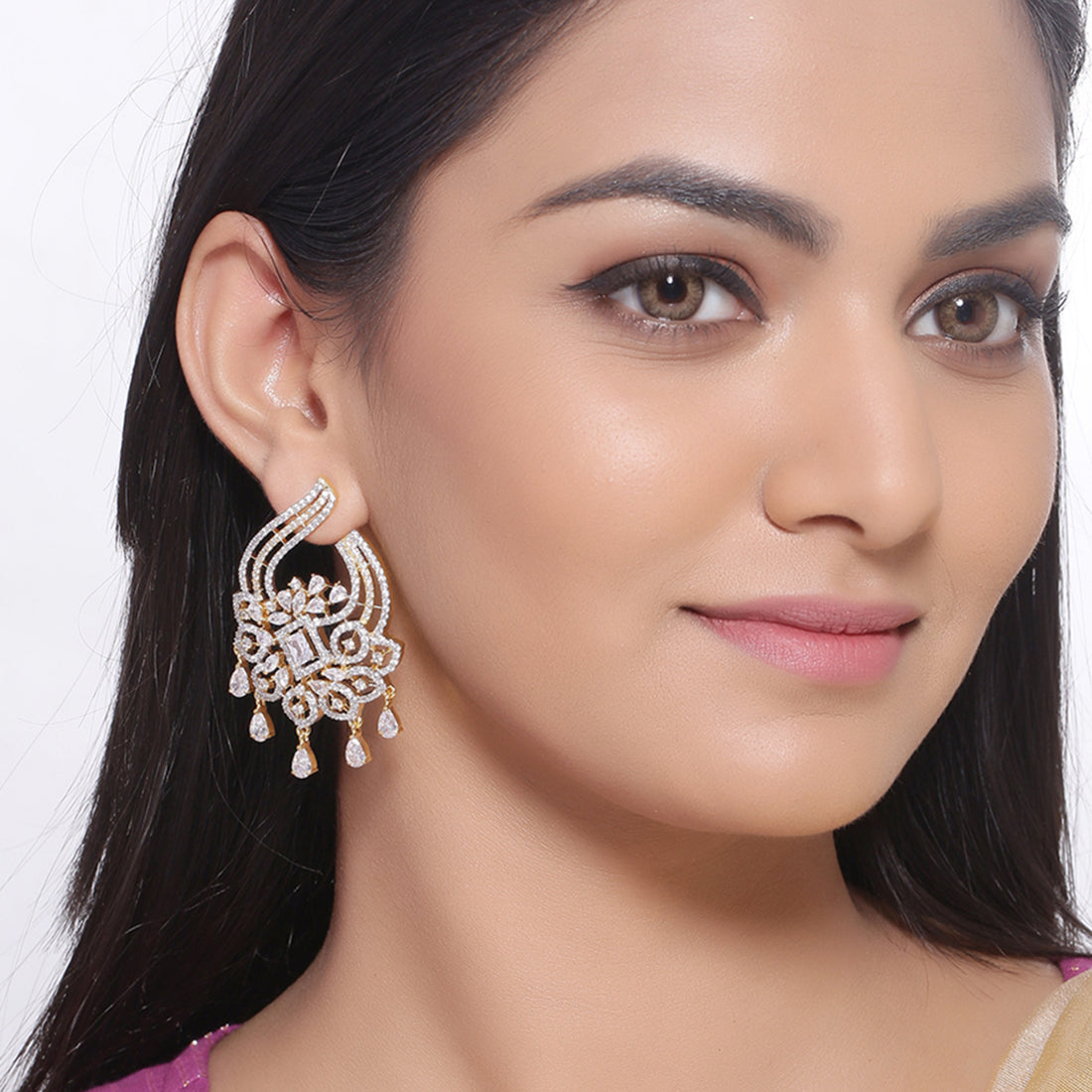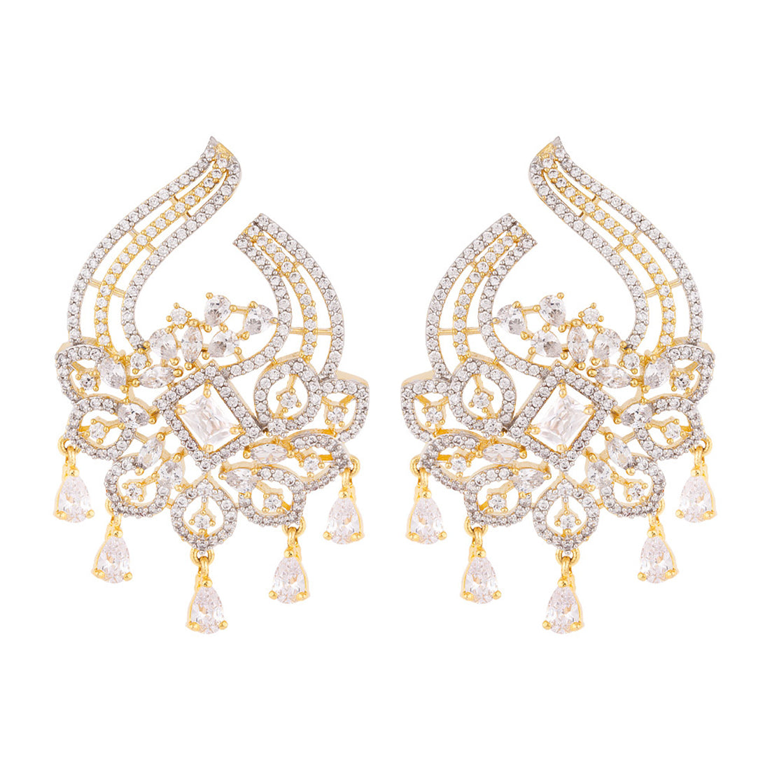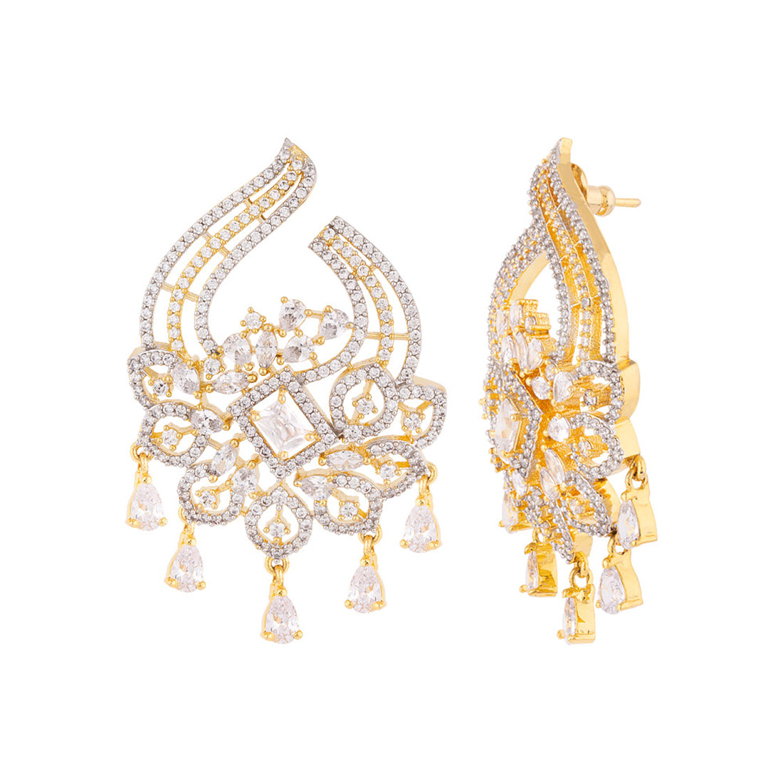 Brass earrings embellished with American Diamond gems. Two tone plated and good for formal wear. This piece of jewelry comes with the Voylla assurance of quality and durability.