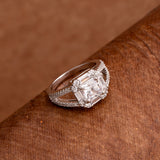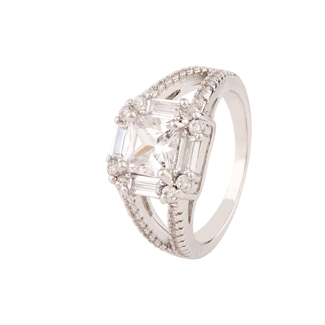 Brass ring for women with classic silver plating. Embellished with CZ gemstones. Good for everyday wear.