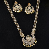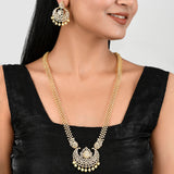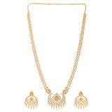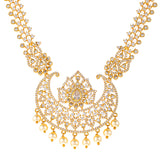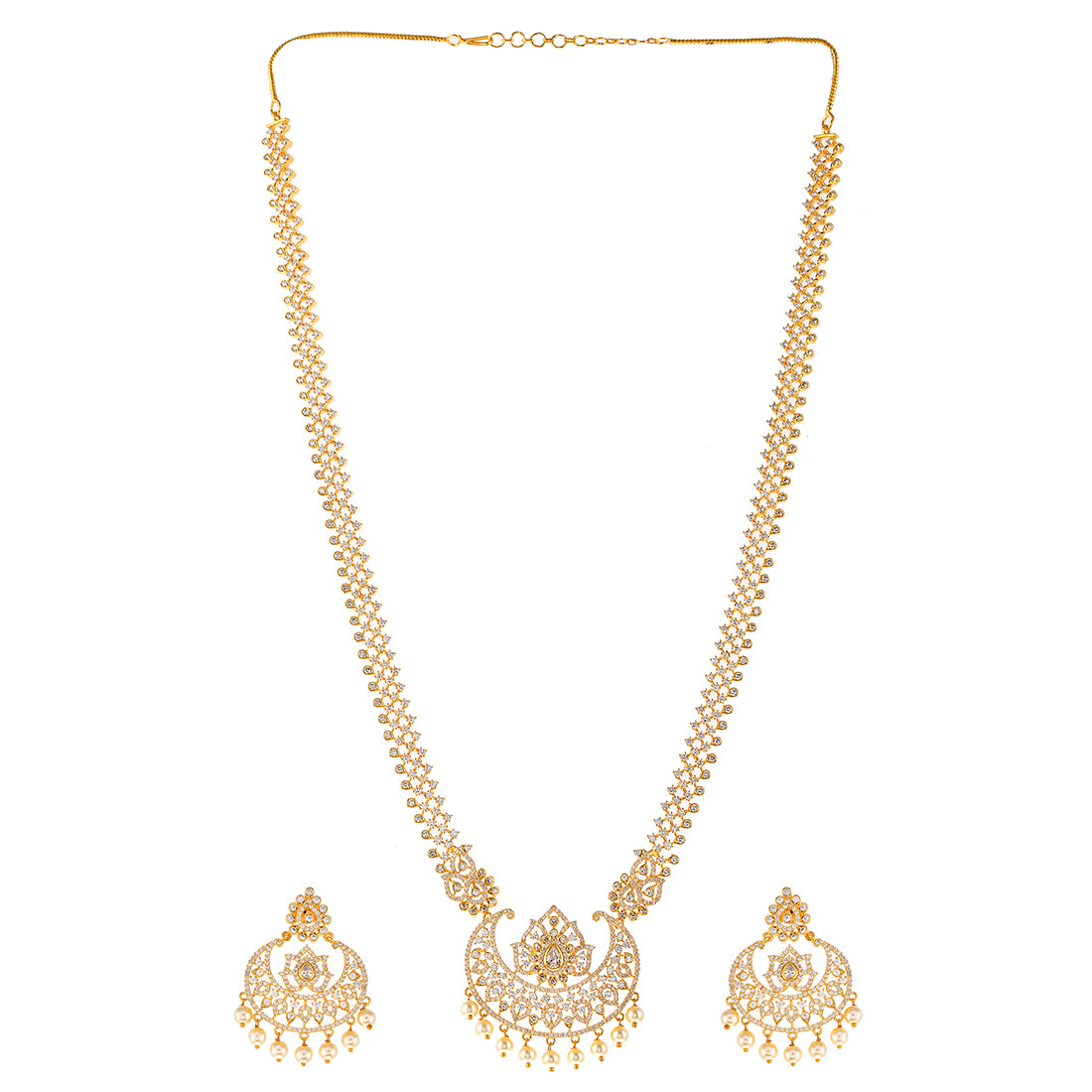 An opulent brass jewellery set with zirconia gemstones and pearl beads. Gold plated and fashioned into a classic, cutwork design, the set can be paired with formal looks of all kinds.